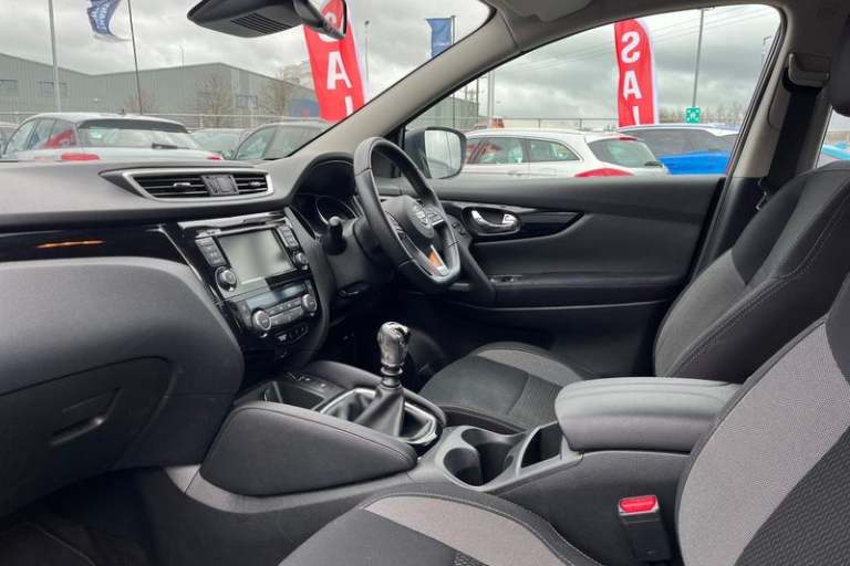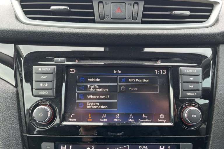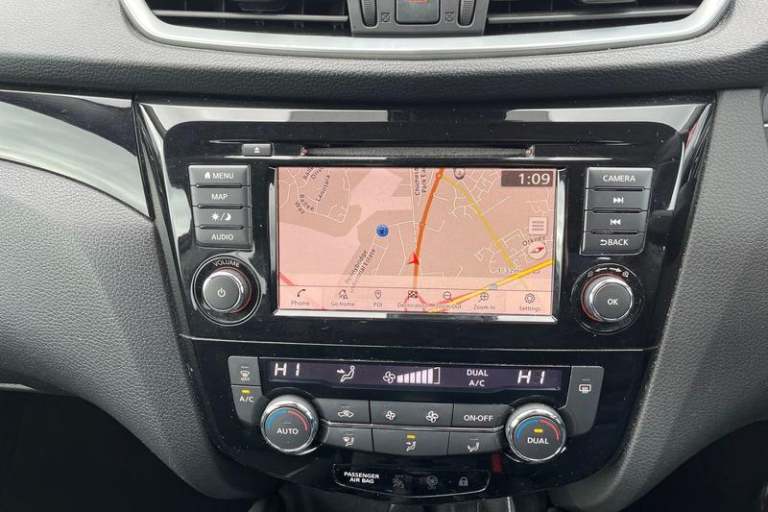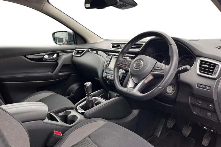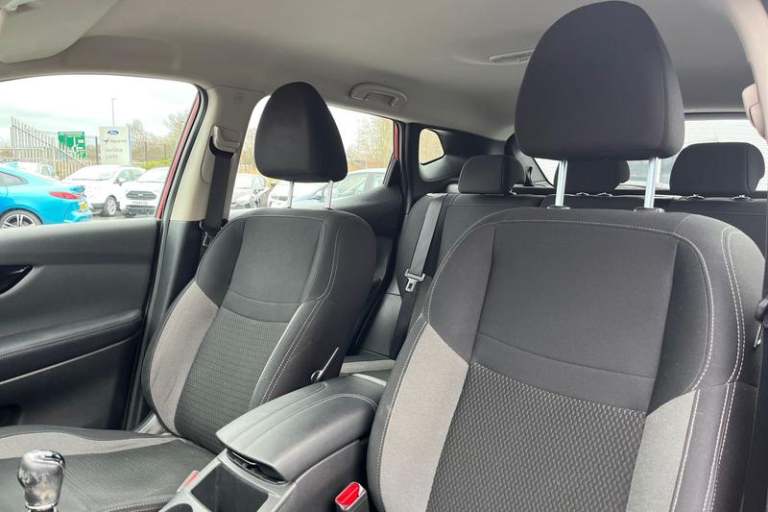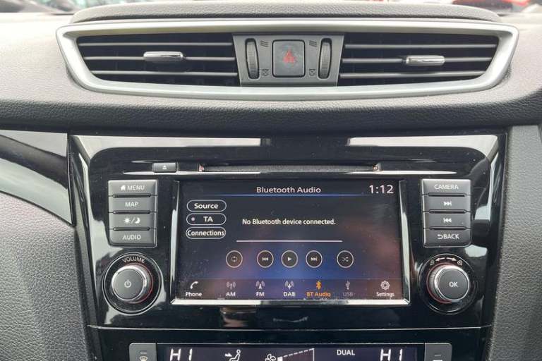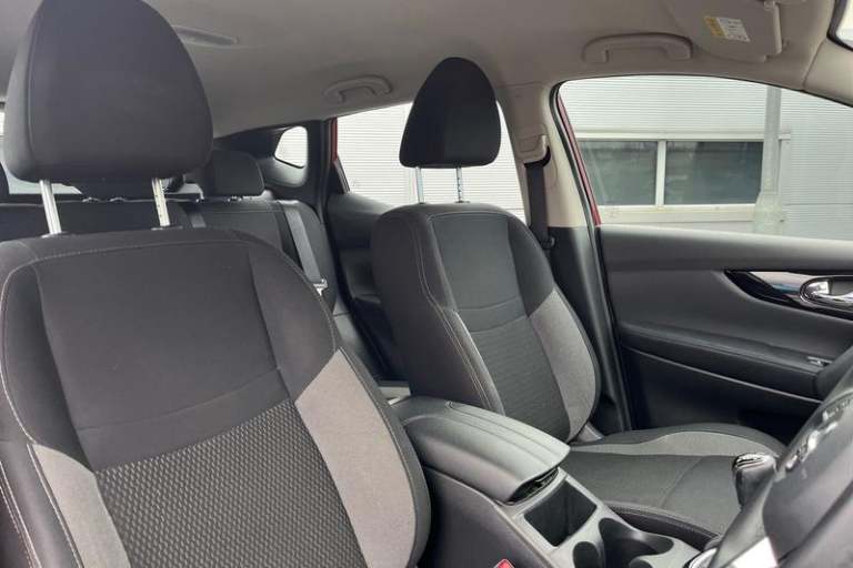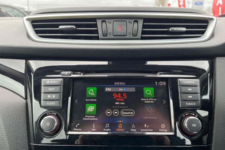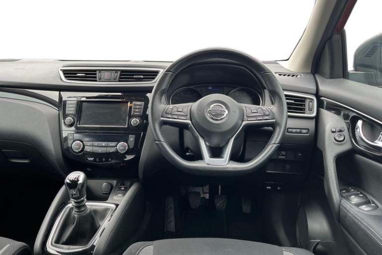 Advanced drive assist display 5'' TFT coloured screen, Apple car play/Android Auto, Bluetooth connectivity, Cruise control + speed limiter, Electric speed sensitive power steering, Front parking sensors, Idle stop/start system, Lane departure warning system, Nissan connect evo 7 touchscreen navigation and entertainment system, Normal or sport selectable steering, Outside temperature sensor, Premium Tomtom connected services, Rear parking sensors, Rear view camera, Service interval indicator, Smartphone integration, Traffic sign recognition, Trip computer, Voice control system, Anti dazzle rear view mirror, Auto wipers, Body colour bumpers, Body coloured door handles, Body coloured door mirrors, Chrome window surround, Daytime running lights dip function when turn signal applied, Electric folding door mirrors, Electric front and rear windows with one touch illuminated window controls, Electrically adjustable door mirrors, Front fog lights, Halogen headlights, Heated door mirrors, High beam assist, Intelligent auto headlights, LED indicators in door mirrors, Rear roof spoiler, Rear wiper with reverse link, Shark fin antenna, Signature LED daytime running lights, Underbody vortex generators, 2 X front 12v power sockets, 3 height adjustable rear headrests, 60/40 split folding rear seat, Ambient interior lighting, Ambient lighting around centre console, Bi-colour cloth upholstery, Boot lighting, Centre console storage box/armrest, Chrome interior door handles, Driver's seat manual