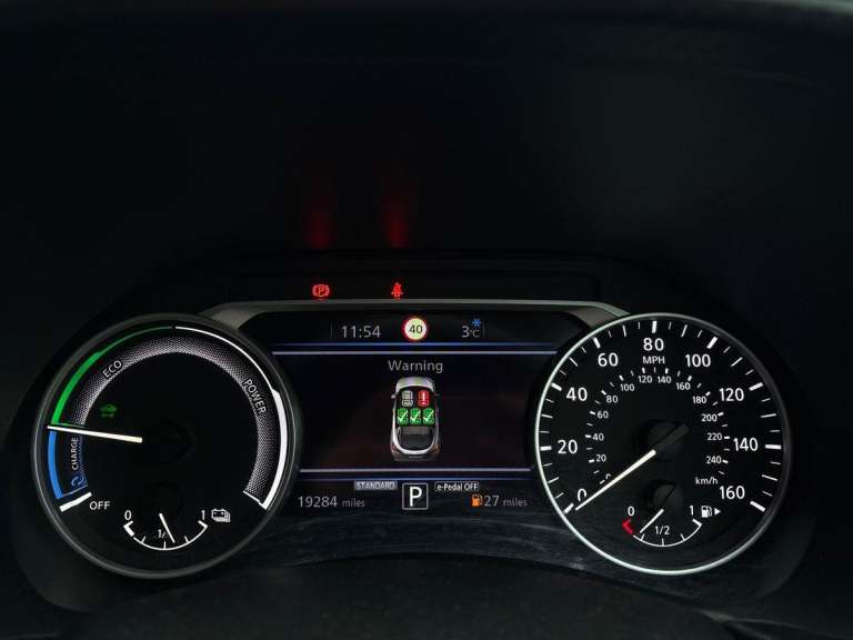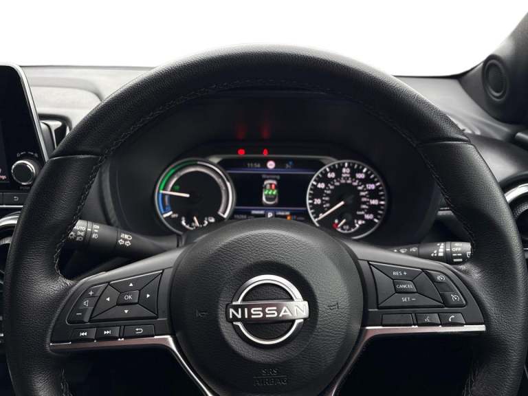 ..7'' full colour TFT screen combimeter, Apple CarPlay and Google Android auto, Cruise control + speed limiter, Drive modes select (Eco, normal and sport), e-Pedal step, Emergency and breakdown call, EV mode selector, Front parking sensor, Intelligent lane intervention, Lane departure warning system, Nissan connect 8'' touch screen entertainment system, Nissan connect nav with TomTom traffic, Nissan connect services and Wifi connection, Outside temperature sensor, Power Steering, Rear parking sensor, Traffic sign recognition, Trip computer, Voice recognition, Gasoline particulate filter, 6 speakers, Bluetooth system, USB, Aux-in and 12V socket, DAB Digital radio, Rear console USB port, Auto dimming interior rear view mirror, Auto headlights, Automatic hazard signal with emergency stop signal, Body colour bumpers, Body colour door handles, Electrically adjustable door mirrors with integrated indicators, Follow me home headlights, Front and rear electric window with one touch driver window, Heated and auto folding door mirrors, High beam assist, LED daytime running lights, LED front fog lights, LED headlamps, LED rear fog lamp, LED rear lamps, Pearl black door mirrors, Pearl black roof, Rain sensor windscreen wipers, Rear privacy glass, Rear side wing doors, Rear wiper, Shark fin roof antenna in Pearl Black, Textured stickers on door mirrors and roof, Three blink turn signal, 3 height adjustable rear headrests, 3 seat bench in 2nd row, 60/40 split folding rear seat, Automatic climate control, Card holder on driver sunvisor, Driver and passenger sliding and reclining seats, Driver side rear coat hanger, Driver/passenger sunvisors and vanity mirrors, Front and rear cabin lights, Front armrest, Front door pockets with bottle holders, Front head restraints, Front passenger isofix child seat anchorage point, Front/rear passenger grab handles, Grey synthetic leather kneepad, Height adjustable driver's seat, Internal chrome door handles, Leather gearshift knob, Leather steering wheel, Luggage board, Luggage space lighting, Monoform sporty seats, Multifunction steering wheel, Rear door bottle holders, Single front passenger seat, Steering wheel mounted gearshift paddles, Synthetic leather upholstery with light grey accents and two tone dashboard, Telescopic steering wheel adjustment, Two cupholders in front centre console, Two rear isofix child seat anchorage points with top tether, Welcome light and console tray ambient lighting, ABS with EBD and brake assist,