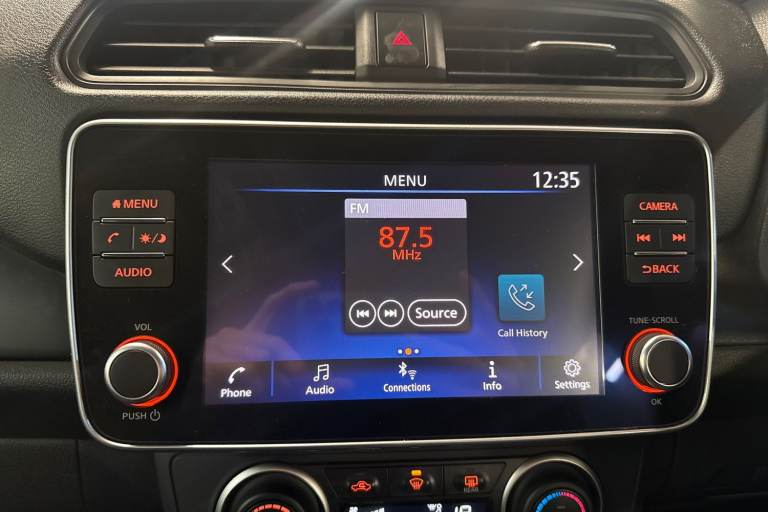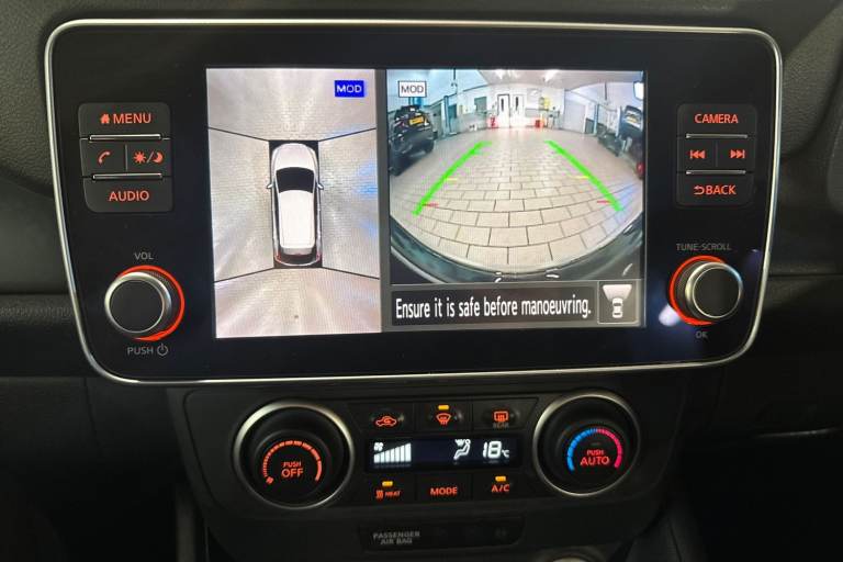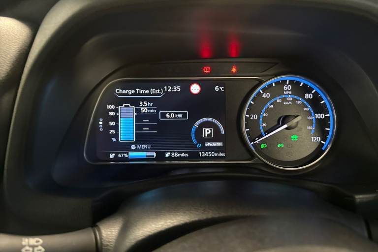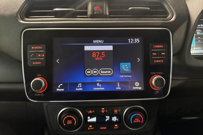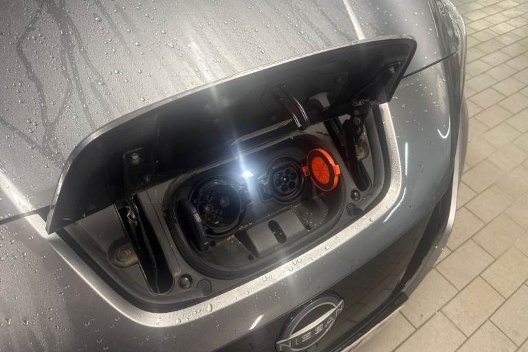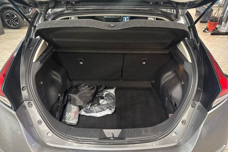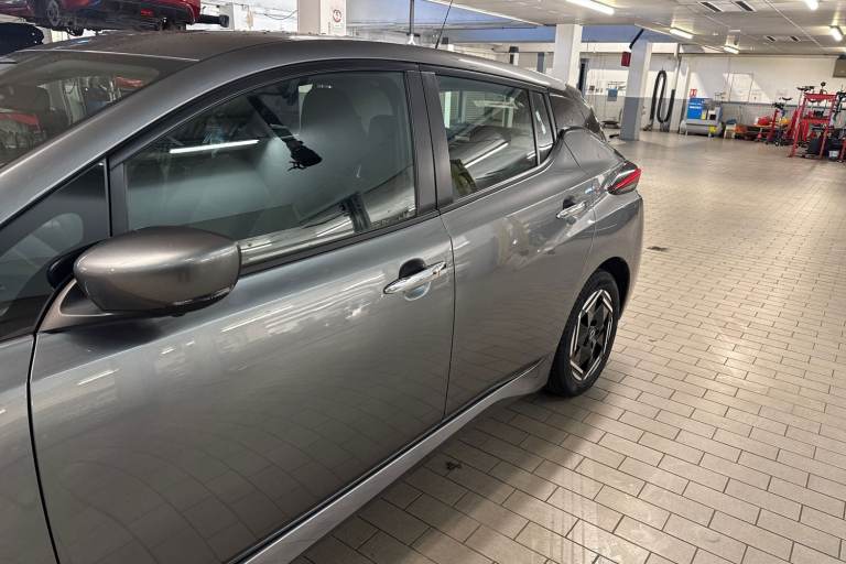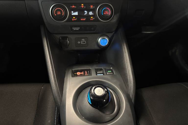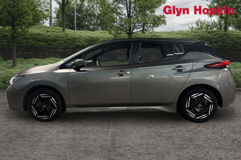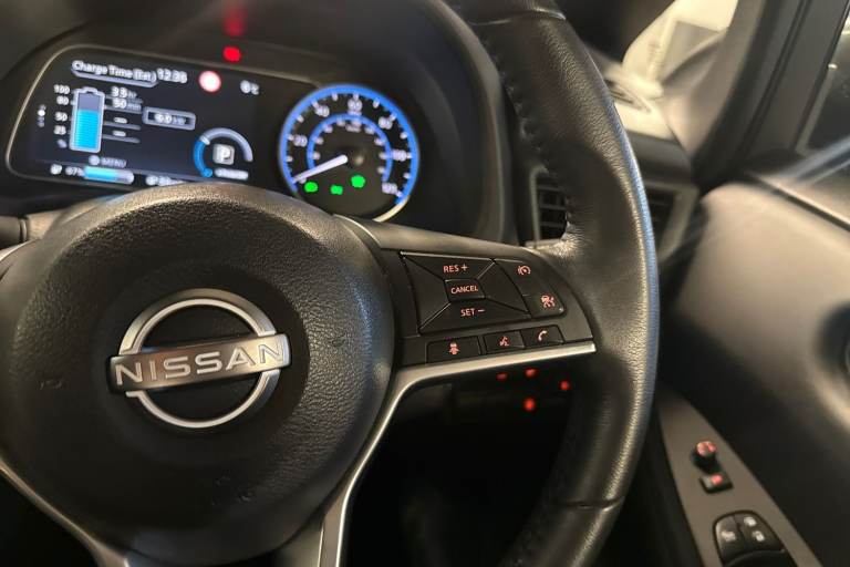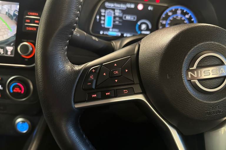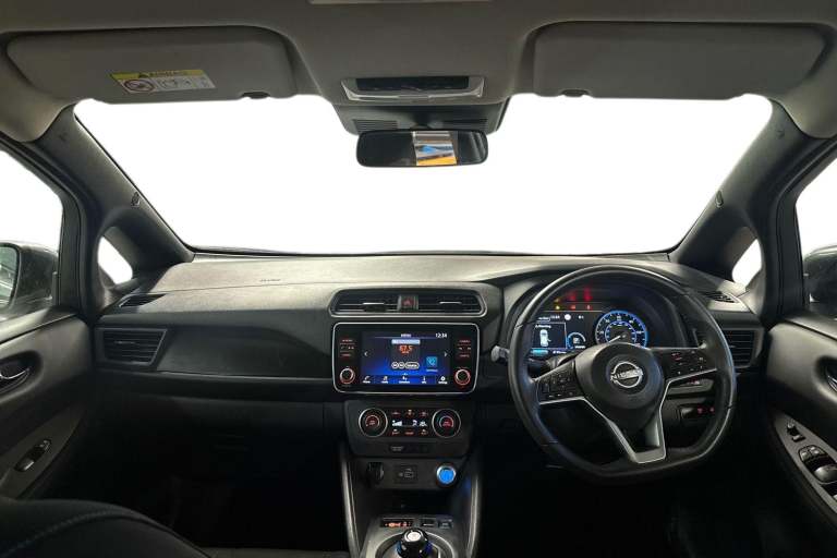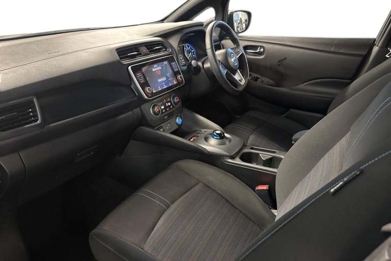 ..7'' full colour TFT screen combimeter, 8'' colour display with touchscreen, Apple car play/Android Auto, Blind spot intervention, Blind spot warning, E Pedal, eCall emergency call system, Electric power assisted steering, Intelligent Cruise control (ICC), Intelligent lane intervention, Lane departure warning system, Rear cross traffic alert, Rear view camera, Speed limiter, Trip computer, 39kWh usable battery capacity, 6.6 kw On-board charger, Charging port remote opening, Mac Pherson strut front suspension and twist beam axle rear suspension, Max DC charging power, ChaDeMo type: up to 50kW, Single motor, 6 speakers, Audio system with USB, Bluetooth with audio streaming, DAB Digital radio, Rear USB ports, Aero roof spoiler, Automatic activation of hazard warning lights, Automatic rain sensing wipers, Body coloured door mirrors with integrated LED turn signals, Chrome door handles, Electric front/rear windows, Follow me home headlights, Front fog lights, Grey rear bumper finisher, Halogen headlamps, High beam assist, Illuminated charge port, Intelligent auto headlights, LED signature daytime running lights with directional indicator, LED signature rear lights, LED third brake light, Manual folding door mirrors, Rain sensor, Rear side wing doors, Rear wiper, 12V socket, 3 seat bench in 2nd row, 60/40 split folding rear seat, Automatic climate control with pollen filter and timer, Front centre console and armrest, Front head restraints, Front seatback pockets, Height adjustable driver seat, Isofix child seat anchor points, Manual adjust driver/passenger seats, Multifunction leather steering wheel, PTC (Positive Temp Co-efficent) heater, Rake and reach adjustable steering column, Rear assist grips, Rear head restraints, Single front passenger seat, Telescopic steering wheel adjustment, Woven fabric upholstery, 3 point front seatbelts with pre-tensioners, 3x3 point rear seatbelts, ABS with EBD and brake assist, Curtain airbags, Driver and passenger airbags, Electrically driven intelligent braking system, Electronic Stability Programme (ESP), Front and rear vented brake discs, Front seatbelt pretensioners + load limiters, Height adjustable front seatbelts, Hill start assist, Intelligent emergency braking with pedestrian recognition, Intelligent ride control, Intelligent trace control, Manual child proof rear door locks, Mechanical parking brake, Nissan safety shield, Seatbelt reminder for driver and front passenger, Side airbags, Traction control, Tyre