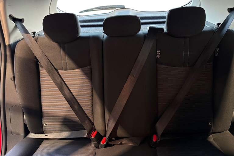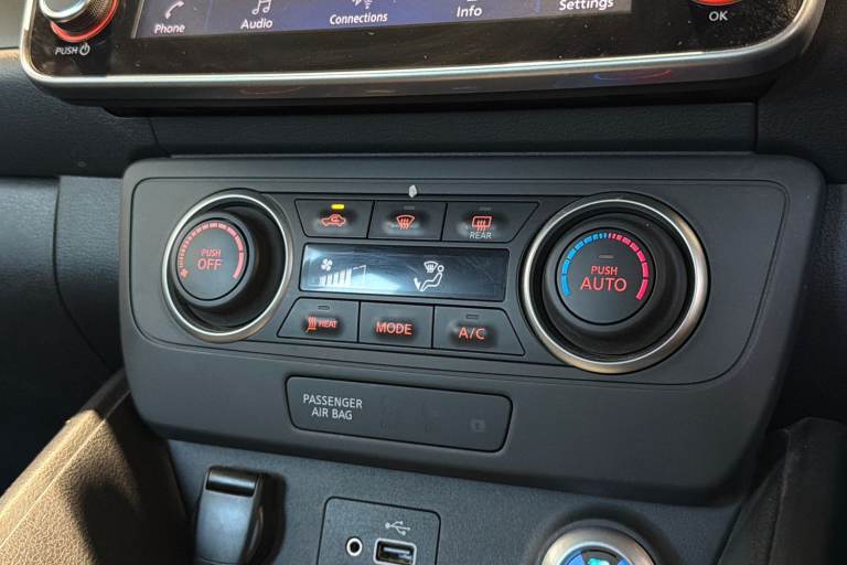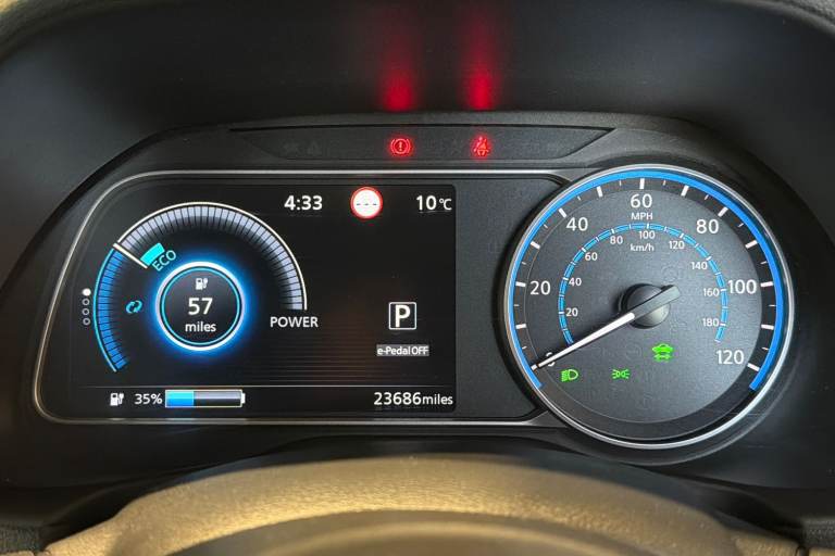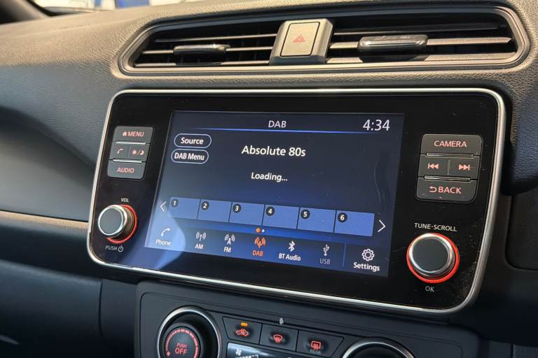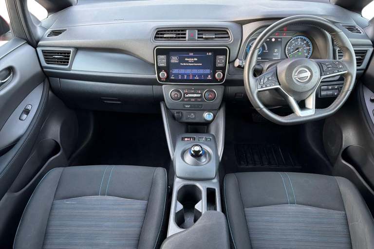 ..7'' full colour TFT screen combimeter, 8'' colour display with touchscreen, Apple car play/Android Auto, Blind spot intervention, Blind spot warning, E Pedal, eCall emergency call system, Electric power assisted steering, Intelligent Cruise control (ICC), Intelligent lane intervention, Lane departure warning system, Rear cross traffic alert, Rear view camera, Speed limiter, Trip computer, 39kWh usable battery capacity, 6.6 kw On-board charger, Charging port remote opening, Mac Pherson strut front suspension and twist beam axle rear suspension, Max DC charging power, ChaDeMo type: up to 50kW, Single motor, 6 speakers, Audio system with USB, Bluetooth with audio streaming, DAB Digital radio, Rear USB ports, Aero roof spoiler, Automatic activation of hazard warning lights, Automatic rain sensing wipers, Body coloured door mirrors with integrated LED turn signals, Chrome door handles, Electric front/rear windows, Follow me home headlights, Front fog lights, Grey rear bumper finisher, Halogen headlamps, High beam assist, Illuminated charge port, Intelligent auto headlights, LED signature daytime running lights with directional indicator, LED signature rear lights, LED third brake light, Manual folding door mirrors, Rain sensor, Rear side wing doors, Rear wiper, 12V socket, 3 seat bench in 2nd row, 60/40 split folding rear seat, Automatic climate control with pollen filter and timer, Front centre console and armrest, Front head restraints, Front seatback pockets, Height adjustable driver seat, Isofix child seat anchor points, Manual adjust driver/passenger seats, Multifunction leather steering wheel, PTC (Positive Temp Co-efficent) heater, Rake and reach adjustable steering column, Rear assist grips, Rear head restraints, Single front passenger seat, Telescopic steering wheel adjustment, Woven fabric upholstery, 3 point front seatbelts with pre-tensioners, 3x3 point rear seatbelts, ABS with EBD and brake assist, Curtain airbags, Driver and passenger airbags, Electrically driven intelligent braking system, Electronic Stability Programme (ESP), Front and rear vented brake discs, Front seatbelt pretensioners + load limiters, Height adjustable front seatbelts, Hill start assist, Intelligent emergency braking with pedestrian recognition, Intelligent ride control, Intelligent trace control, Manual child proof rear door locks, Mechanical parking brake, Nissan safety shield, Seatbelt reminder for driver and front passenger, Side airbags, Traction control, Tyre