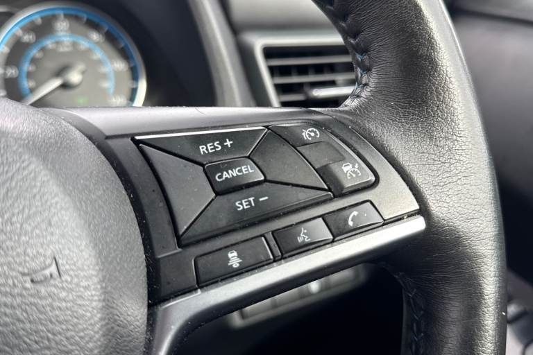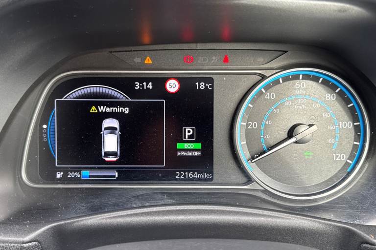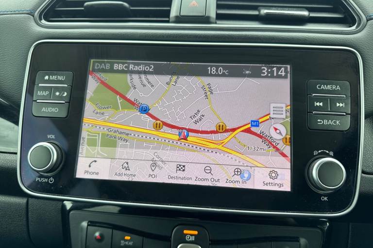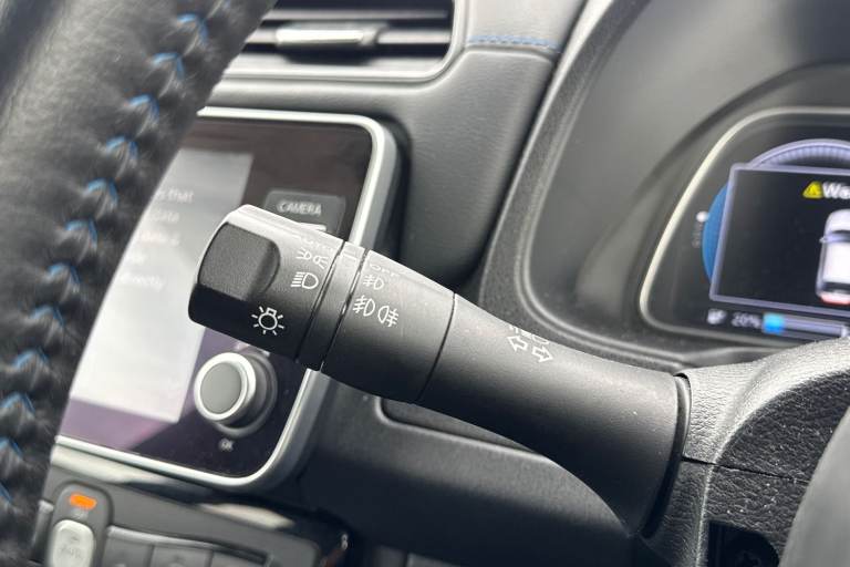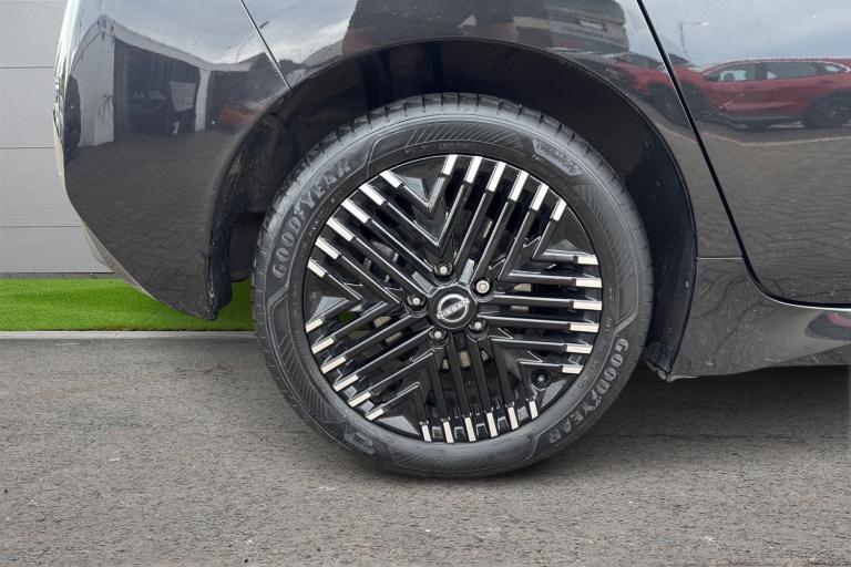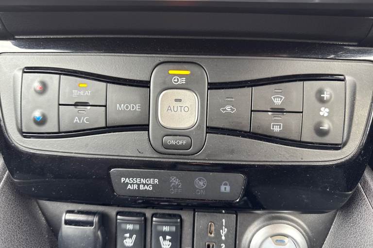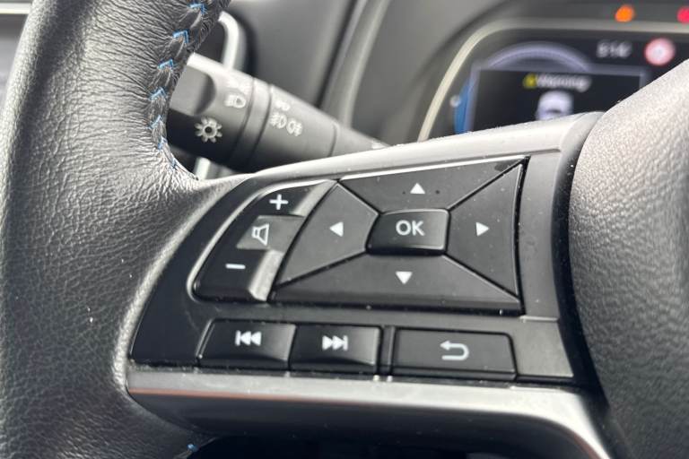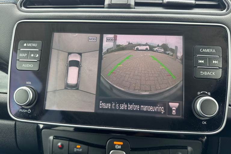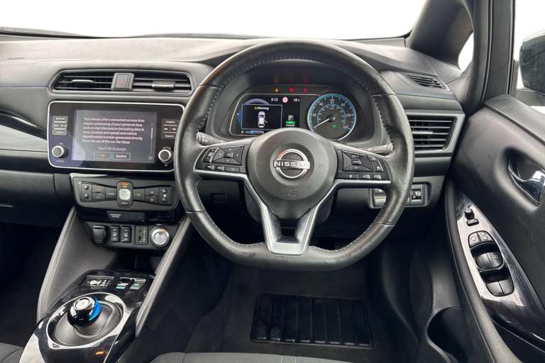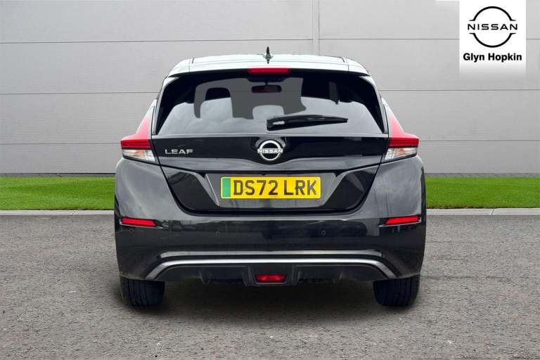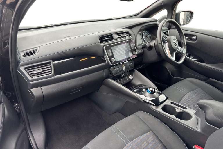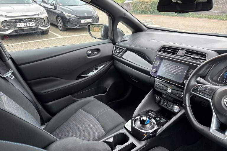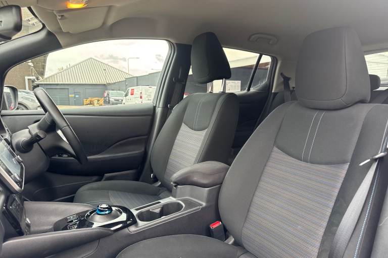 ..360 degree colour camera view, 7'' full colour TFT screen combimeter, 8'' colour display with touchscreen, Apple car play/Android Auto, Blind spot intervention, Blind spot warning, E Pedal, eCall emergency call system, Electric power assisted steering, EV telematics system, Front and rear parking sensors, Intelligent around view monitor, Intelligent Cruise control (ICC), Intelligent driver alert system, Intelligent lane intervention, Lane departure warning system, Moving object detection, Navigation system with voice control, Nissan connect services app (air conditioning control, cabin heating and charging), Rear cross traffic alert, Speed limiter, Trip computer, 39kWh usable battery capacity, 6.6 kw On-board charger, Charging port remote opening, Mac Pherson strut front suspension and twist beam axle rear suspension, Max DC charging power, ChaDeMo type: up to 50kW, Single motor, 6 speakers, Audio system with USB, Bluetooth with audio streaming, DAB Digital radio, Rear USB ports, Aero roof spoiler, Auto dimming rear view mirror, Automatic activation of hazard warning lights, Automatic rain sensing wipers, Chrome door handles, Electric front/rear windows, Electrically adjustable and folding door mirrors, Follow me home headlights, Grey rear bumper finisher, High beam assist, Illuminated charge port, Intelligent auto headlights, LED signature daytime running lights with directional indicator, LED signature rear lights, LED third brake light, Rain sensor, Rear privacy glass, Rear side wing doors, Rear wiper, Shark fin antenna, 12V socket, 3 seat bench in 2nd row, 60/40 split folding rear seat, Automatic climate control with pollen filter and timer, Energy saving cabin heating system with heat pump, Front centre console and armrest, Front head restraints, Front seatback pockets, Height adjustable driver seat, Isofix child seat anchor points, Manual adjust driver/passenger seats, Multifunction leather steering wheel, PTC (Positive Temp Co-efficent) heater, Rake and reach adjustable steering column, Rear assist grips, Rear head restraints, Single front passenger seat, Telescopic steering wheel adjustment, Woven fabric upholstery, Heat pack with Heated front seats - Leaf, 3 point front seatbelts with pre-tensioners, 3x3 point rear seatbelts, ABS with EBD and brake assist, Curtain airbags, Driver and passenger airbags, Electrically driven intelligent braking system, Electronic Stability Programme (ESP), Front and rear vented brake discs, Front seatbelt