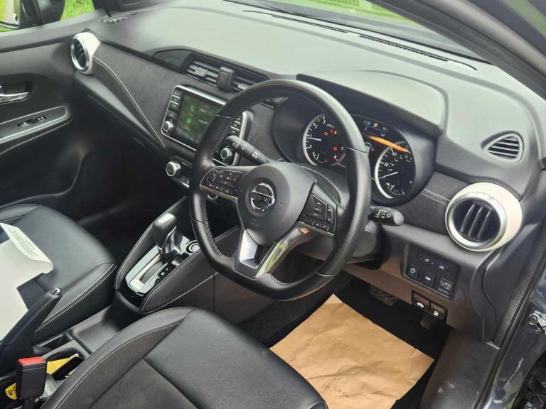 Crash sensor, Driver/Front Passenger airbags, Front and rear curtain airbags, Front side airbags, Height adjustable front seatbelts with pre-tensioners and load limiters, Passenger airbag deactivation system, Rear seatbelts with pre-tensioners and load limiters, Seatbelt warning, Three 3 point rear seatbelts, Tyre pressure monitoring system, Warning triangle and first aid kit, Anti-theft immobiliser, Intelligent key with push button ignition, Remote central locking, Anti-lock Brake System + Electronic Brakeforce Distribution + Brake assist, Hill start assist, Intelligent emergency braking with pedestrian recognition, Black door mirrors, Electric folding door mirrors, Heated door mirrors, Power front windows, Rain sensor windscreen wipers, Rear privacy glass, Rear wiper with reverse link, Antenna, Body colour front door handles, Body coloured bumpers, Concealed rear door handles, Jacknife key type x1, Rear roof spoiler, Solid paint, 4 pocket halogen headlights with signature finisher, Automatic activation of hazard warning lights, Automatic headlights, Front fog lights, High beam assist, High mounted stop lamp, LED daytime running lights, LED Headlights, 2 height adjustable rear headrests, 60/40 split folding rear seat, Driver's seat manual height adjustment, Height adjustable front headrests with satin sliver decoration, Isofix front passenger and rear seat preparation, Passenger seat back pocket, Reclining front seats, Boot light, Illuminated electric window switch, Map reading lamp, Driver/passenger sunvisors and vanity mirrors, 12V power point front, 3 cupholders, Boot compartment cover, Chrome interior door handles, Front and rear door pockets with bottle holders, Front console storage box, Gear shift indicator, Grey PVC front door pads, Leather/Alcantara upholstery, Parcel shelf, Satin silver accents on steering wheel, Satin silver air vents, Silver gearknob, Soft touch upper IP with grey PC Insert, Automatic air conditioning, Stop/start system, Adjustable speed limiter, Cruise control, Lane departure prevention, Lane departure warning system, Power assist steering, Rear parking sensors, Rear view camera, Traffic sign recognition, Nissan connect display audio, Outside temperature gauge, Smartphone integration with Apple CarPlay and Android auto, Trip computer, Bluetooth system, 4 speakers, Audio system with MP3, DAB Digital radio, USB/iPod connection, 17" Alloy wheels, Tyre repair kit