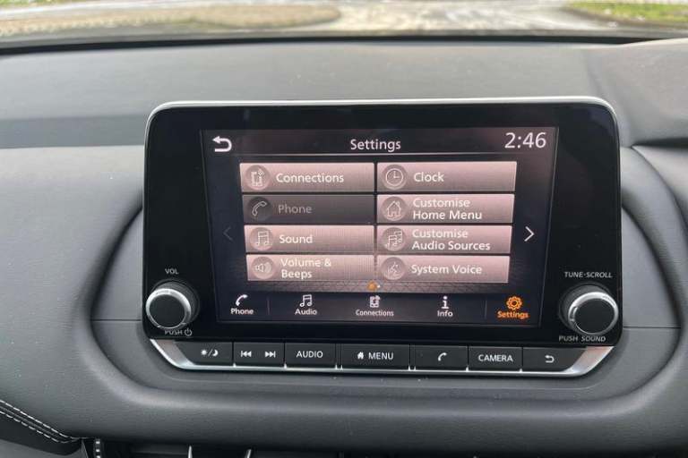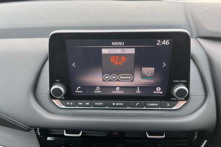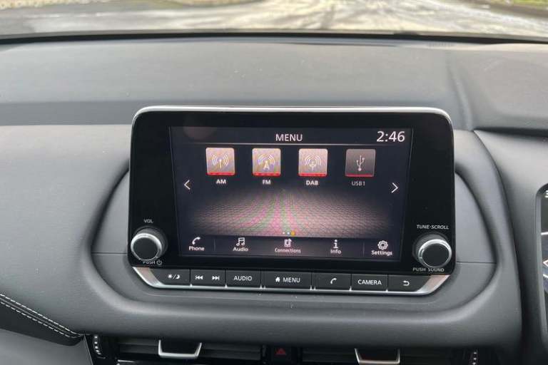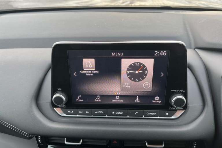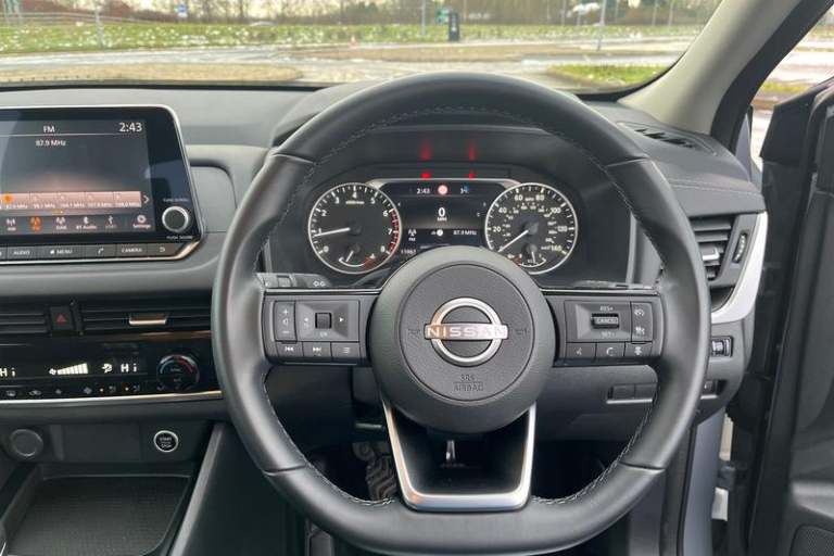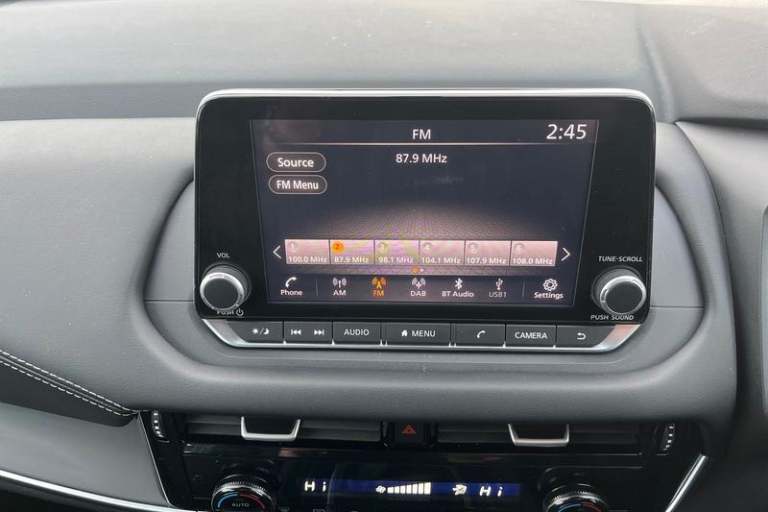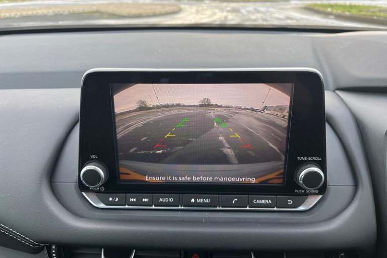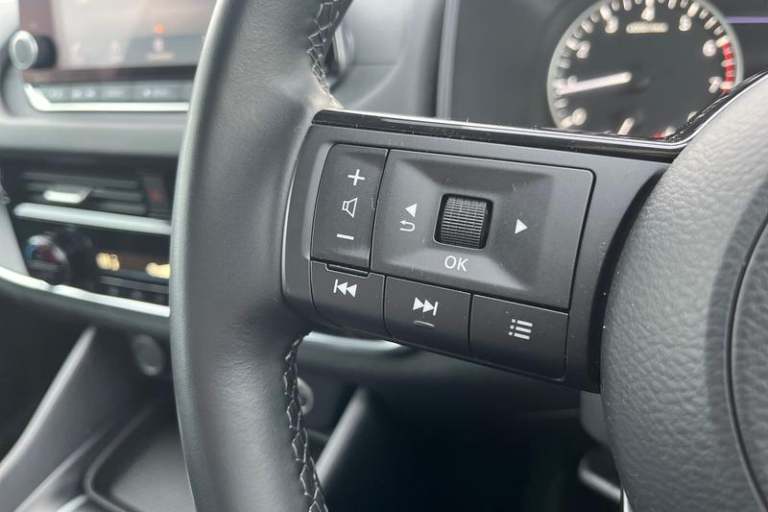 7 High definition full colour TFT screen combimeter, Android auto/Apple CarPlay (Wired), Blind spot warning, Drive modes (sport, normal, eco), Electric speed sensitive power steering, Emergency and breakdown call, Idle stop/start system, Intelligent Cruise control (ICC), Intelligent driver alert system, Intelligent forward collision warning, Intelligent lane intervention, Lane departure prevention, Lane departure warning system, Maximum speed limiter, Nissan connect 8 touchscreen infotainment system, Push button starter, Rear cross traffic alert, Rear parking sensors, Rear view camera, Traffic sign recognition with legal speed adjustment, Trip computer, Auto dimming rear view mirror, Auto rear wiper when reversing, Automatic hazard signal with emergency stop signal, Body colour mirror caps, Body coloured door handles, Bodyside mouldings, Chrome side window finisher, Door handle with button, Electric auto folding door mirrors, Electrically adjustable and heated door mirrors with LED turn indicator, Follow me home headlights, High beam assist, Intelligent auto headlights, LED 3rd brake light, LED daytime running lights, LED Headlights, LED rear lights, One touch front and rear electric windows with remote opening and closing, Partially body coloured bumpers, Rear reversing light (bulb lighting), Rear roof spoiler, Rear side wing doors, Shark fin antenna, Splash free rain sensing wipers, Three blink turn signal, 12v power socket in dashboard and luggage, 2x Rear coat hooks,