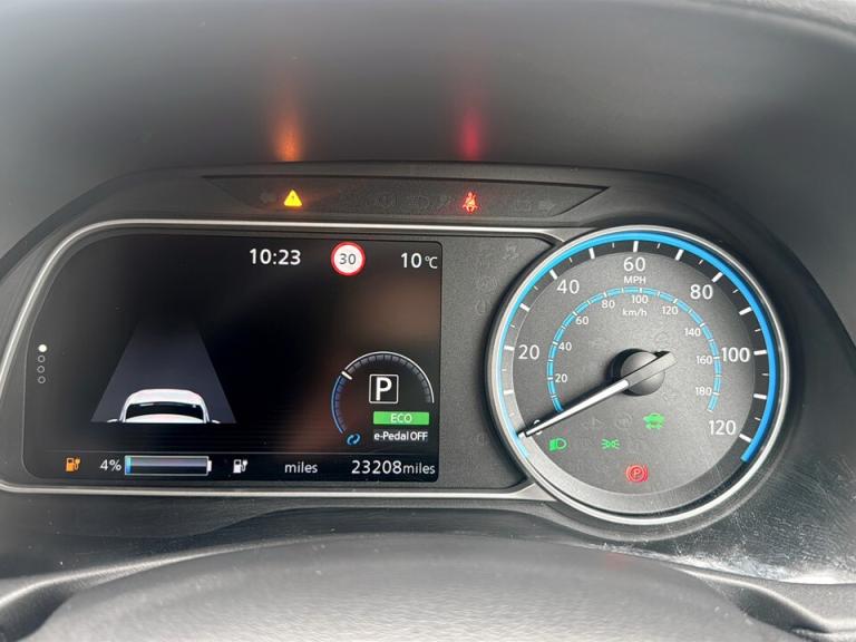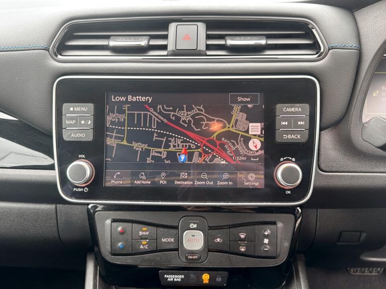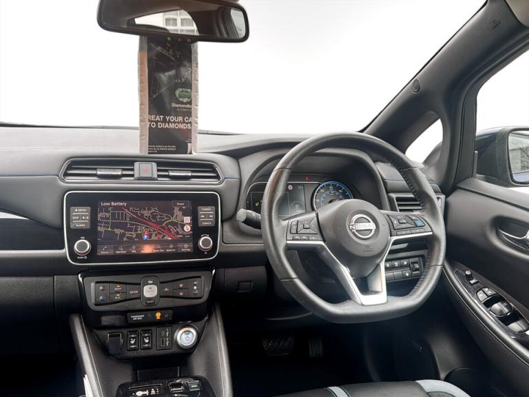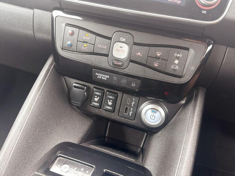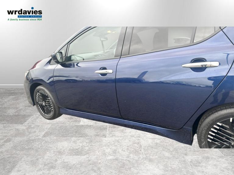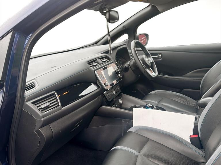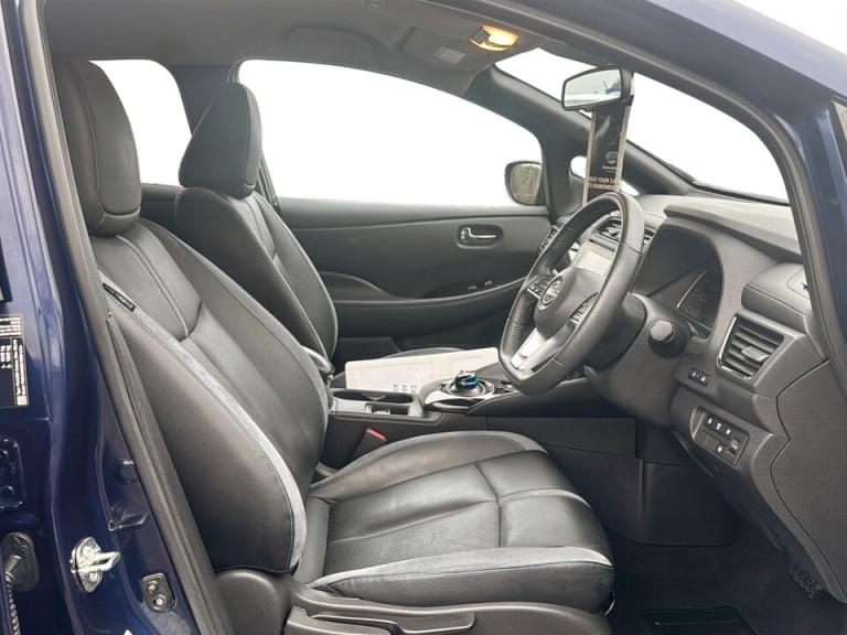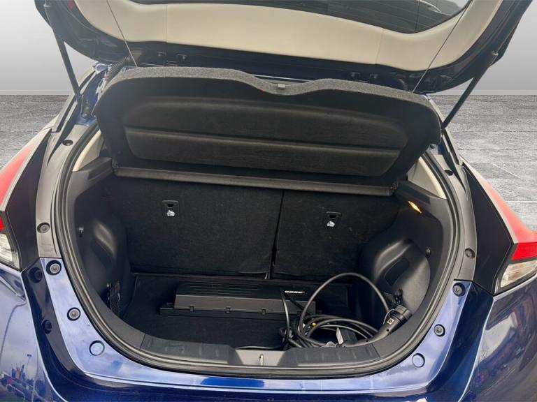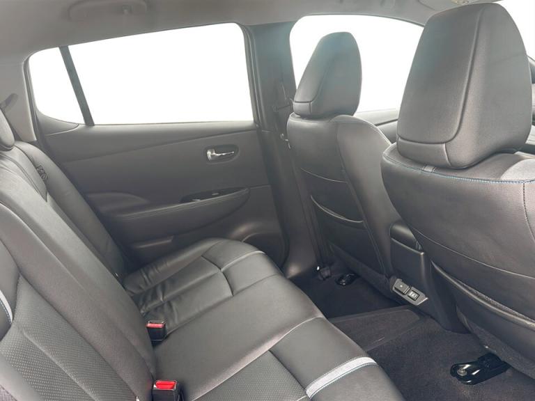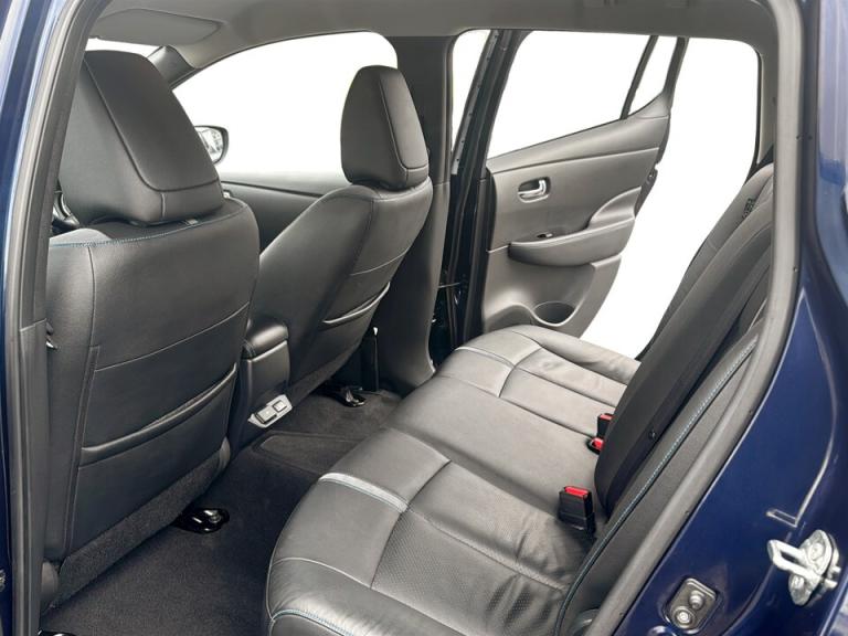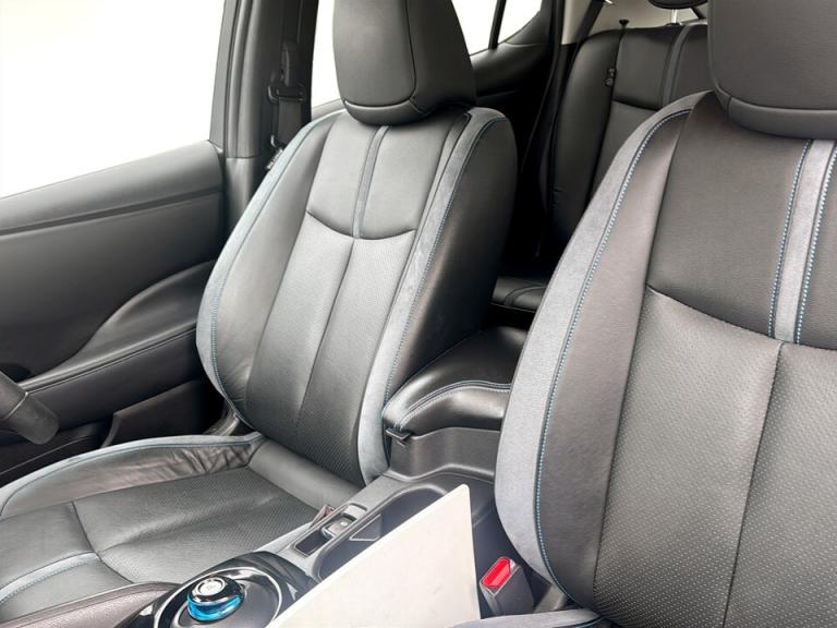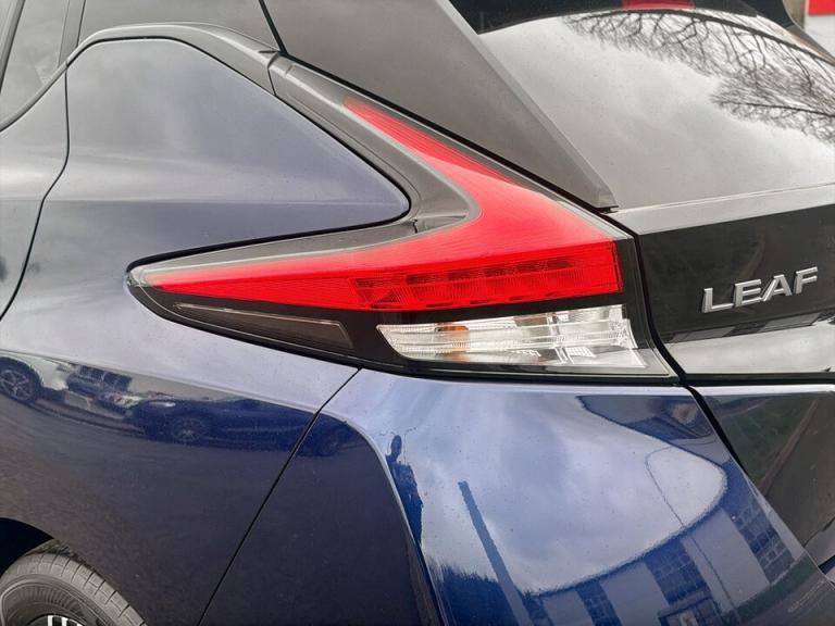 ..360 degree colour camera view, 7'' full colour TFT screen combimeter, 8'' colour display with touchscreen, Apple car play/Android Auto, Blind spot intervention, Blind spot warning, E Pedal, eCall emergency call system, Electric power assisted steering, EV telematics system, Front and rear parking sensors, Intelligent around view monitor, Intelligent Cruise control (ICC), Intelligent driver alert system, Intelligent lane intervention, Intelligent lane keep assist, Lane departure warning system, Moving object detection, Navigation system with voice control, Nissan connect services app (air conditioning control, cabin heating and charging), Rear cross traffic alert, Speed limiter, Traffic jam pilot, Trip computer, 39kWh usable battery capacity, 6.6 kw On-board charger, Charging port remote opening, Mac Pherson strut front suspension and twist beam axle rear suspension, Max DC charging power, ChaDeMo type: up to 50kW, Single motor, Audio system with USB, Bluetooth with audio streaming, Bose audio system 7 speakers - 2 tweeters, 4 high and medium frequency door speakers including subwoofer, DAB Digital radio, Rear USB ports, Aero roof spoiler, Auto dimming rear view mirror, Automatic activation of hazard warning lights, Automatic rain sensing wipers, Chrome door handles, Electric front/rear windows, Electrically adjustable and folding door mirrors, Follow me home headlights, Grey rear bumper finisher, High beam assist, Illuminated charge port, Intelligent auto headlights, LED signature daytime running lights with directional indicator, LED signature rear lights, LED third brake light, Rain sensor, Rear privacy glass, Rear side wing doors, Rear wiper, Shark fin antenna, 12V socket, 3 seat bench in 2nd row, 60/40 split folding rear seat, Automatic climate control with pollen filter and timer, Energy saving cabin heating system with heat pump, Front centre console and armrest, Front head restraints, Front seatback pockets, Heated rear seats, Height adjustable driver seat, Isofix child seat anchor points, Manual adjust driver/passenger seats, Multifunction leather steering wheel, Part leather with ultrasuede and synthetic leather upholstery, PTC (Positive Temp Co-efficent) heater, Rake and reach adjustable steering column, Rear assist grips, Rear head restraints, Single front passenger seat, Telescopic steering wheel adjustment, Heat pack with Heated front seats - Leaf, LED pack with Full LED headlights - Leaf, 3 point front seatbelts with pre-tensioners, 3x3