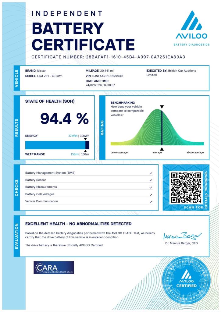 Introducing the Nissan Leaf 39kWh Acenta Hatchback 5dr Electric Auto (150 ps) - the perfect blend of style, performance, and eco-friendliness. With its powerful 150 ps electric motor, the Nissan Leaf offers impressive performance without compromising on efficiency. Say goodbye to petrol stations and hello to a greener way of driving. Don't miss out on the opportunity to own this fantastic Nissan Leaf. Contact us today to schedule a test drive and experience the future of driving for yourself.Competitive finance is also available.We are open 7 days a week and have more than 1500 cars to choose from.All our Euro 4 Petrol and Euro 6 Diesel vehicles meet the ULEZ standard.Vehicle specification can be found below. From time to time vehicles have manufacturer recalls notified. Please read our recall policy on our website for further information. Please be advised that the advertised electric vehicle (EV) listings may experience battery degradation over time, resulting in reduced performance and range compared to the original specifications. Factors such as usage patterns, environmental conditions, and charging practices can contribute to this degradation. While we strive to provide accurate information, the actual battery health and performance of each EV may vary. Customers are encouraged to conduct thorough research and consider the potential impact of battery degradation before making a purchase decision. We recommend consulting with a qualified technician or conducting a battery health inspection for further assessment. This vehicle comes with an AVILOO Battery Health Certificate - the global standard for EV battery testing. Full independent analysis confirms excellent battery condition with detailed State of Health assessment, cell-level checks, and accurate range data. Certificate included with purchase for your complete peace of mind and future resale value.Disclaimer: While every effort is made to ensure the accuracy of vehicle specifications, features, and descriptions, errors and omissions may occur. Specifications and equipment may vary and may not be present on the vehicle at the point of sale. Buyers are advised to confirm all details with the seller before completing a purchase.