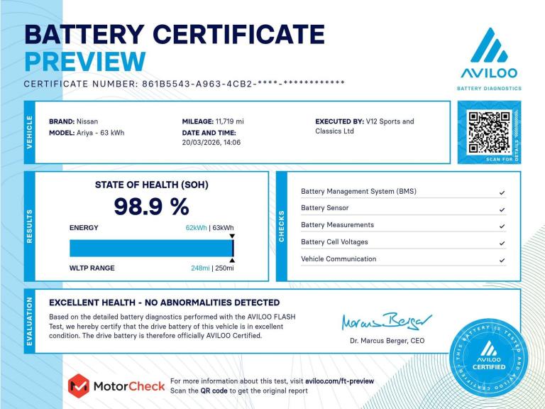 Introducing the Nissan Ariya 63kWh Engage SUV, a stunning electric vehicle that combines cutting-edge technology with sleek design. Finished in a striking White colour, the Nissan Ariya is sure to turn heads wherever you go. Plus, with zero emissions, you can drive with peace of mind knowing you're doing your part for the environment. Don't miss out on the opportunity to own this incredible Nissan Ariya. Visit us today to take a test drive and experience the future of driving for yourself.For peace of mind this vehicle has completed a multi point AA inspection.Competitive finance is also available.We are open 7 days a week and have more than 1500 cars to choose from.All our Euro 4 Petrol and Euro 6 Diesel vehicles meet the ULEZ standard.Vehicle specification can be found below. From time to time vehicles have manufacturer recalls notified. Please read our recall policy on our website for further information. Please be advised that the advertised electric vehicle (EV) listings may experience battery degradation over time, resulting in reduced performance and range compared to the original specifications. Factors such as usage patterns, environmental conditions, and charging practices can contribute to this degradation. While we strive to provide accurate information, the actual battery health and performance of each EV may vary. Customers are encouraged to conduct thorough research and consider the potential impact of battery degradation before making a purchase decision. We recommend consulting with a qualified technician or conducting a battery health inspection for further assessment. This vehicle comes with an AVILOO Battery Health Certificate - the global standard for EV battery testing. Full independent analysis confirms excellent battery condition with detailed State of Health assessment, cell-level checks, and accurate range data. Certificate included with purchase for your complete peace of mind and future resale value.Disclaimer: While every effort is made to ensure the accuracy of vehicle specifications, features, and descriptions, errors and omissions may occur. Specifications and equipment may vary and may not be present on the vehicle at the point of sale. Buyers are advised to confirm all details with the seller before completing a purchase.