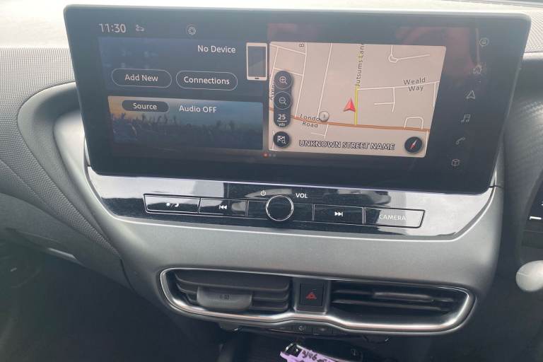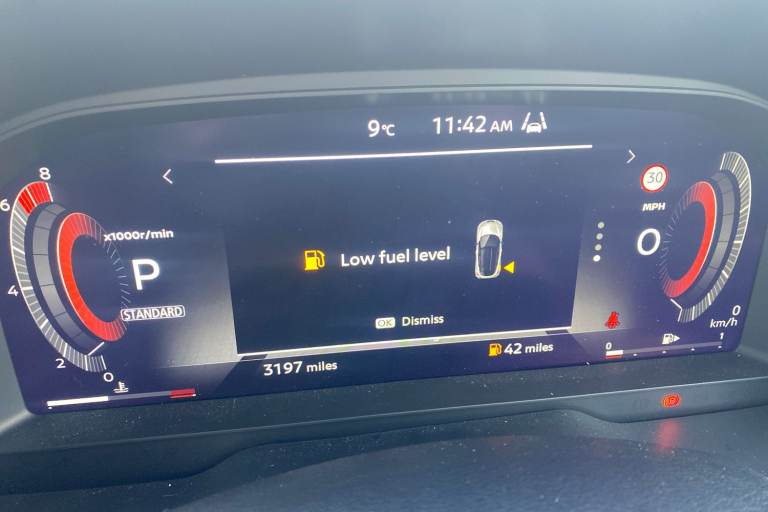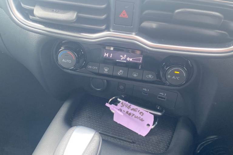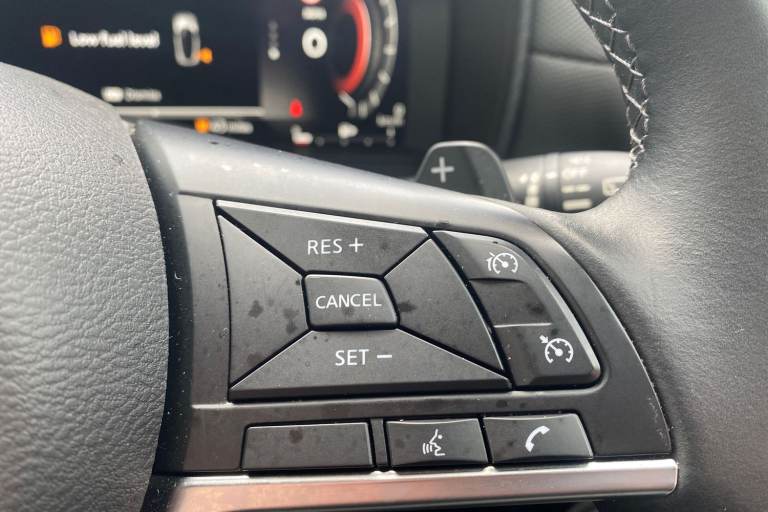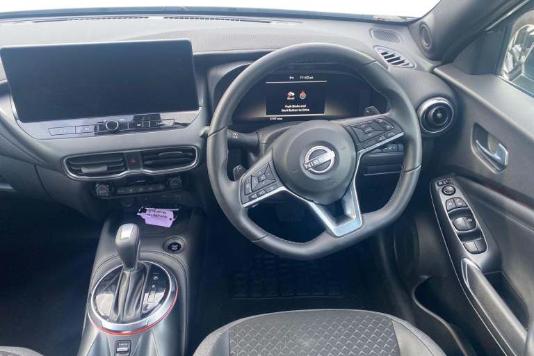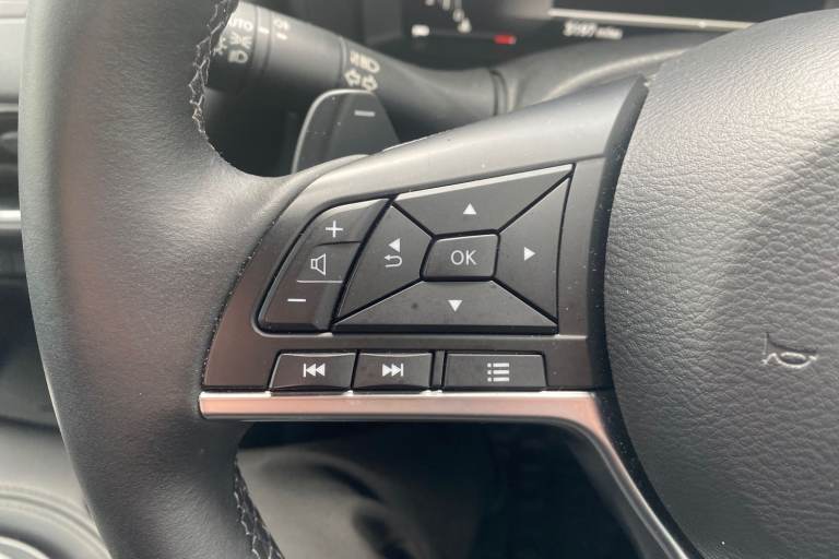 ..12.3'' full colour TFT screen combimeter, Drive modes select (Eco, normal and sport), Emergency and breakdown call, Front parking sensor, Idle start/stop system, Intelligent driver alert system, Intelligent lane intervention, Lane departure warning system, Nissan connect 12.3'' touch screen entertainment system, Nissan connect nav with TomTom traffic, Nissan connect services and Wifi connection, Outside temperature sensor, Power Steering, Rear parking sensor, Stop/start button, Traffic sign recognition, Trip computer, Voice recognition, Wireless Apple CarPlay and Google Android auto, Wireless Smartphone charger, 2 X Rear console USB port, 6 speakers, Bluetooth system, USB, Aux-in and 12V socket, DAB Digital radio, Auto dimming frameless rear view mirror, Automatic hazard signal with emergency stop signal, Body colour door handles, Electrically adjustable door mirrors with integrated indicators, Follow me home headlights, Front and rear electric window with one touch driver window, Heated and auto folding door mirrors, High beam assist, LED 3rd brake light, LED daytime running lights, LED headlamps, LED rear fog lamp, LED rear lamps, One touch passenger window, Rain sensor windscreen wipers, Rear privacy glass, Rear side wing doors, Rear wiper, Roof spoiler, Shark fin roof antenna in solid Black, Three blink turn signal, 3 height adjustable rear headrests, 3 seat bench in 2nd row, 60/40 split folding rear seat, Automatic climate control, Card holder on driver sunvisor, Cloth/Synthetic leather with melange fabric inserts, Driver side rear coat hanger, Driver/passenger sunvisors and vanity mirrors, Front and rear cabin lights, Front armrest, Front door pockets with bottle holders, Front head restraints, Front/rear passenger grab handles, Height adjustable driver's seat, Internal chrome door handles, Leather gearshift knob, Leather steering wheel, Luggage board, Luggage space lighting, Monoform sporty seats, Multifunction steering wheel, Rear door bottle holders, Single front passenger seat, Steering wheel mounted gearshift paddles, Synthetic leather kneepad, Telescopic steering wheel adjustment, Two cupholders in front centre console, Two rear isofix child seat anchorage points with top tether, Welcome light and console tray ambient lighting, ABS with EBD and brake assist, Active ride control, Active Trace Control, Driver and passenger airbags, Driver and passenger side airbags, Electric handbrake with auto hold function, Electronic Stability Programme
