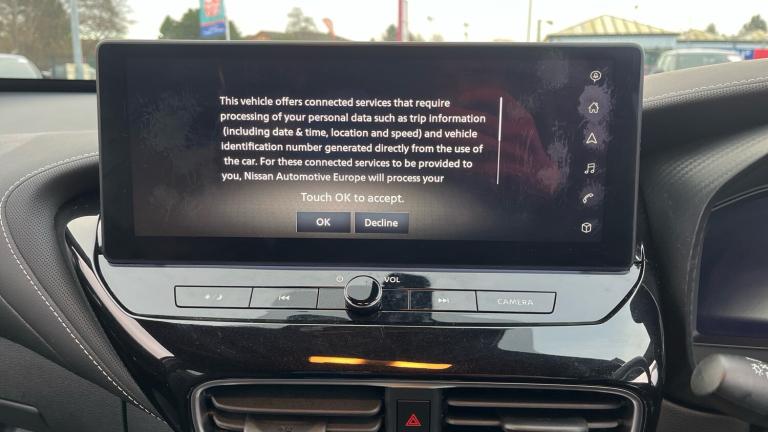 .Rear wiper, Rear privacy glass, One touch passenger window, Front and rear electric window with one touch driver window, Traction control, VDC Dynamic Vehicle Control, Hill start assist, Electronic Stability Programme (ESP), ABS with EBD and brake assist, Intelligent emergency braking with pedestrian and cyclist recognition, Electric handbrake with auto hold function, Wireless Smartphone charger, Voice recognition, Wireless Apple CarPlay and Google Android auto, WiFi connectivity, Power Steering, Rear parking sensor, Lane departure warning system, Front parking sensor, Traffic sign recognition, Intelligent lane intervention, Intelligent driver alert system, Drive modes select (Eco, normal and sport), EV mode switch, Stop/start button, Trip computer, Outside temperature sensor, Emergency and breakdown call, Nissan connect nav with TomTom traffic, e-Pedal step, 12.3"" full colour TFT screen combimeter, Nissan connect 12.3"" touch screen entertainment system