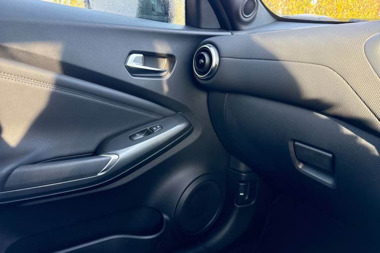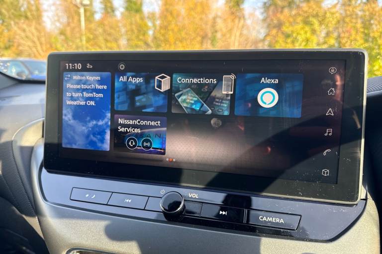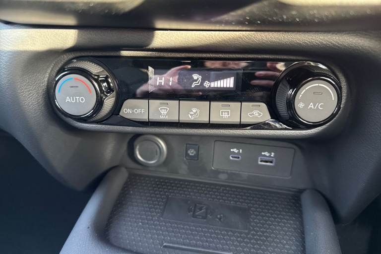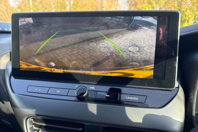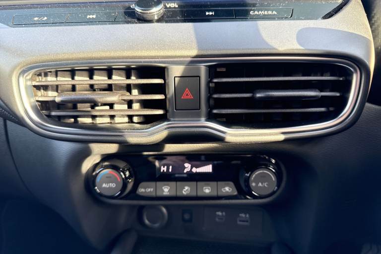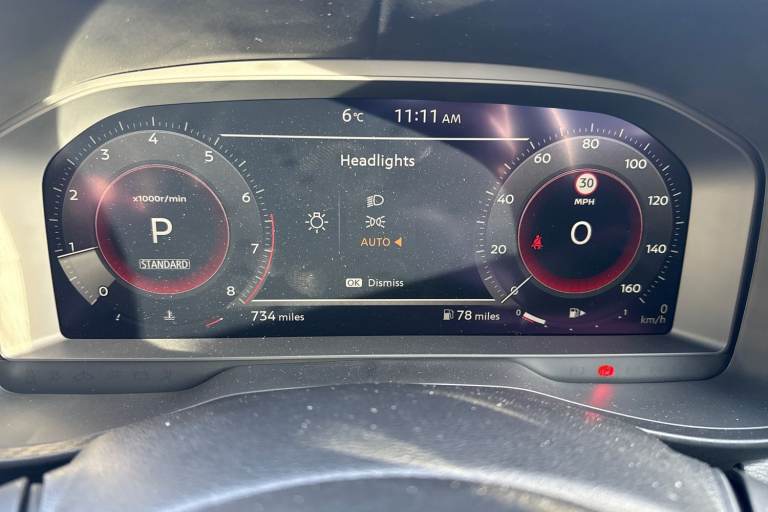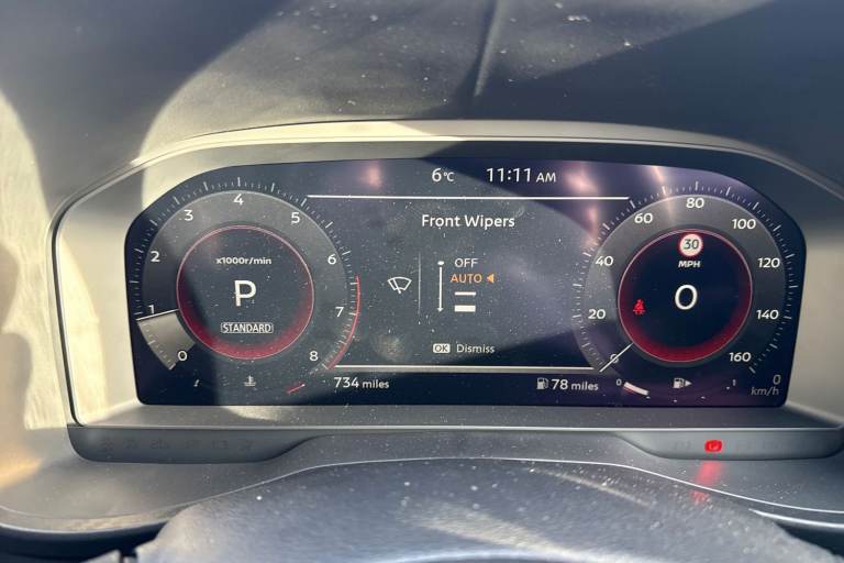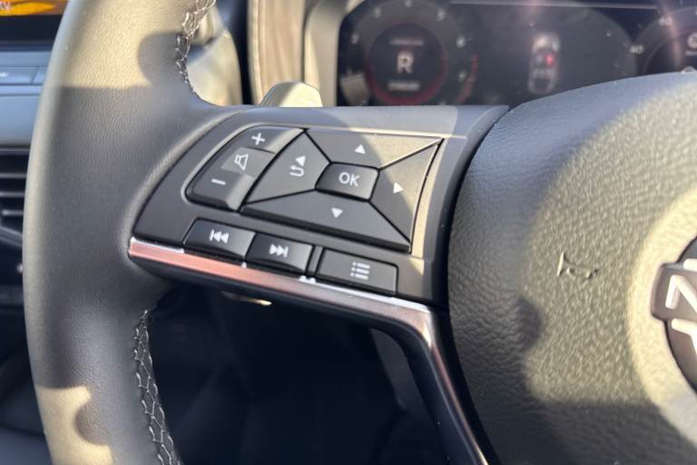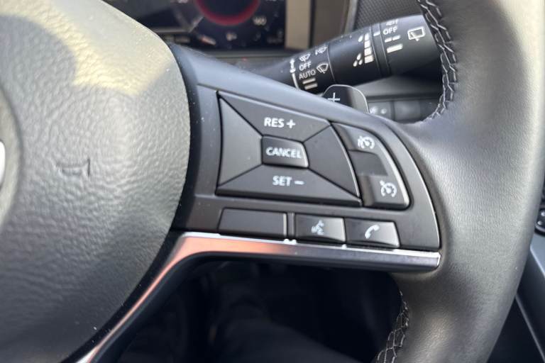 ..12.3'' full colour TFT screen combimeter, Drive modes select (Eco, normal and sport), Emergency and breakdown call, Front parking sensor, Idle start/stop system, Intelligent driver alert system, Intelligent lane intervention, Lane departure warning system, Nissan connect 12.3'' touch screen entertainment system, Nissan connect nav with TomTom traffic, Nissan connect services, Outside temperature sensor, Power Steering, Rear parking sensor, Stop/start button, Traffic sign recognition, Trip computer, Voice recognition, WiFi connectivity, Wireless Apple CarPlay and Google Android auto, Wireless Smartphone charger, 2 X Rear console USB port, 6 speakers, Bluetooth system, USB, Aux-in and 12V socket, DAB Digital radio, Auto dimming frameless rear view mirror, Automatic hazard signal with emergency stop signal, Body colour door handles, Electrically adjustable door mirrors with integrated indicators, Follow me home headlights, Front and rear electric window with one touch driver window, Heated and auto folding door mirrors, High beam assist, LED 3rd brake light, LED daytime running lights, LED headlamps, LED rear fog lamp, LED rear lamps, One touch passenger window, Rain sensor windscreen wipers, Rear privacy glass, Rear side wing doors, Rear wiper, Roof spoiler, Shark fin roof antenna in solid Black, Solid black door mirrors, Three blink turn signal, 3 height adjustable rear headrests, 3 seat bench in 2nd row, 60/40 split folding rear seat, Automatic climate control, Card holder on driver sunvisor, Cloth/Synthetic leather with melange fabric inserts, Driver side rear coat hanger, Driver/passenger sunvisors and vanity mirrors, Front and rear cabin lights, Front armrest, Front door pockets with bottle holders, Front head restraints, Front/rear passenger grab handles, Height adjustable driver's seat, Internal chrome door handles, Luggage board, Luggage space lighting, Monoform sporty seats, Multifunction steering wheel, Rear door bottle holders, Single front passenger seat, Smooth synthetic leather steering wheel, Steering wheel mounted gearshift paddles, Synthetic leather kneepad, Synthetic leather shift knob, Telescopic steering wheel adjustment, Two cupholders in front centre console, Two rear isofix child seat anchorage points with top tether, Welcome light and console tray ambient lighting, ABS with EBD and brake assist, Active ride control, Active Trace Control, Driver and passenger airbags, Driver and passenger side airbags, Electric handbrake with auto