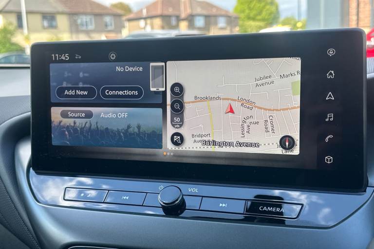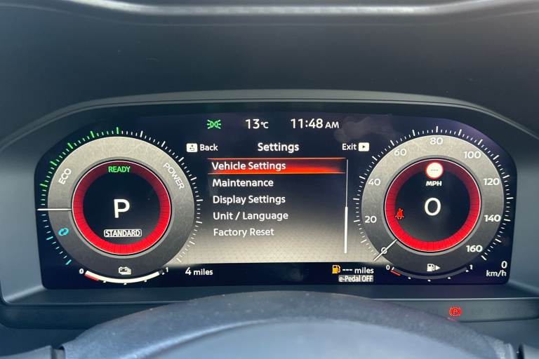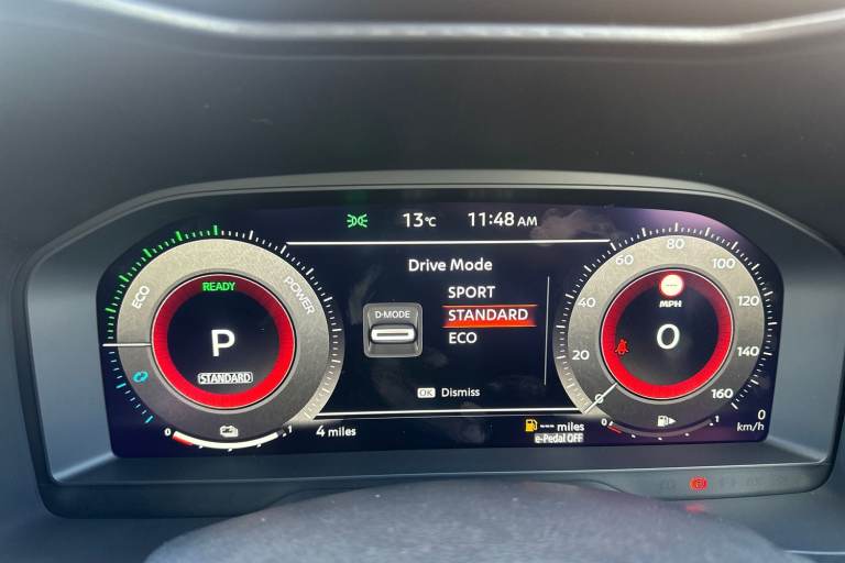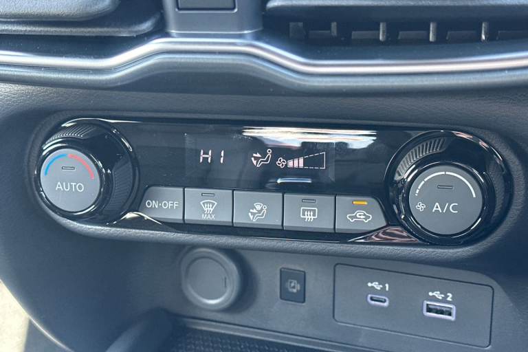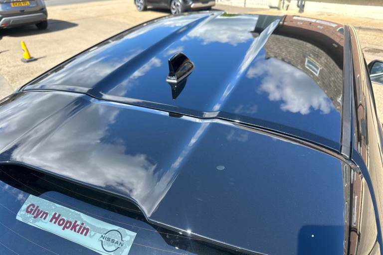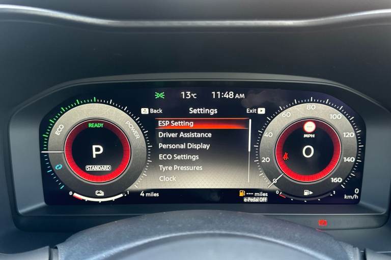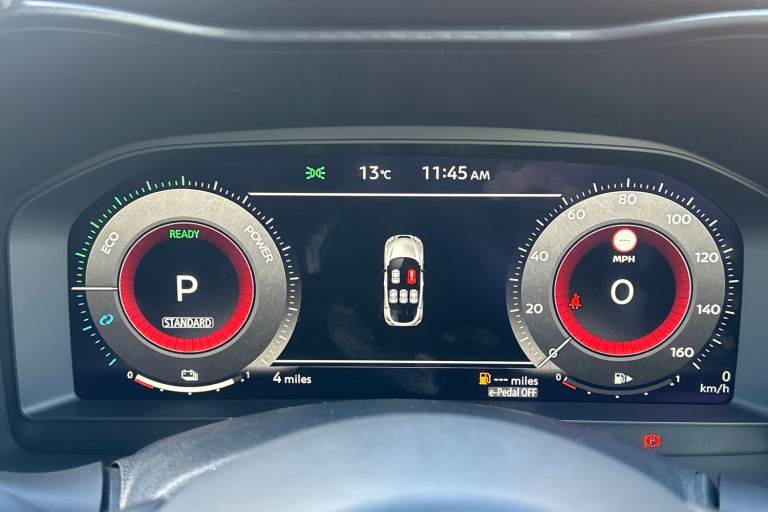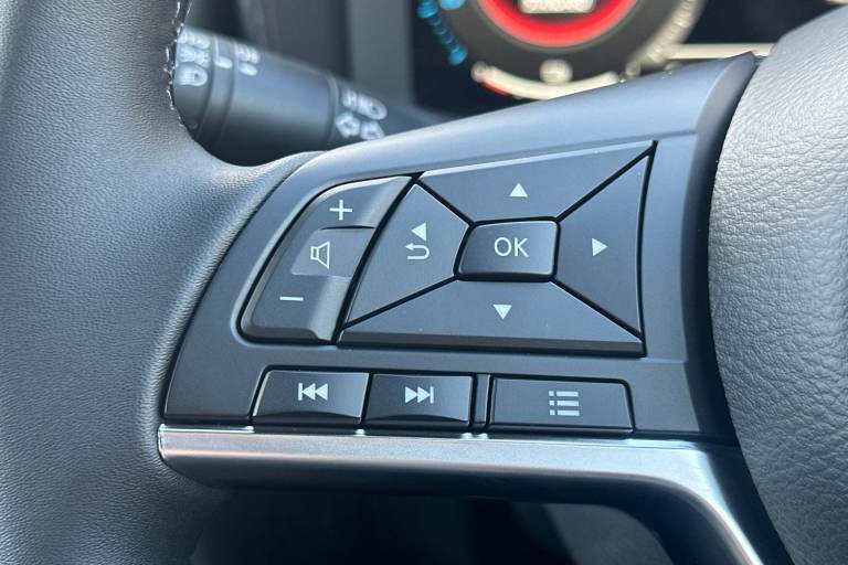 ..12.3'' full colour TFT screen combimeter, Drive modes select (Eco, normal and sport), e-Pedal step, Emergency and breakdown call, EV mode switch, Front parking sensor, Intelligent driver alert system, Intelligent lane intervention, Lane departure warning system, Nissan connect 12.3'' touch screen entertainment system, Nissan connect nav with TomTom traffic, Nissan connect services, Outside temperature sensor, Power Steering, Rear parking sensor, Stop/start button, Traffic sign recognition, Trip computer, Voice recognition, WiFi connectivity, Wireless Apple CarPlay and Google Android auto, Wireless Smartphone charger, 2 X Rear console USB port, 6 speakers, Bluetooth system, USB, Aux-in and 12V socket, DAB Digital radio, Auto dimming frameless rear view mirror, Automatic hazard signal with emergency stop signal, Body colour door handles, Electrically adjustable door mirrors with integrated indicators, Follow me home headlights, Front and rear electric window with one touch driver window, Heated and auto folding door mirrors, High beam assist, LED 3rd brake light, LED daytime running lights, LED headlamps, LED rear fog lamp, LED rear lamps, One touch passenger window, Rain sensor windscreen wipers, Rear privacy glass, Rear side wing doors, Rear wiper, Roof spoiler, Shark fin roof antenna in solid Black, Three blink turn signal, 3 height adjustable rear headrests, 3 seat bench in 2nd row, 60/40 split folding rear seat, Automatic climate control, Card holder on driver sunvisor, Cloth/Synthetic leather with melange fabric inserts, Driver side rear coat hanger, Driver/passenger sunvisors and vanity mirrors, Front and rear cabin lights, Front armrest, Front door pockets with bottle holders, Front head restraints, Front/rear passenger grab handles, Height adjustable driver's seat, Internal chrome door handles, Leather gearshift knob, Luggage board, Luggage space lighting, Monoform sporty seats, Multifunction steering wheel, Rear door bottle holders, Single front passenger seat, Smooth synthetic leather steering wheel, Synthetic leather kneepad, Telescopic steering wheel adjustment, Two cupholders in front centre console, Two rear isofix child seat anchorage points with top tether, Welcome light and console tray ambient lighting, ABS with EBD and brake assist, Active ride control, Active Trace Control, Driver and passenger airbags, Driver and passenger side airbags, Electric handbrake with auto hold function, Electronic Stability Programme (ESP), Front and rear