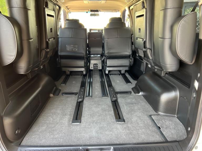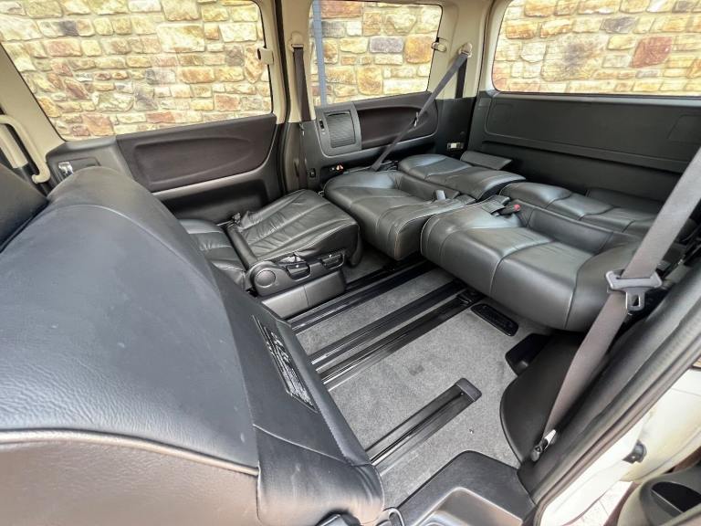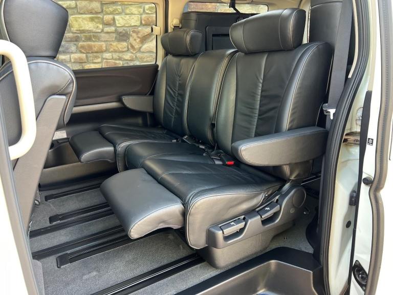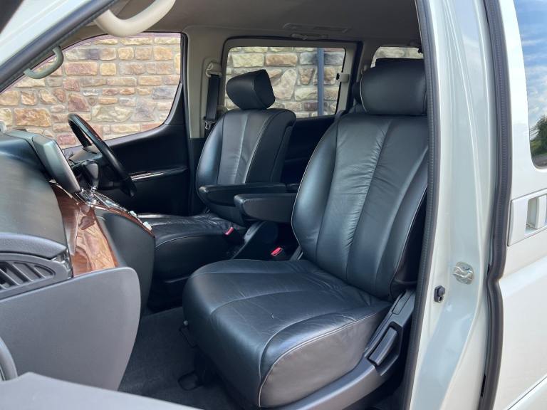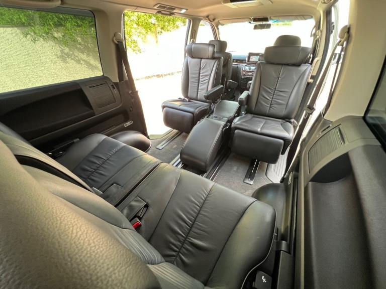 This is the 2009 Nissan Elgrand 3.5 Highway Star in White Pearl with Twin power doors , Full Black leather limited specification and 8 seats . It is a top grade vehicle (4B). This vehicle is a cold region version which has a better internal heating system and window demisters it also has a corrosion protection package which has extended protection unlike most Japanese cars .