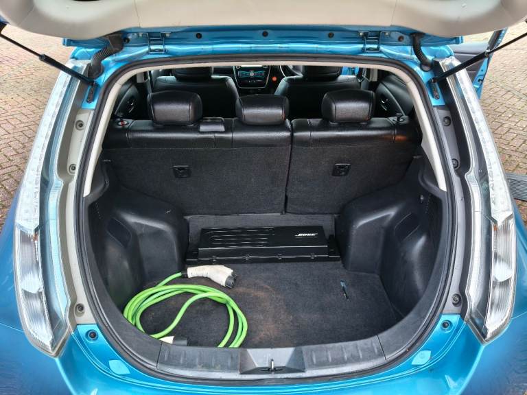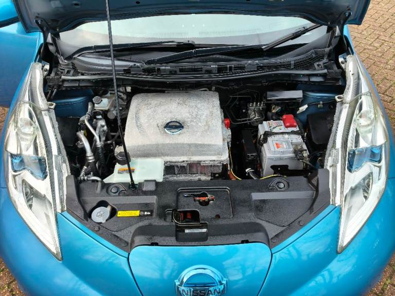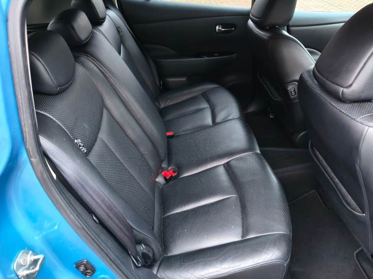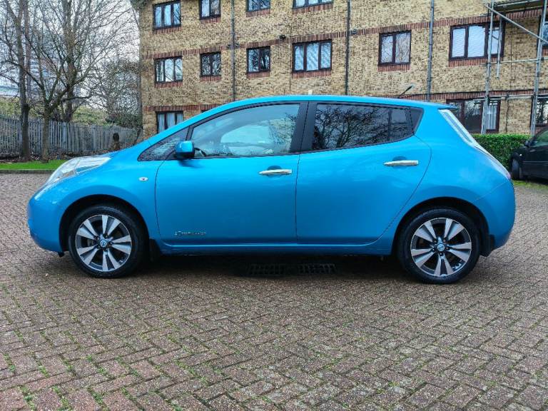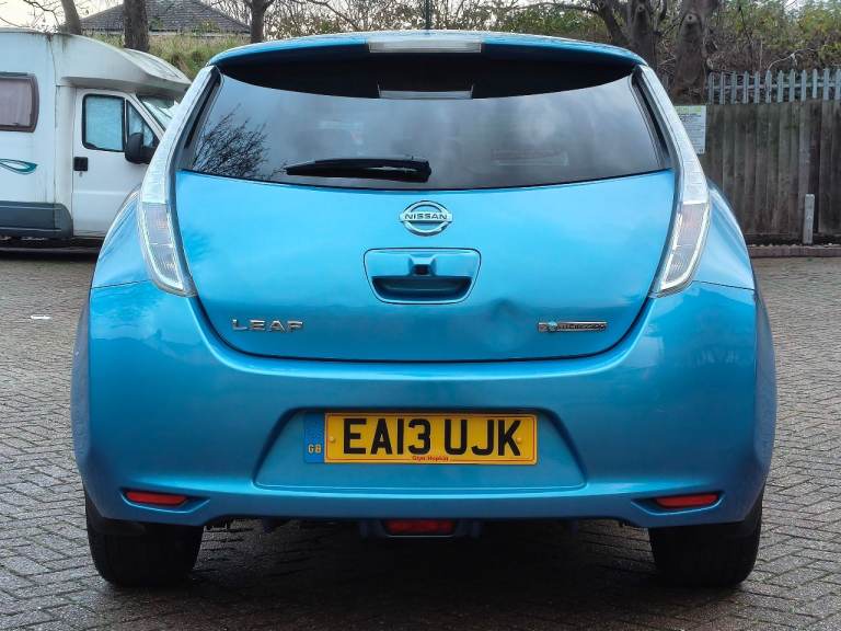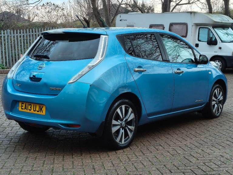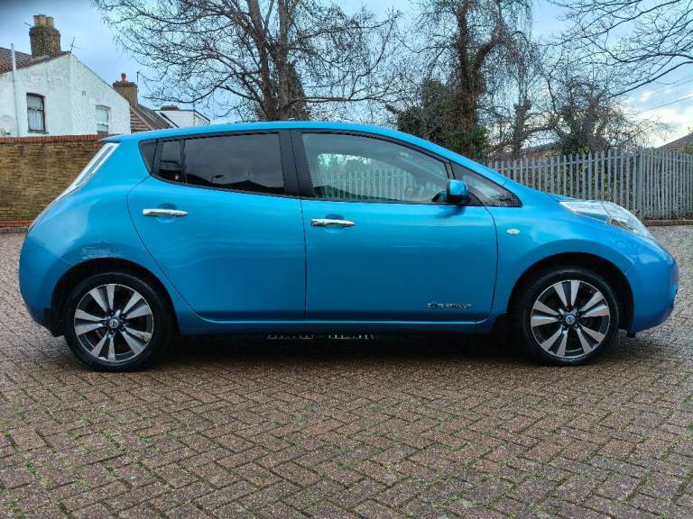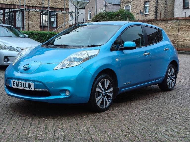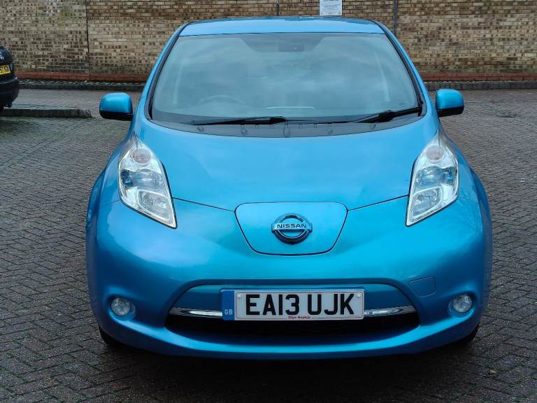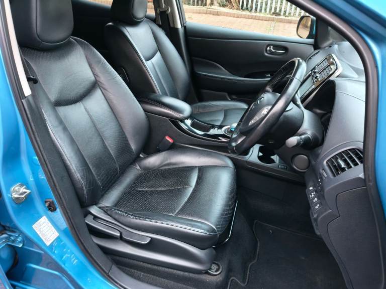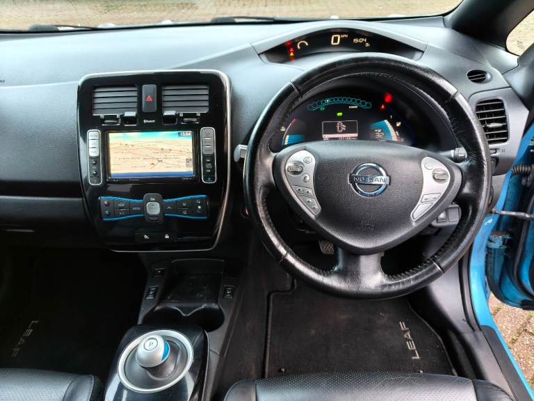 NISSAN LEAF ZEO TEKNA ELECTRIC, AUTOMATIC, 2013 13 REG, METALLIC BLUE WITH BLACK FULL LEATHER HEATED SEATS, 5 DOOR HATCHBACK, POWER STEERING, AIR/CON, CRUISE CONTROL, SAT/NAV, HEATED STEERING, WHEEL, E/WINDOWS, E/FOLDING MIRRORS, REMOTE CENTRAL LOCKING ALARM WITH 2 KEYS, BOSE C/D PLAYER WITH MULTI FUNCTION STEERING WHEEL AND USB/AUX, AIR/BAGS, TINTS, FRONT FOG LIGHTS, ORIGINAL ALLOY WHEELS, 102K MILES, 2 OWNERS, MOT END DEC 2026, 35 MILE RANGE ON FULL CHARGE, STREET CHARGE ADAPTER AND HOME 3 PIN PLUG CHARGERS INCLUDED.
