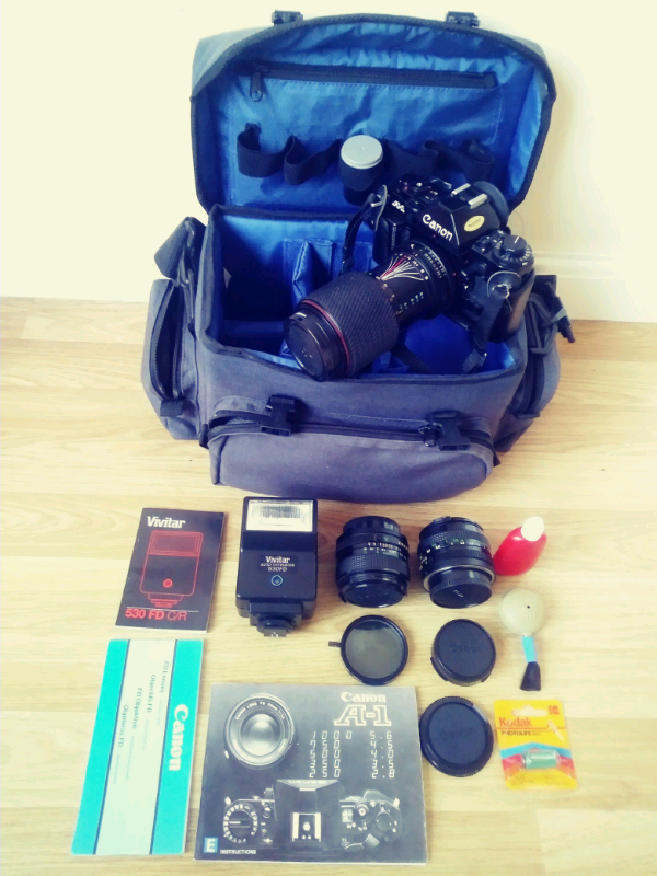 Canon A1 SLR Camera with through the lens metering, aperture and shutter speed priority. Includes Canon 50mm and 28mm lenses, Tokina 70-210 zoom lens. Vivitar hot shoe flash, Polarizer Filter, Camera Bag and Instruction Booklet.