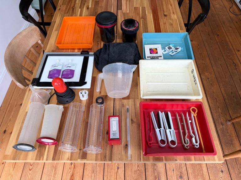 Traditional darkroom setup for developing and printing film at home.