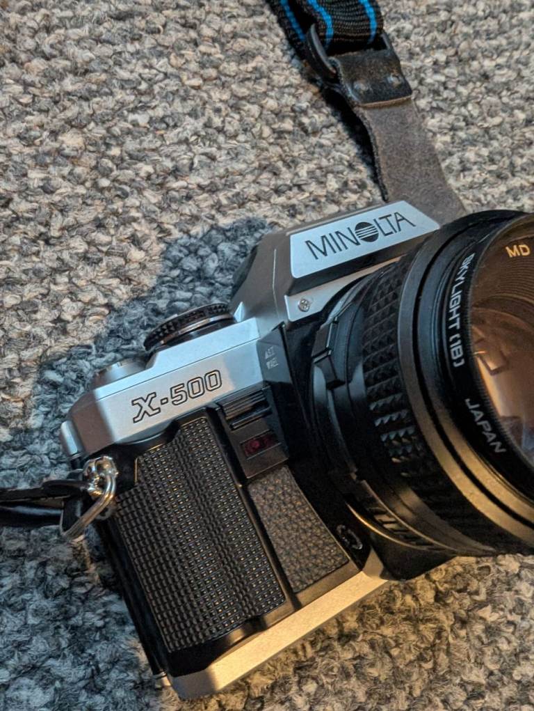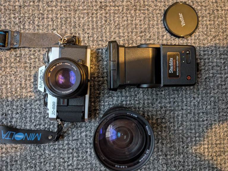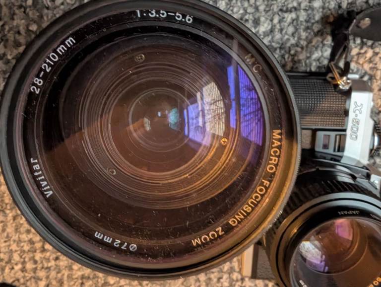 Minolta x500 for sale with 50mm f1.7 lens, vivitar 28-210mm lenses and flash. Good condition shutter working fine. but the light seals probably need replacing.