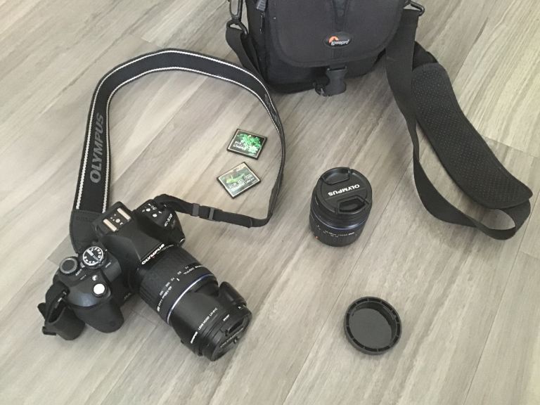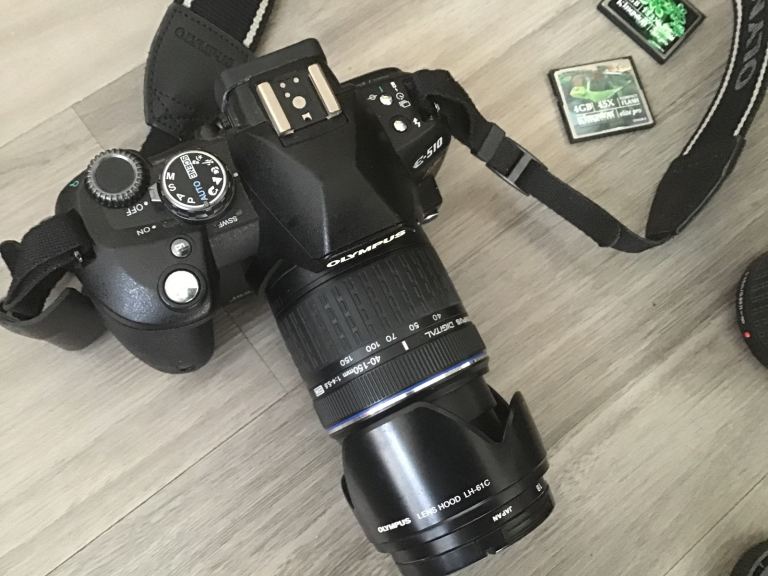 Olympus E510 digital camera with 14-42mm & 40-150mm lenses and bag.