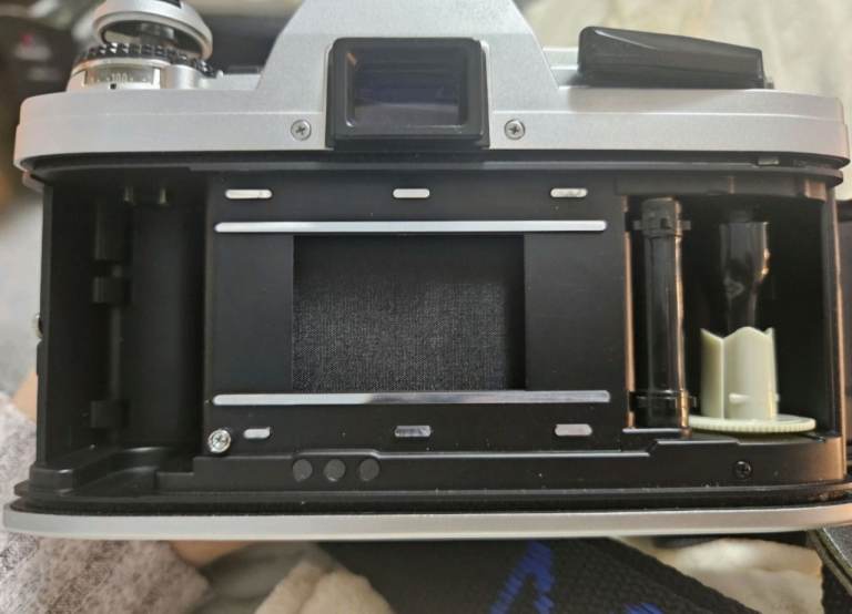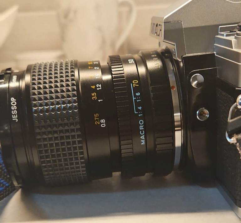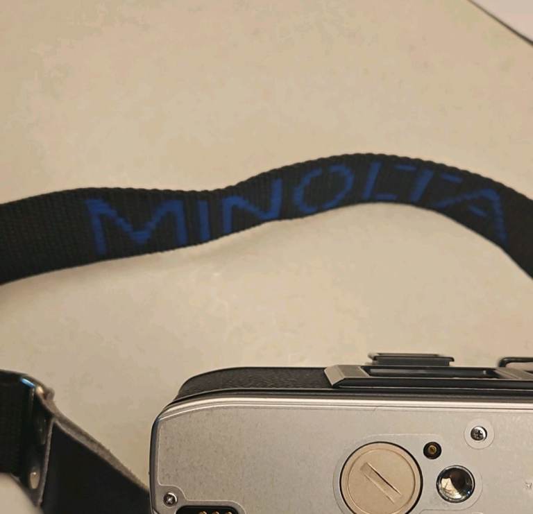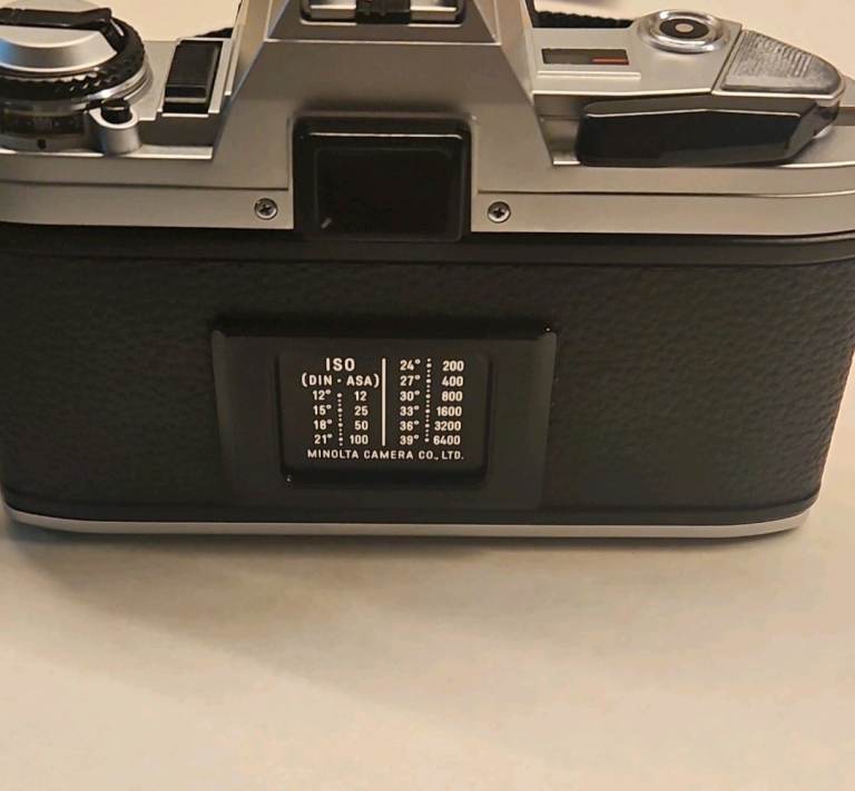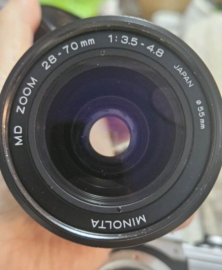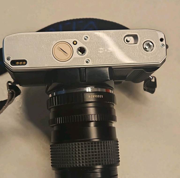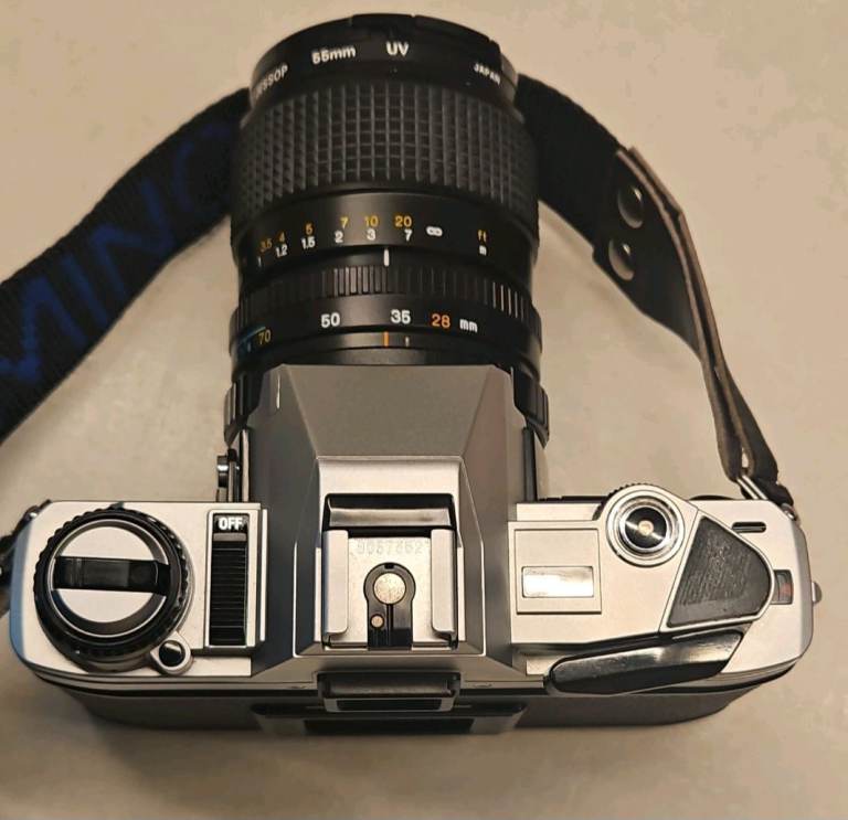 The Minolta X-300 Film Camera is a classic SLR camera in black, known for its high-quality images and user-friendly design. It is equipped with a versatile 35-70mm F3.5 M/F zoom lens, perfect for capturing a wide range of subjects. The camera also includes a UV lens and comes with a protective bag.