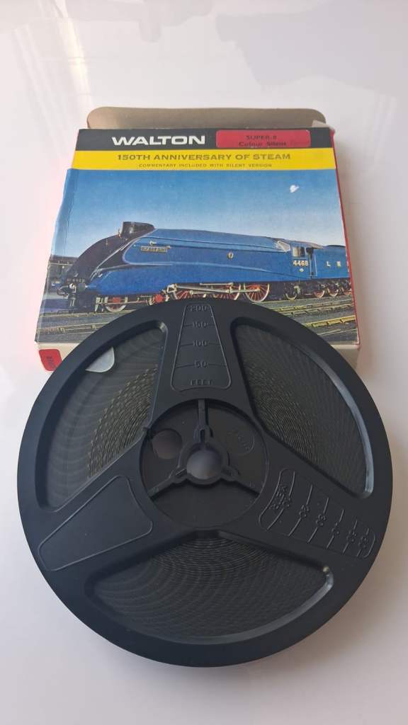 Walton Super-8 silent colour film reel featuring the "150th Anniversary of Steam," showcasing the famous LNER Class A4 4468 locomotive, Mallard.