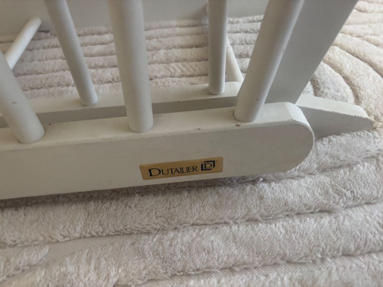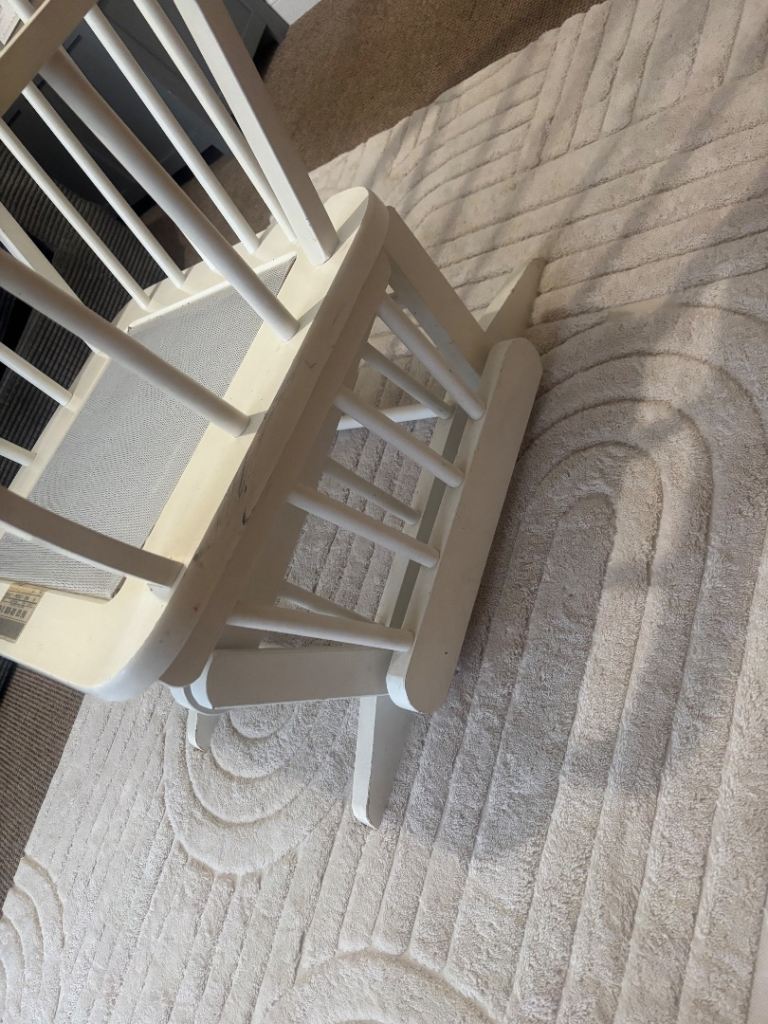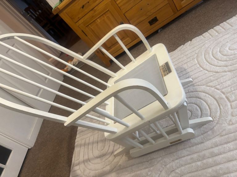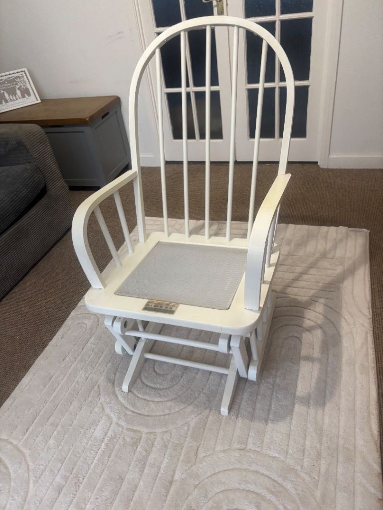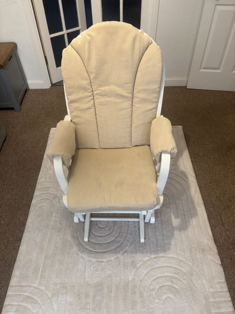 Beautiful nursing chair which, would look stunning in any nursery! Solid chair, no issues with the mechanism however, there are some scratches on the wood from being moved but touched up with a bit of white satin will look brand new!