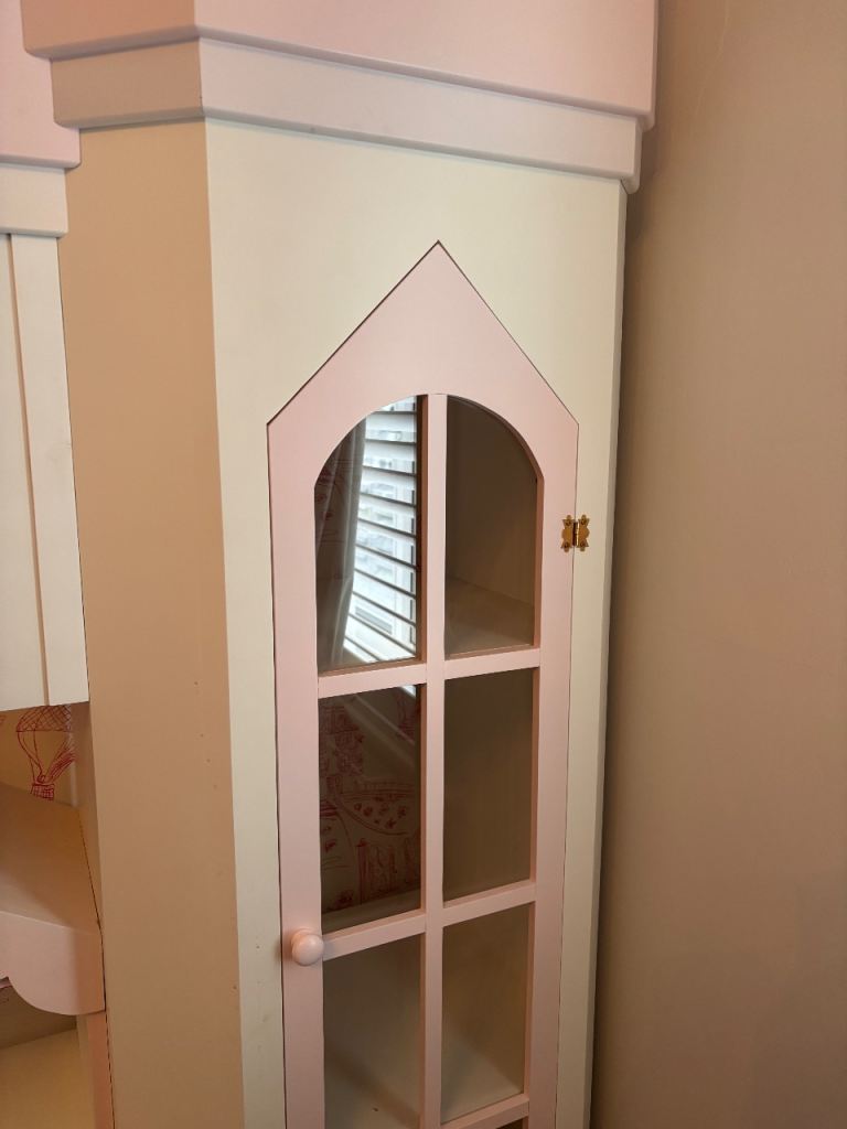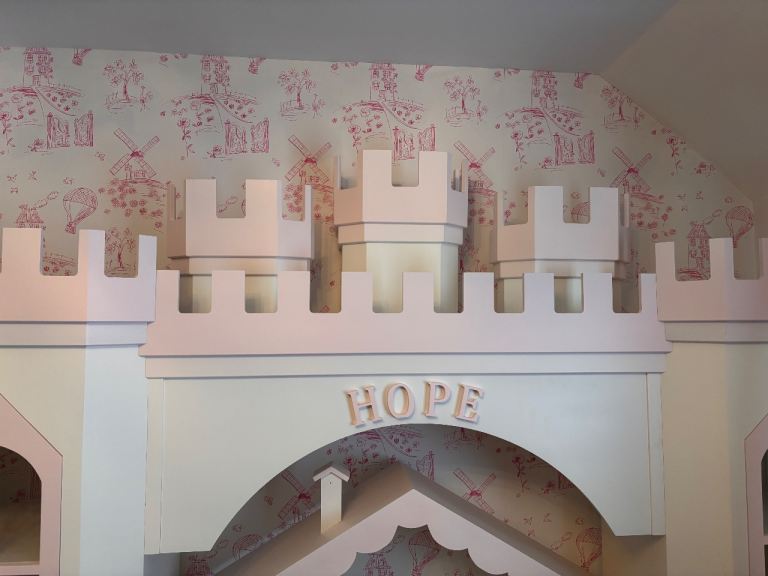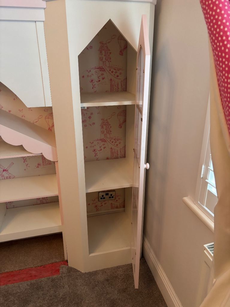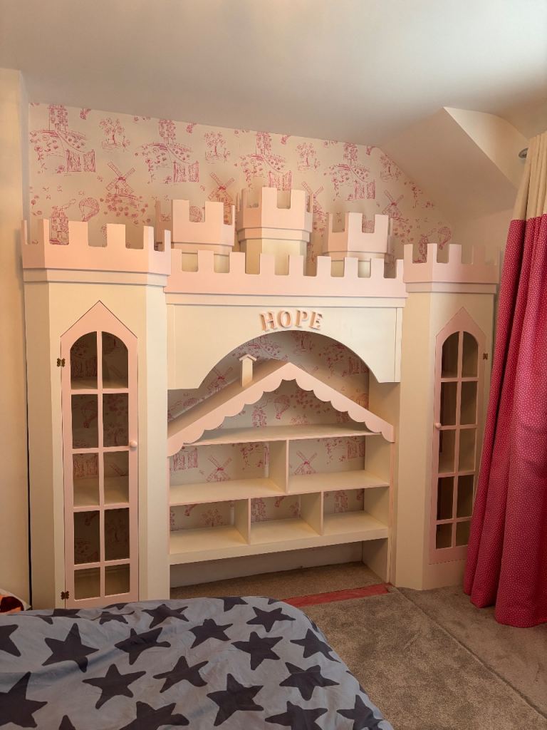 A stunning, one-of-a-kind, hand-built children’s shelving unit designed to transform any bedroom into a fairytale space. Crafted to resemble a charming castle, this bespoke piece combines imaginative design with practical storage.