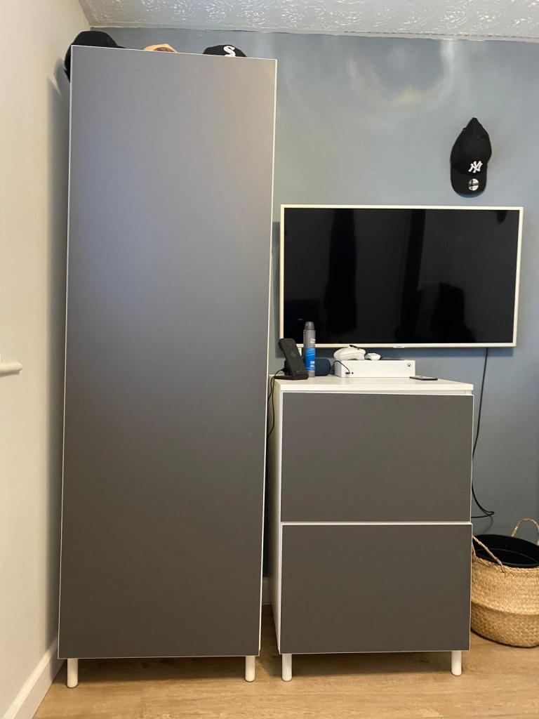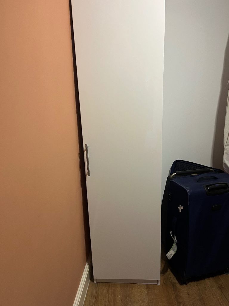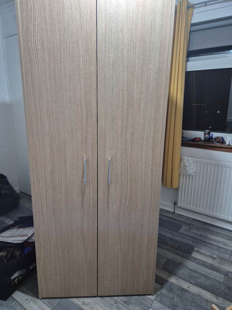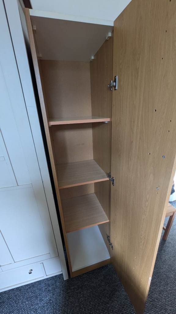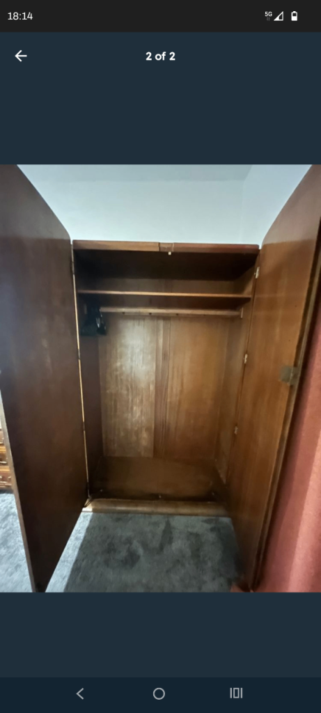 Vintage coffin style double wardrobe with internal shelving also. Darker wood and walnut details, had lock and key included. FREE to good home, will need to dismantle and transport yourself, but it doesn't separate down the middle into two sections so is doable!