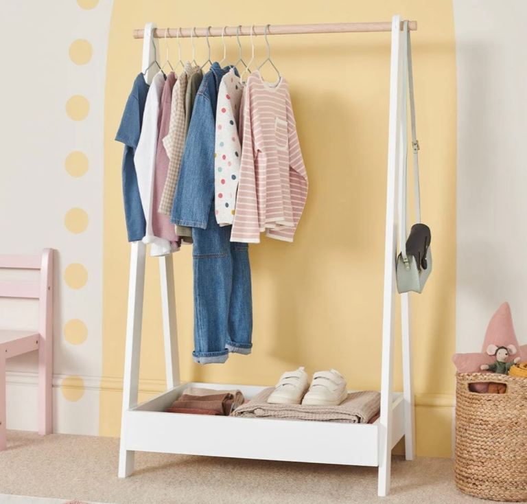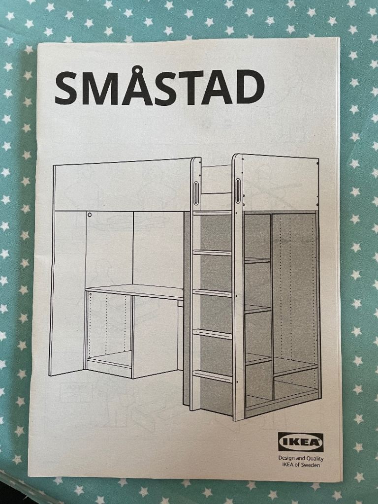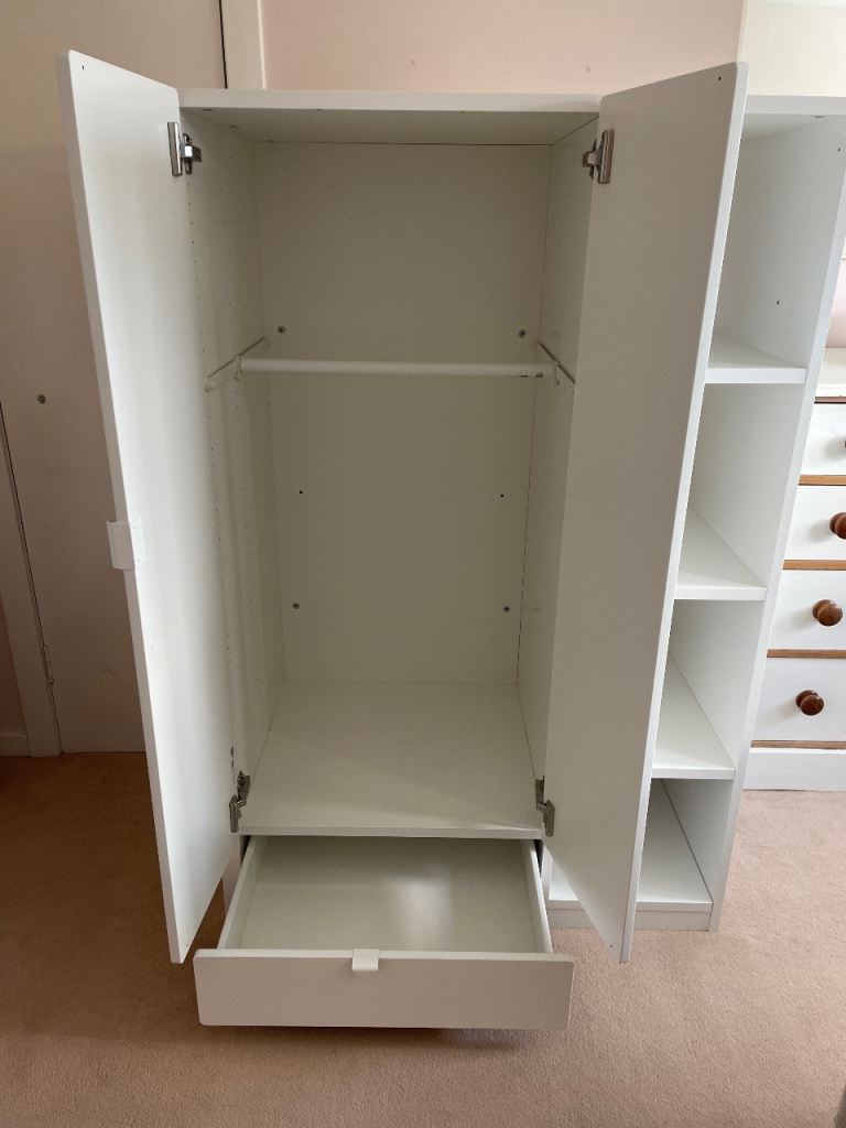 White storage unit (part of Smastad high sleeper configuration), sturdy, adjustable hanging rail, drawer and 4 shelves. Excellent condition. Smoke and pet free home.