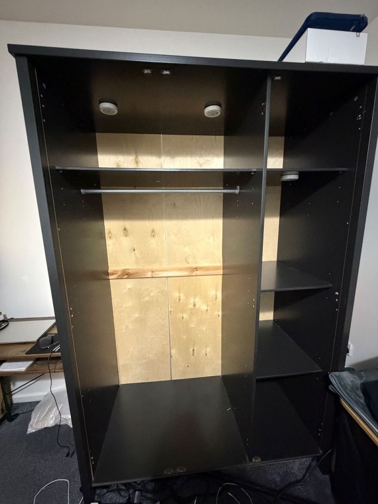 3-door wardrobe in black, in good used condition. Clean, sturdy, and fully functional. Features a hanging rail and internal shelving, providing plenty of storage for clothes, shoes, and accessories.