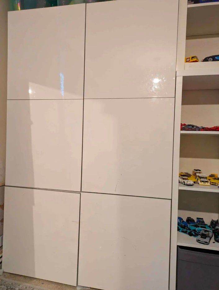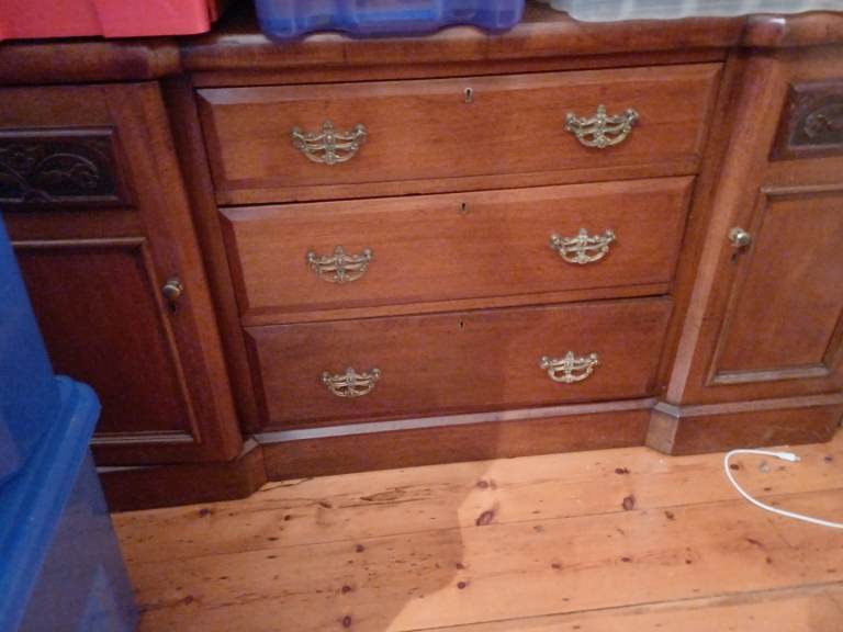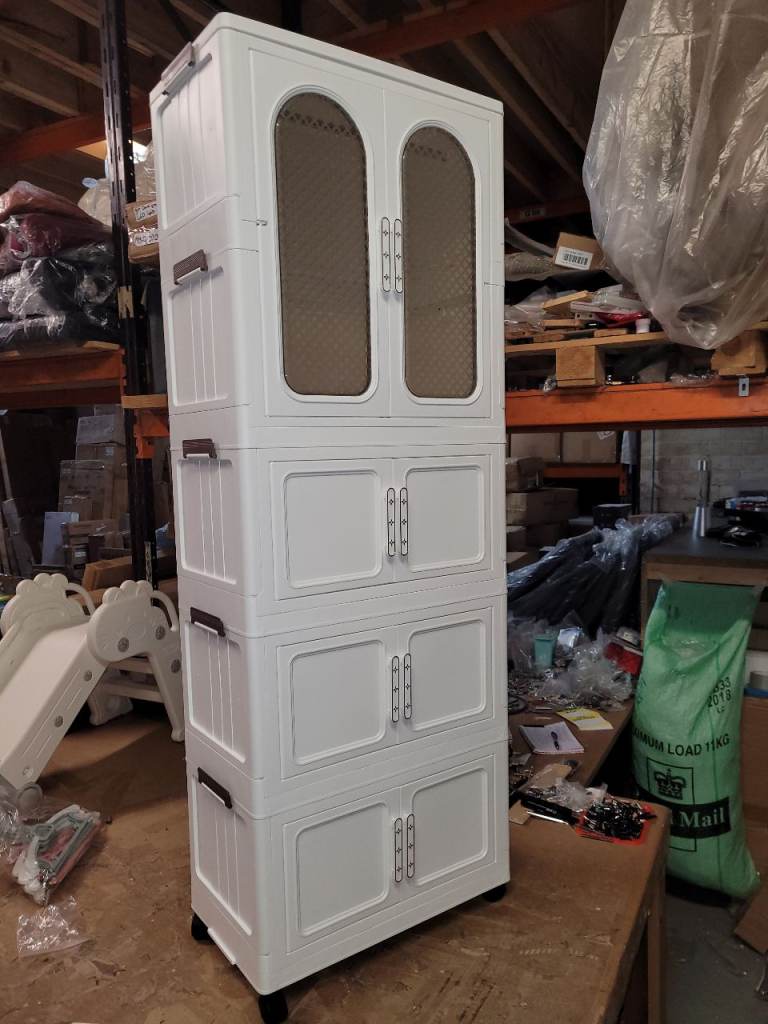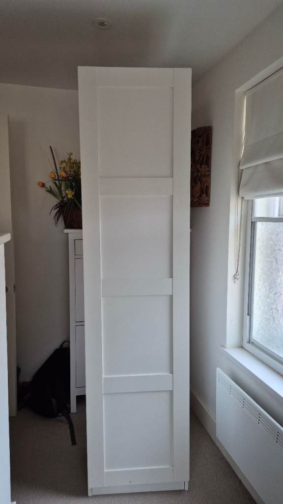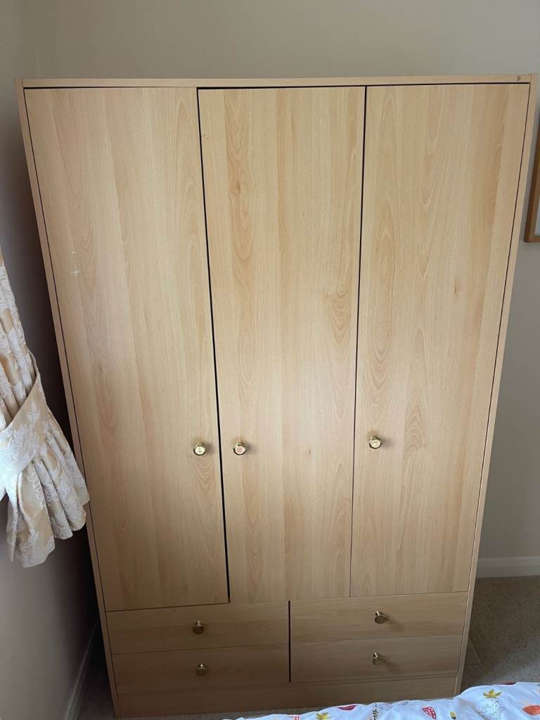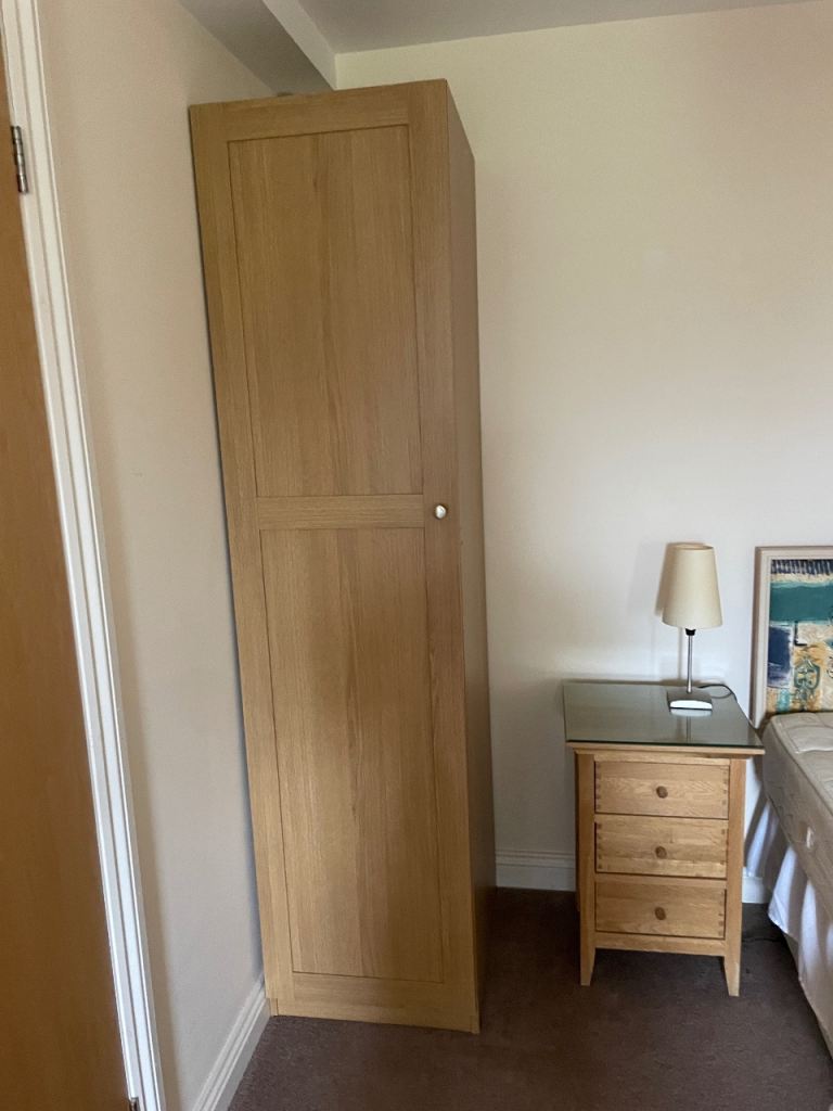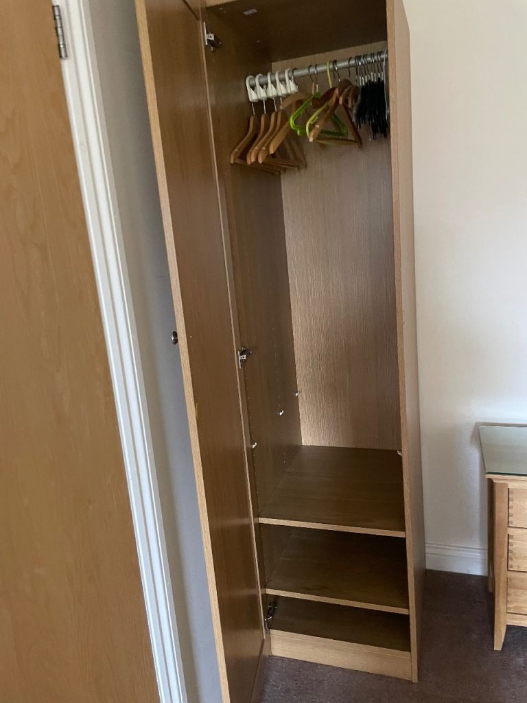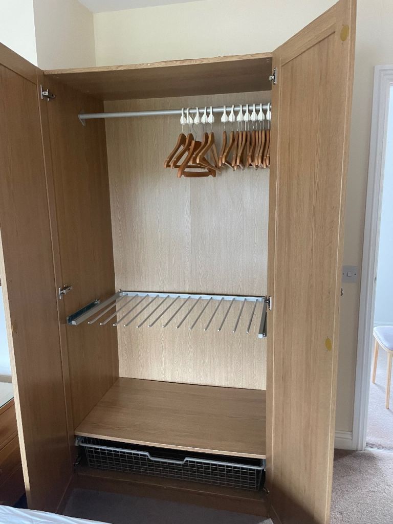 These are Ikea oak effect wardrobes so can be dismantled and flat packed for transport. The double wardrobe is 100cm wide x 60cm deep x 202cm high and has hanging rails and integral coat hangers. The lower section has trouser racking with a base and a wire basket under. The single wardrobe is 50cm wide x 60cm deep x 202cm high and has a rail with integral coat hangers and two lower shelves. Note - only the integral coathangers are included. The wardrobes can be attached to each other to form a larger unit and the single wardrobe does have screw holes where this has been done.