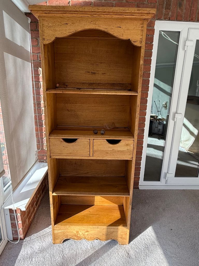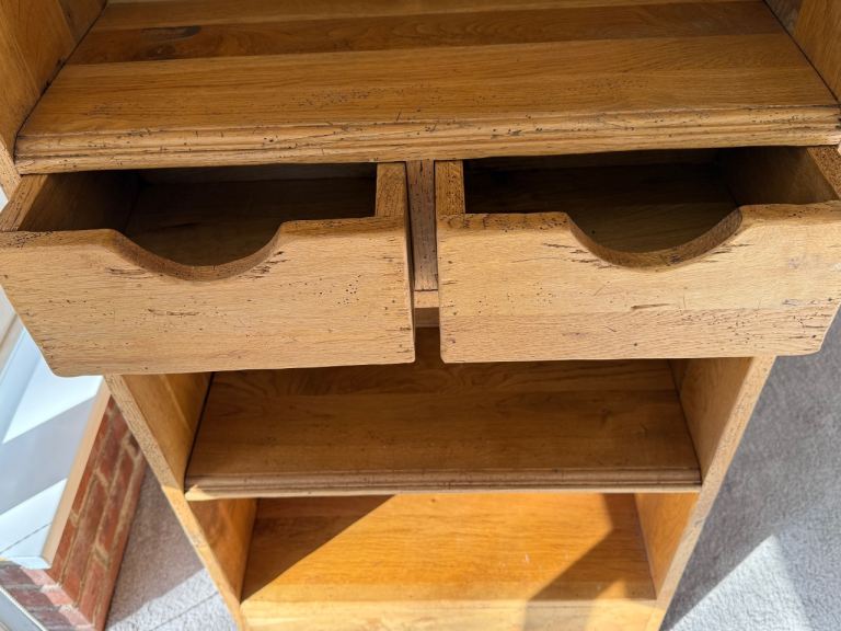French style solid oak dresser with fixed shelving and two small drawers. Unit is one fixed piece with non-adjustable shelving. Can be used with or without drawers. Brass decorative drawer knobs if required. Unit was bought new by us several years ago and originally was made to look antique and rustic.