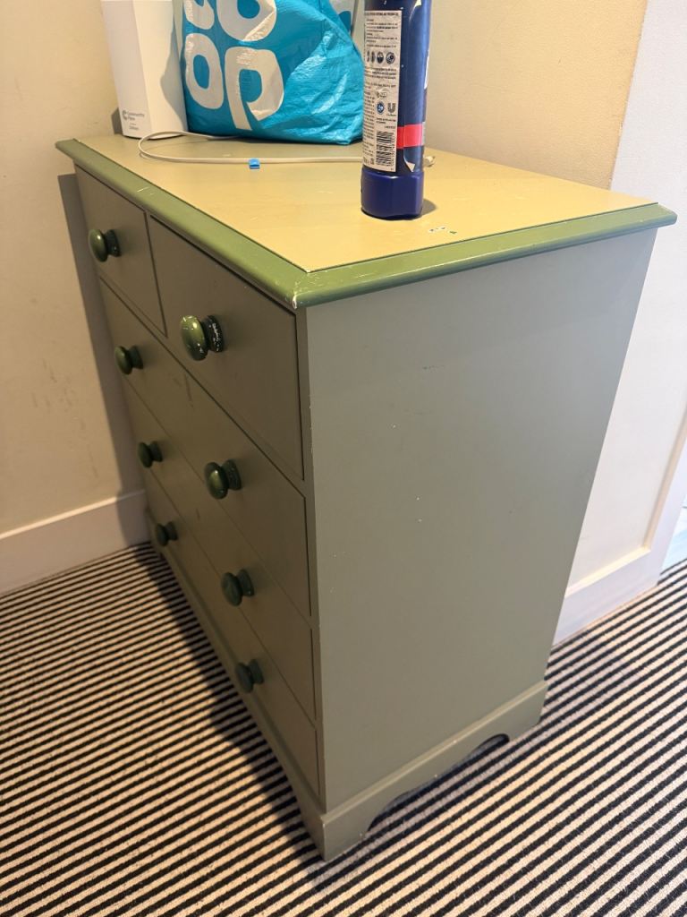 Sturdy and heavy green chest of drawers, perfect for a child’s room or nursery.