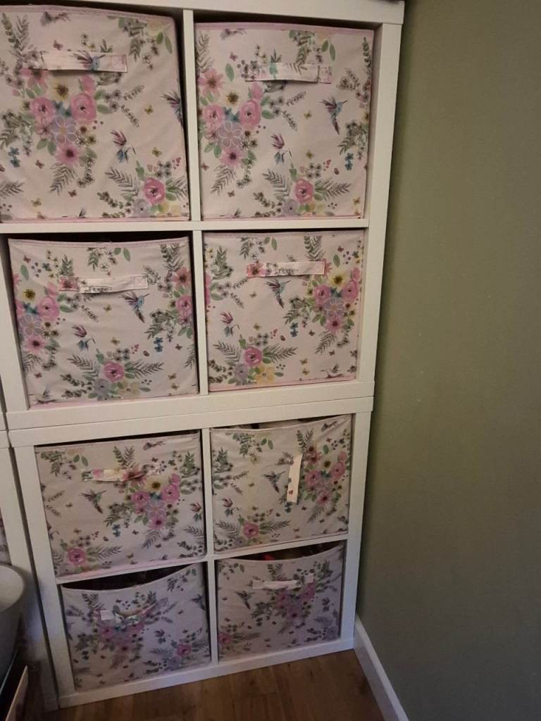 Two white cube storage units, with 4 sections in each. IKEA Kallax. Each section is 13 inches square, 15 inches deep. Each unit is 30 x 30 inches. Drawers not included. Collection only.