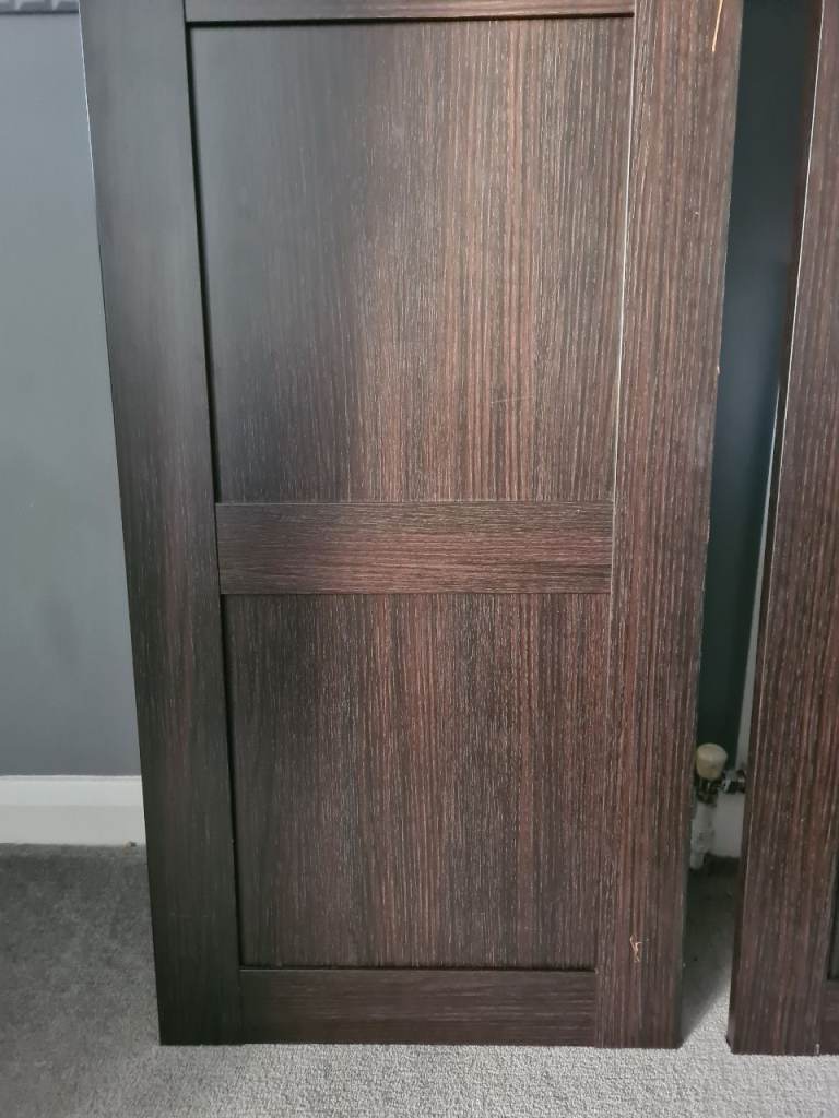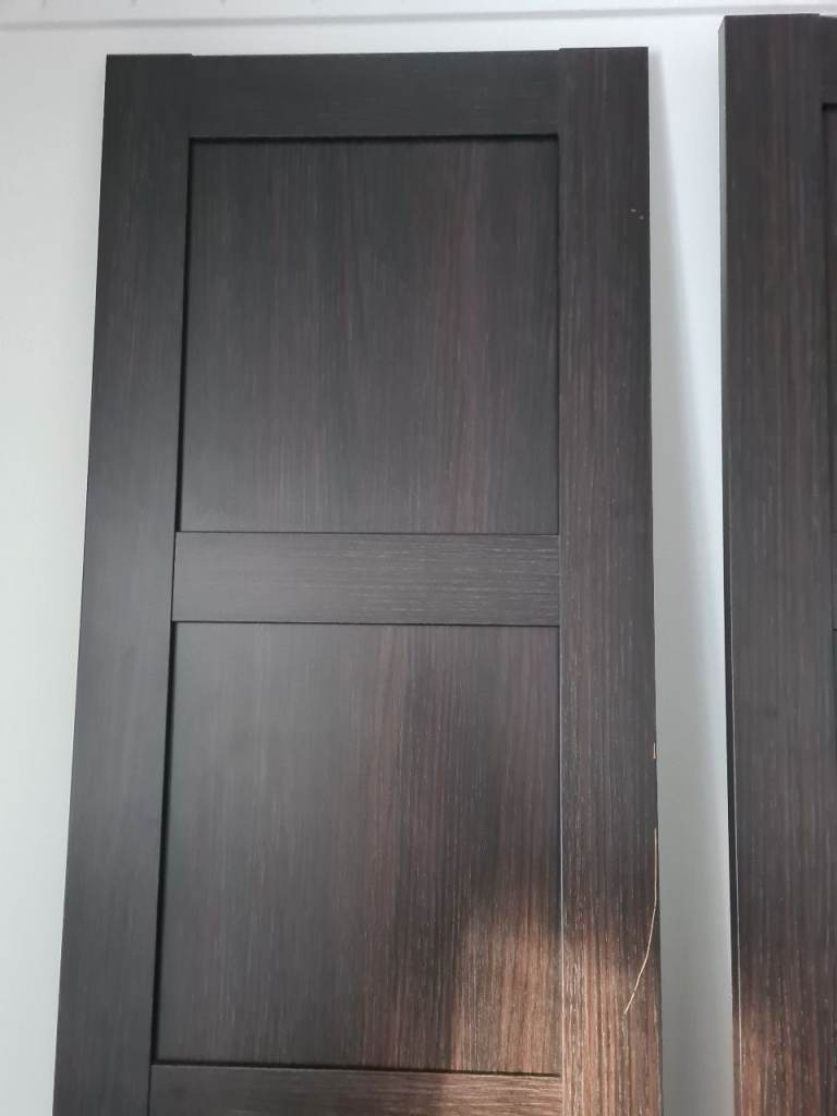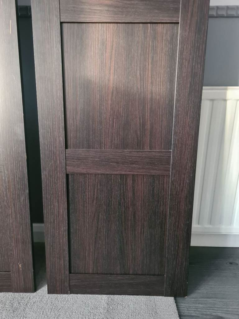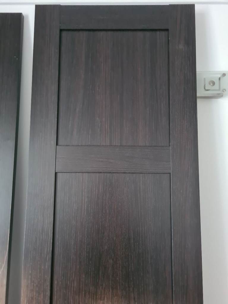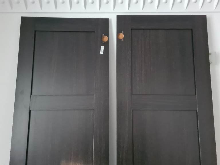 I have two Bergsbo doors in dark brown left over from my project. One of the doors is scratched (please see pictures for more details) but that can be easily sanded down and painted over if desired.