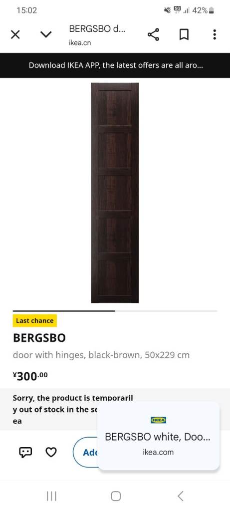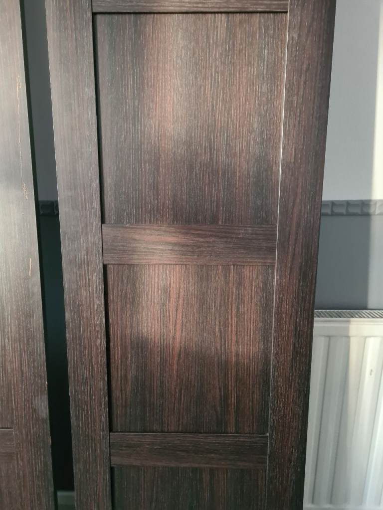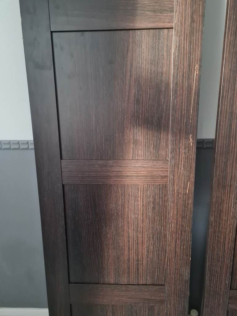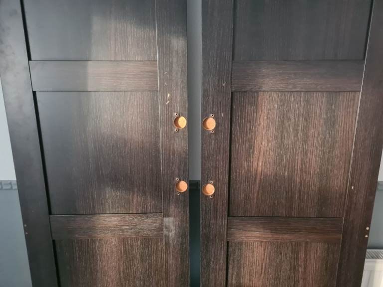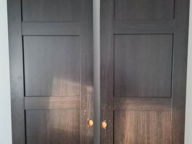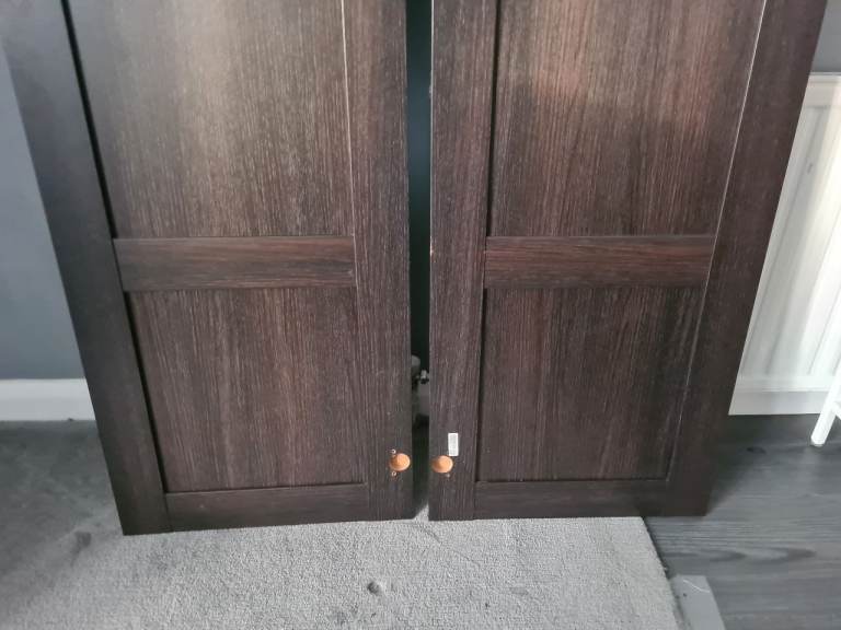 I have two Bergsbo doors in dark brown left over from my project. One of the doors is scratched (please see pictures for more details) but that can be easily sanded down and painted over if desired.