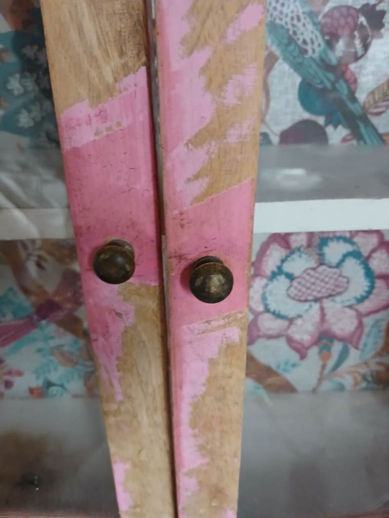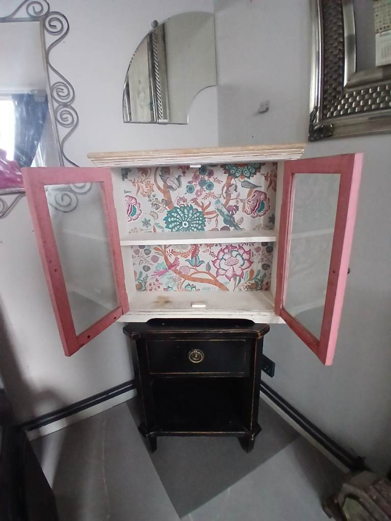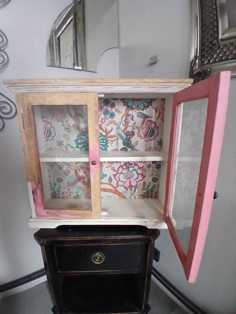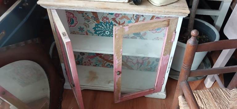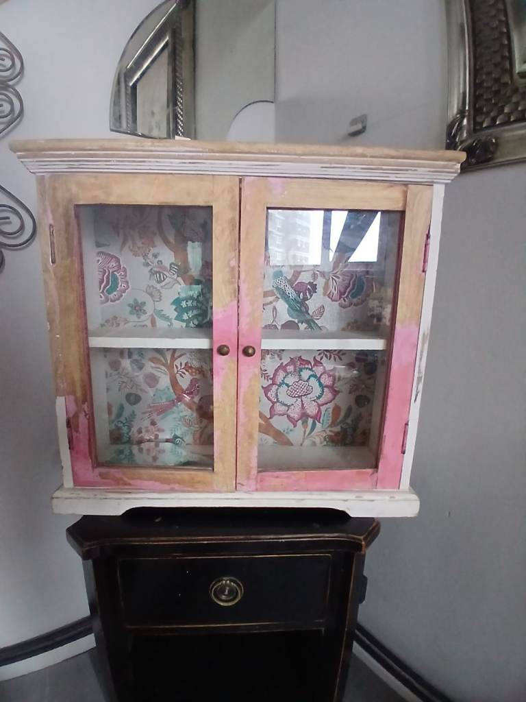 56x60x18 Beautiful Vintage early to mid-century distressed glazed display/bathroom/hallway cabinet with papered inside and original handles.