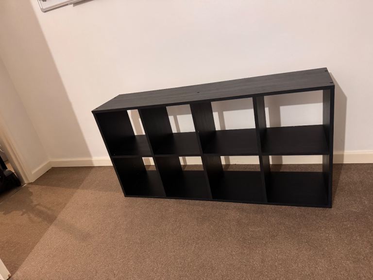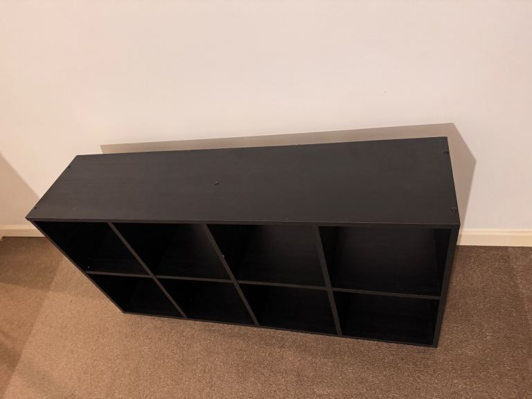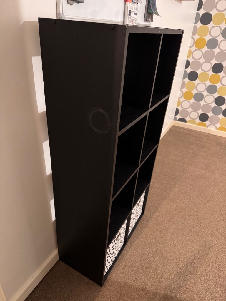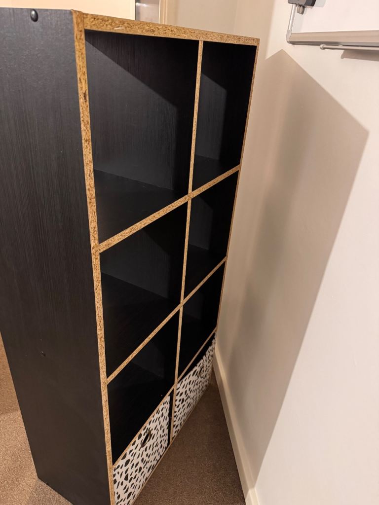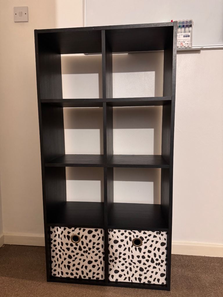 Black storage unit with two storage boxes, excellent condition barring a small ring from a cup which could go against the wall or underneath. The unit can be used either way, laid down or stood tall and there are two boxes that are white with black marks that are also in great condition and clean inside. Collection only. Thank you.