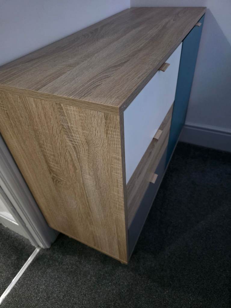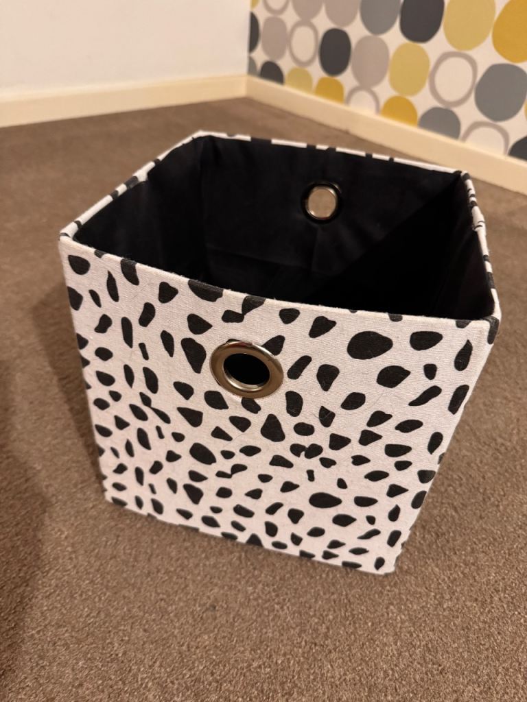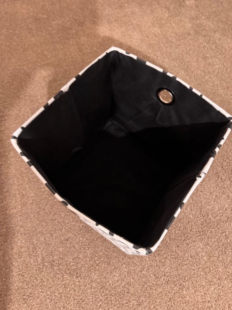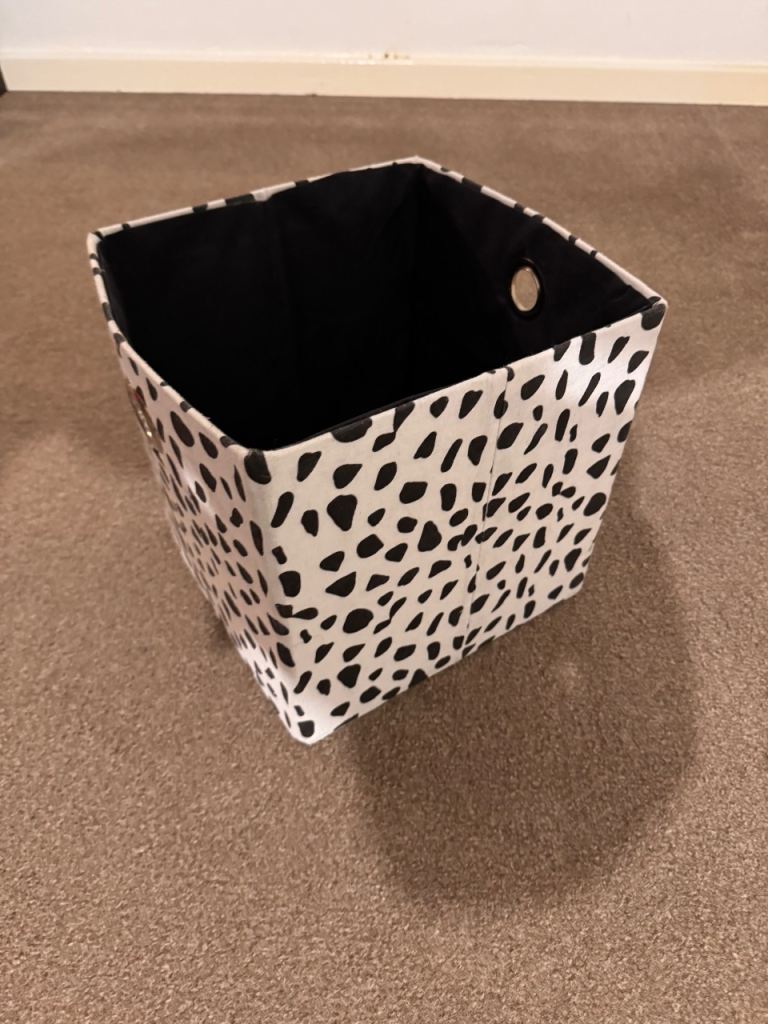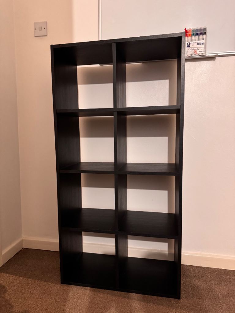 Black storage unit with two storage boxes, excellent condition barring a small ring from a cup which could go against the wall or underneath. The unit can be used either way, laid down or stood tall and there are two boxes that are white with black marks that are also in great condition and clean inside. Collection only. Thank you.