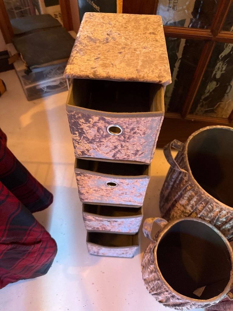 Set of 5 velvet items were all used but no longer needed. Signs of wear but still life left in them. I used for clothes and shoes storage but great for kids toys. Collection only.