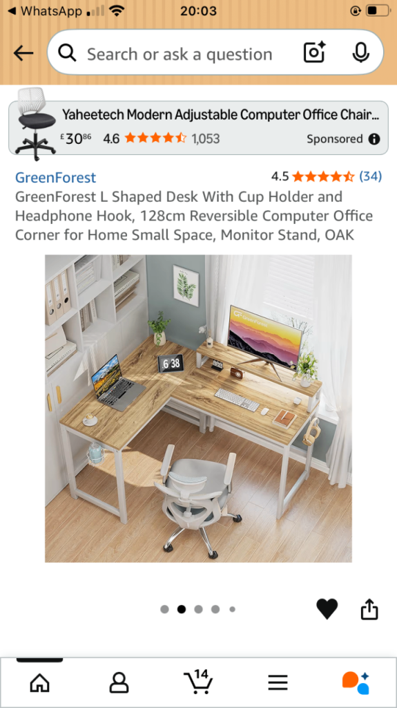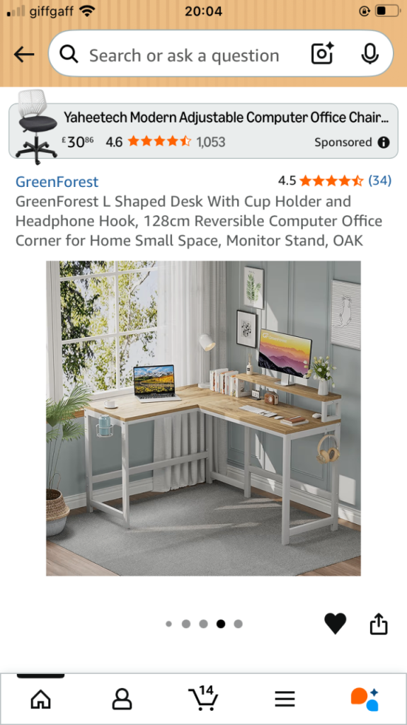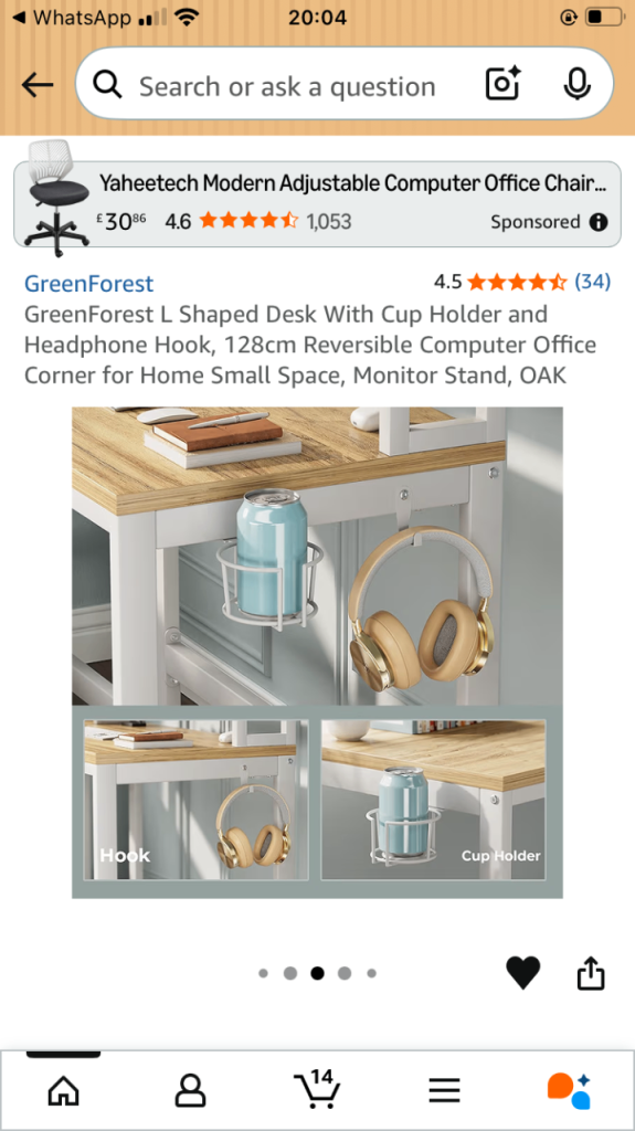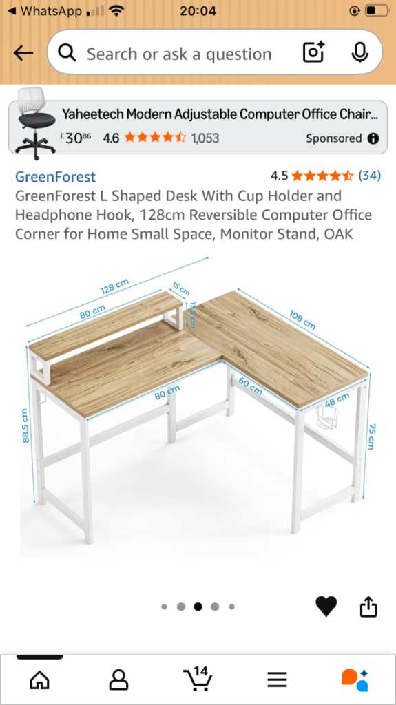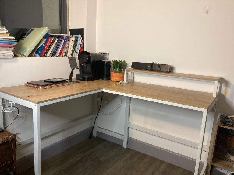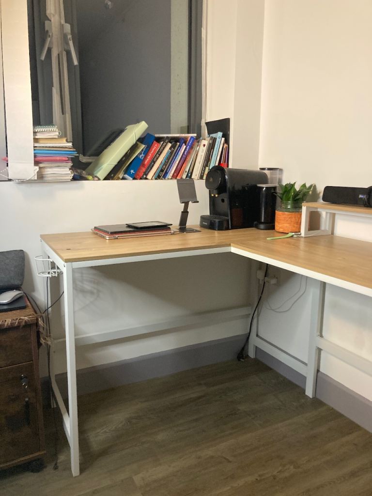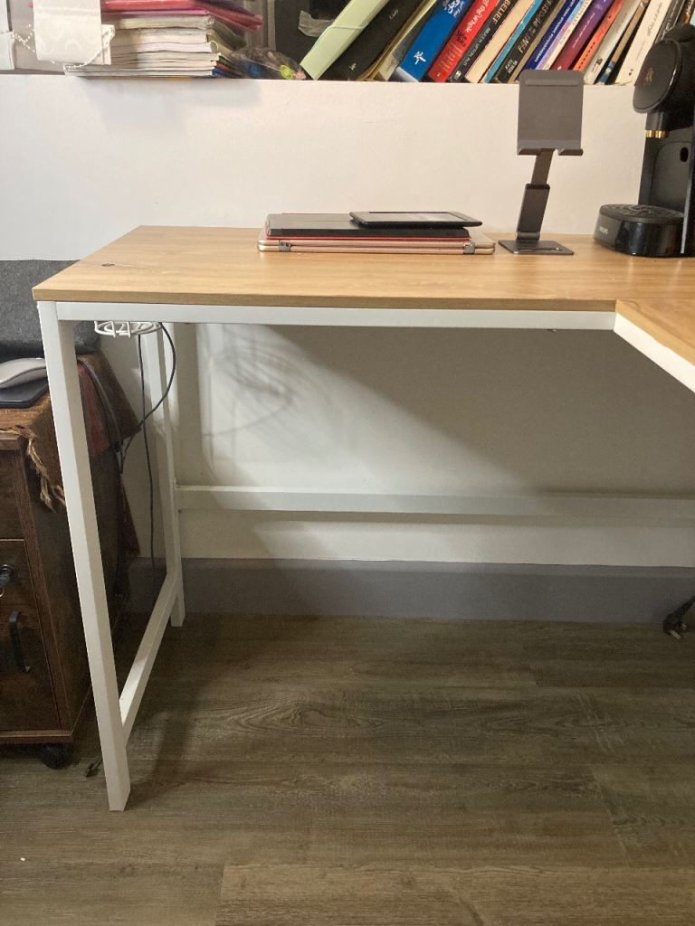 128cm reversible corner desk, perfect for small spaces. Comes with a built-in cup holder, headphone hook, and monitor stand.