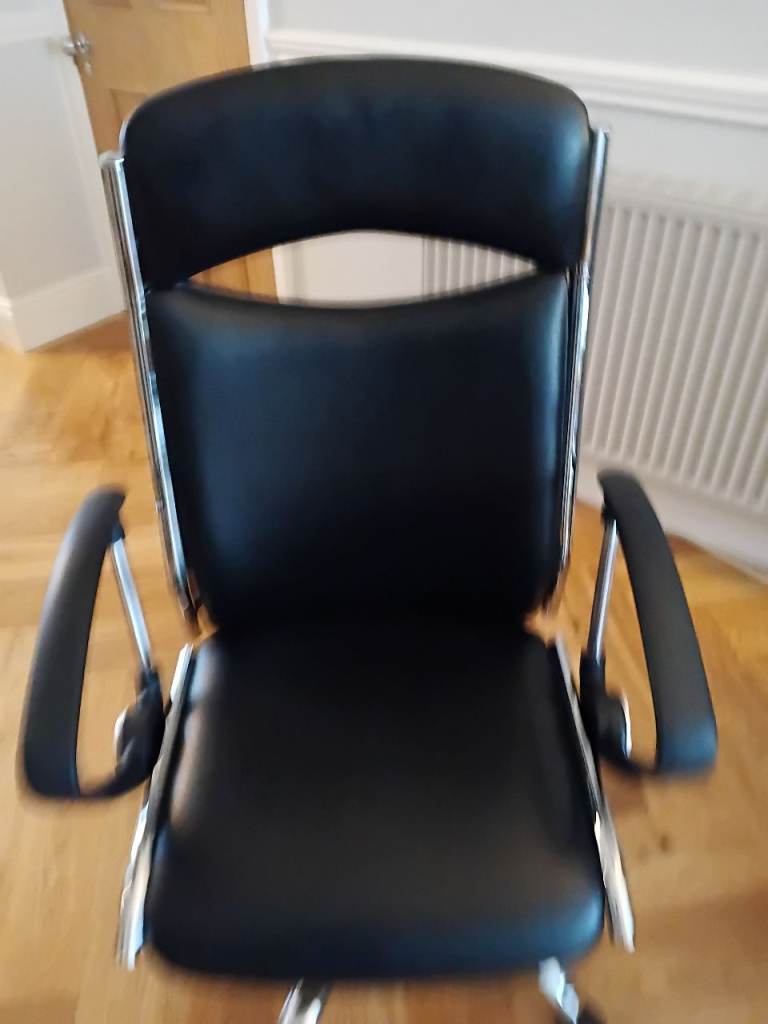 Black Leather upholstery, with high back.