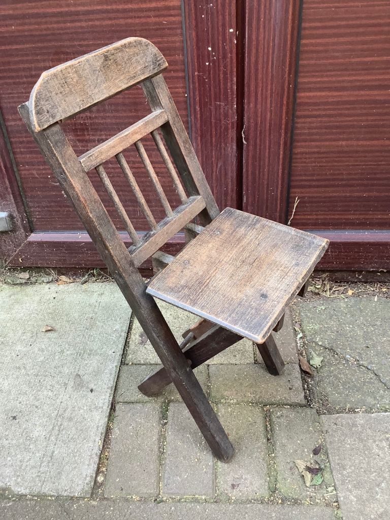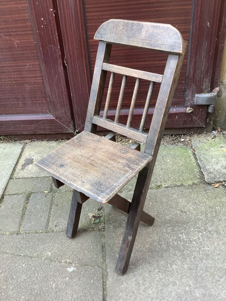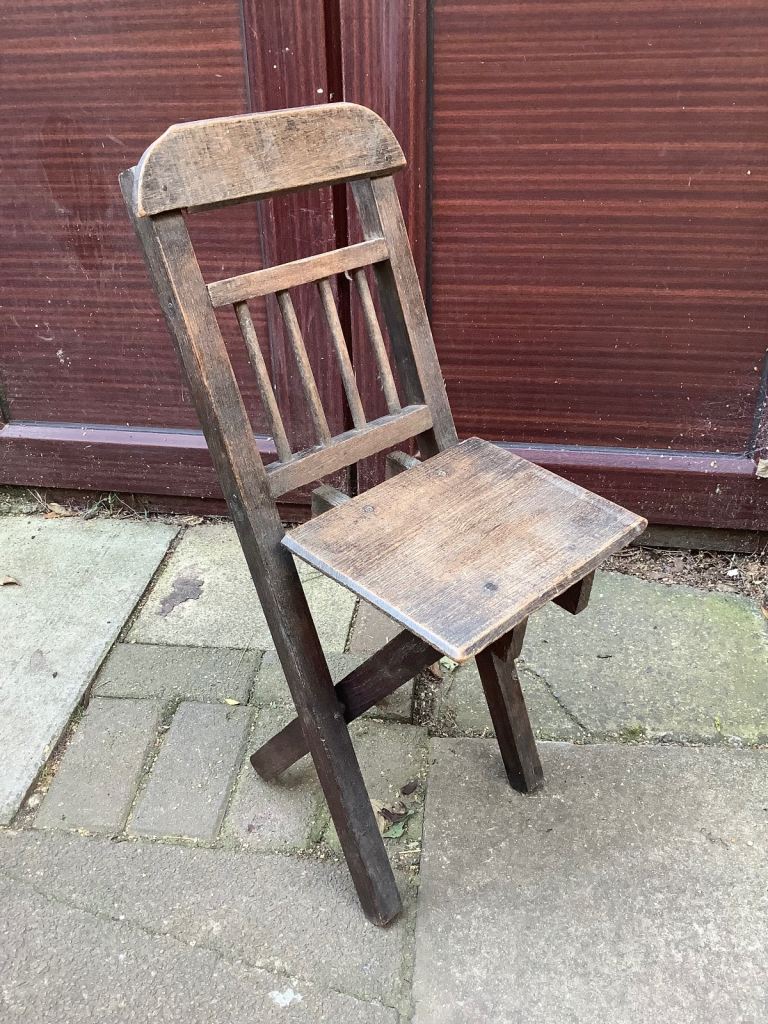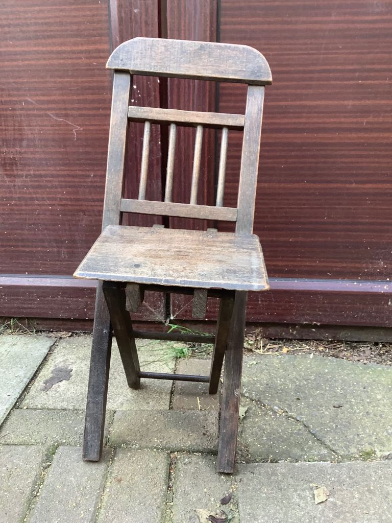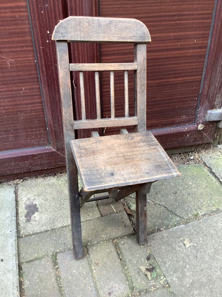 Ash & elm folding stick back, Windsor child’s chair. It’s been waxed. Would look nice in any room and the chair is very sturdy. Size 25.5cm length, 20cm width, 32cm back head rest by 67.5cm high. Collection only