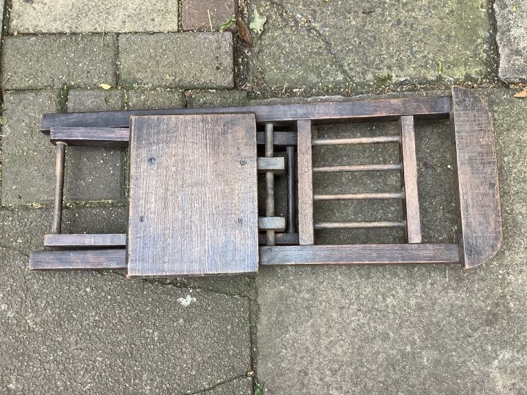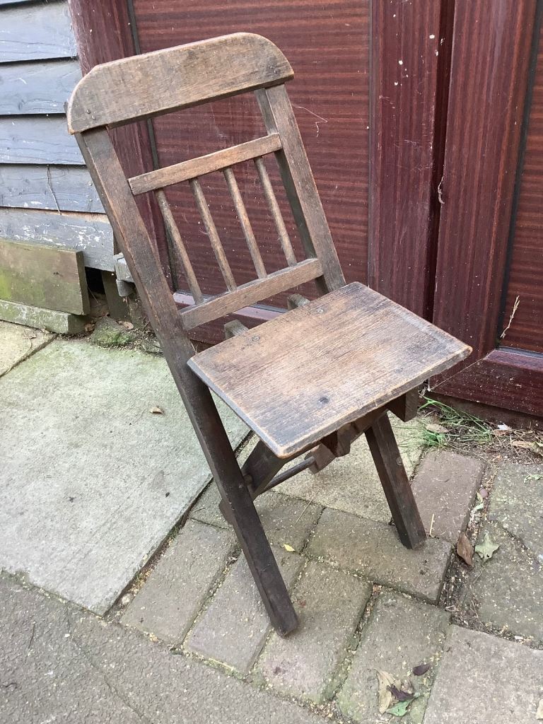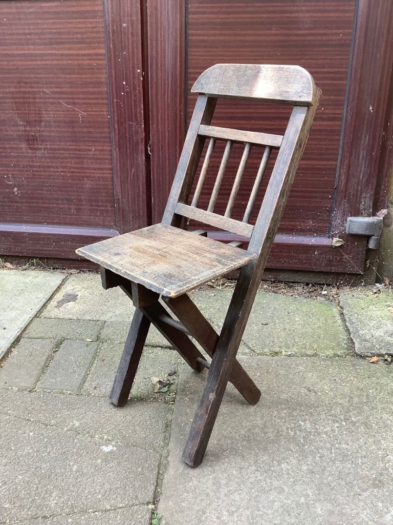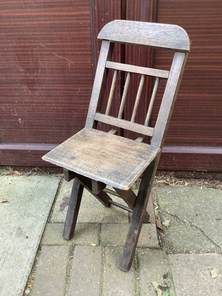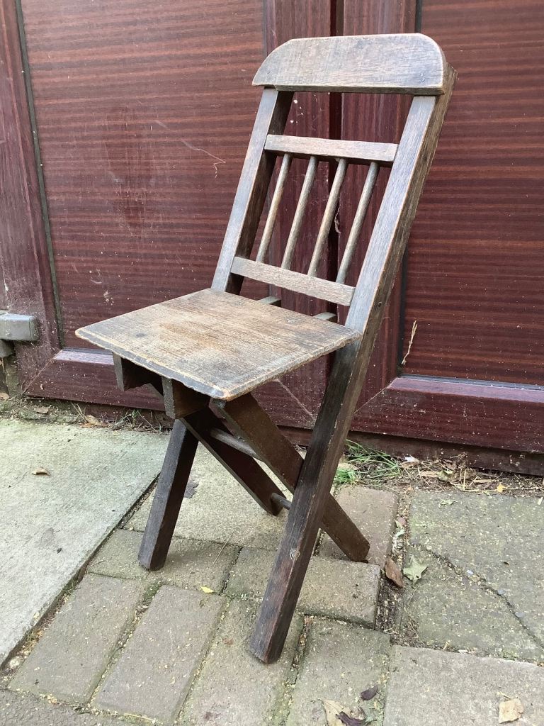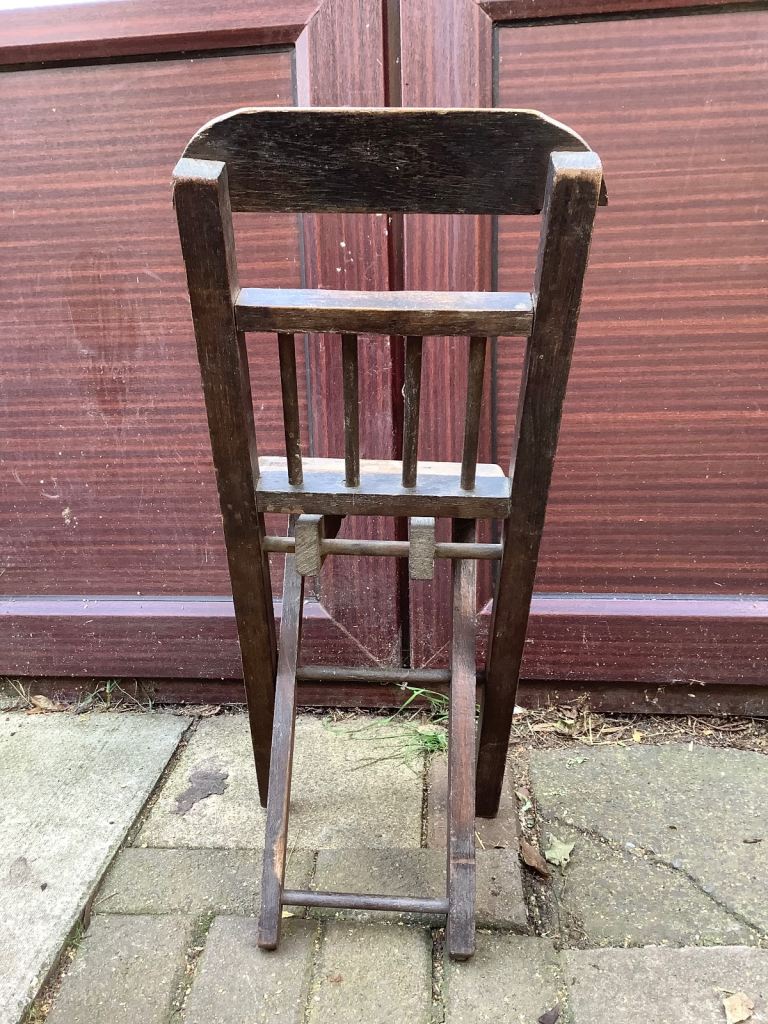 Ash & elm folding stick back, Windsor child’s chair. It’s been waxed. Would look nice in any room and the chair is very sturdy. Size 25.5cm length, 20cm width, 32cm back head rest by 67.5cm high. Collection only