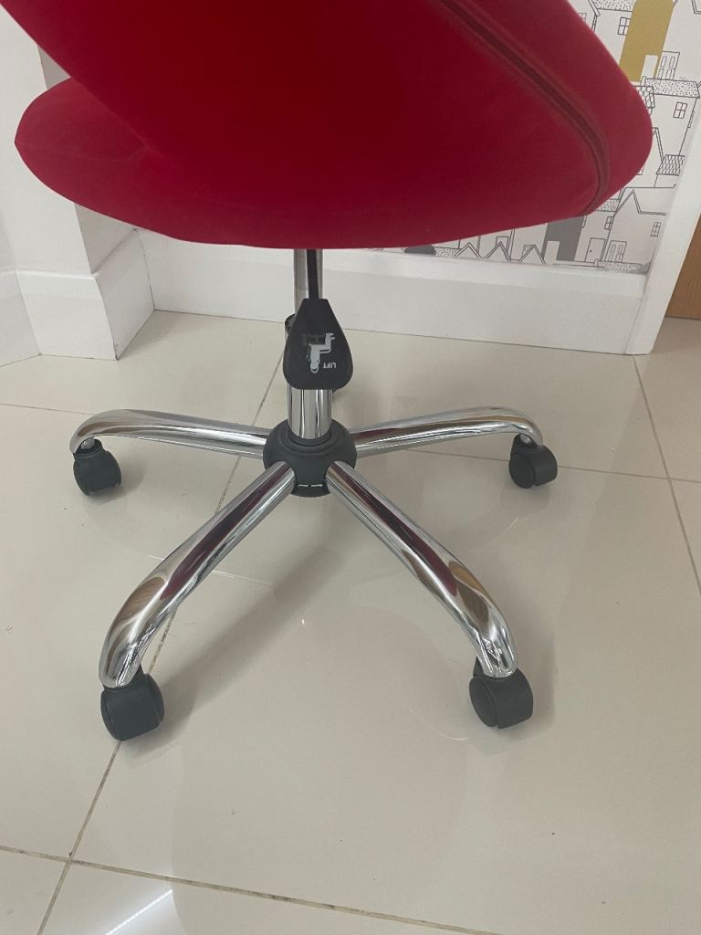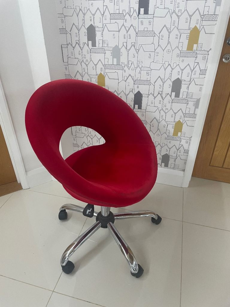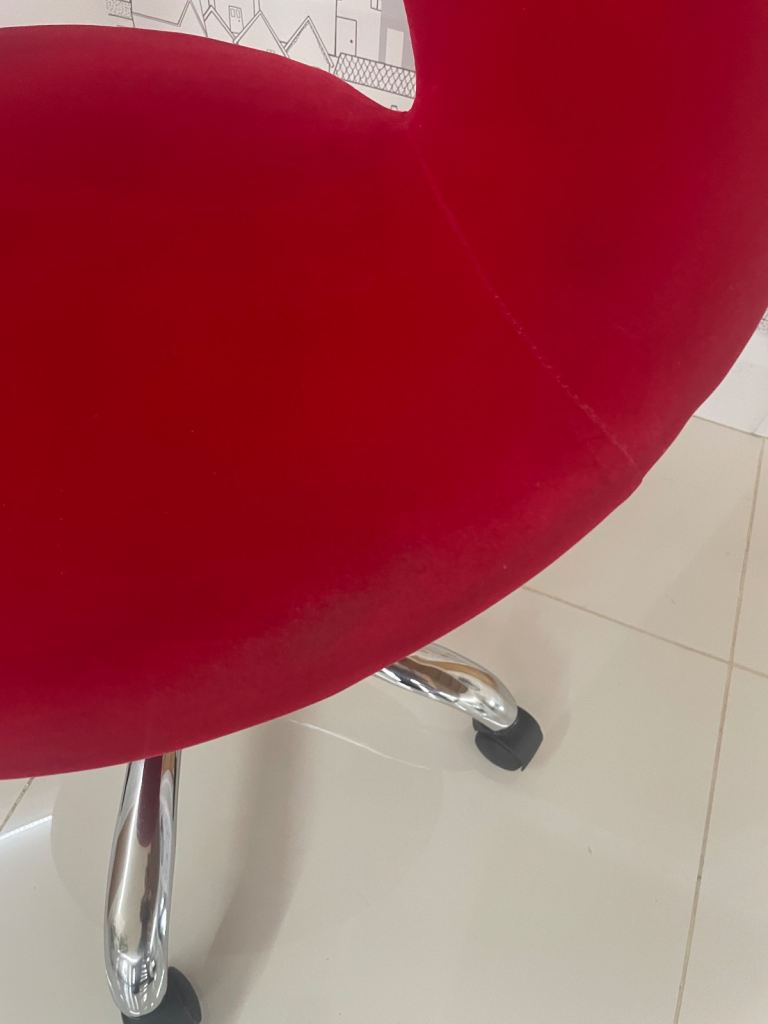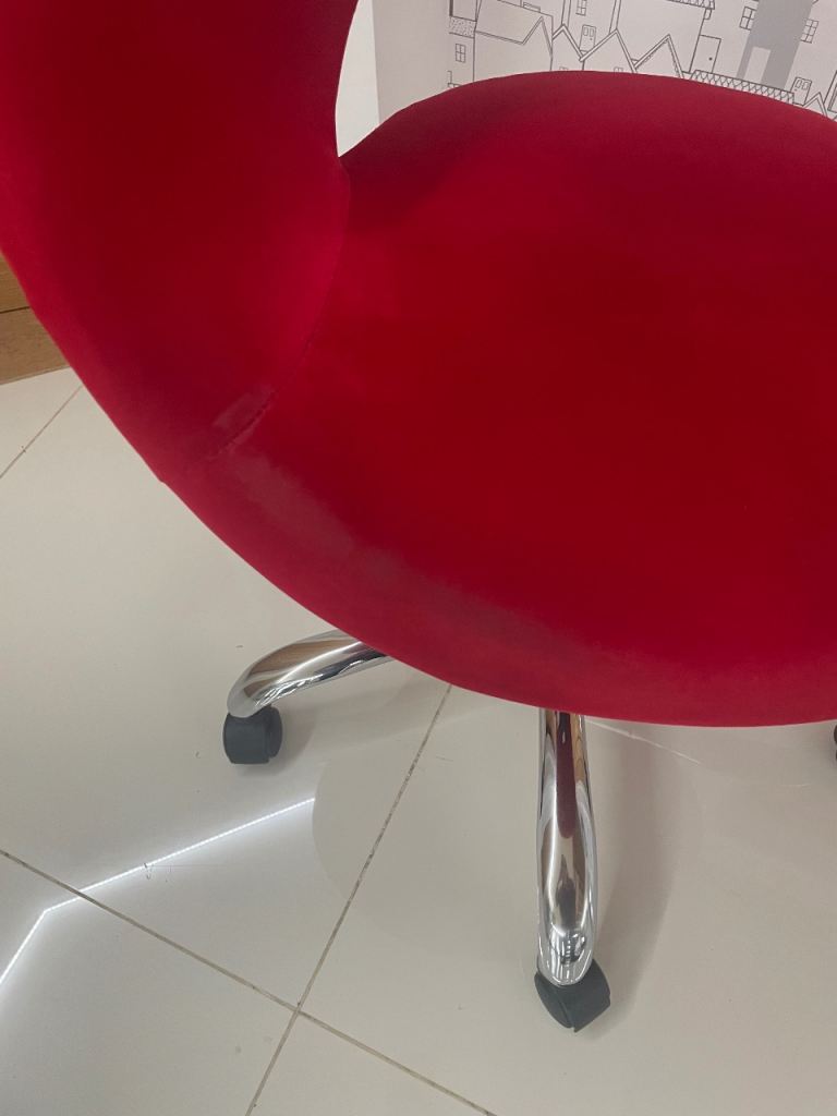 Red velvet chair with a chrome swivel base. The front part of the seat is showing signs of wear otherwise in very good condition. Cash only