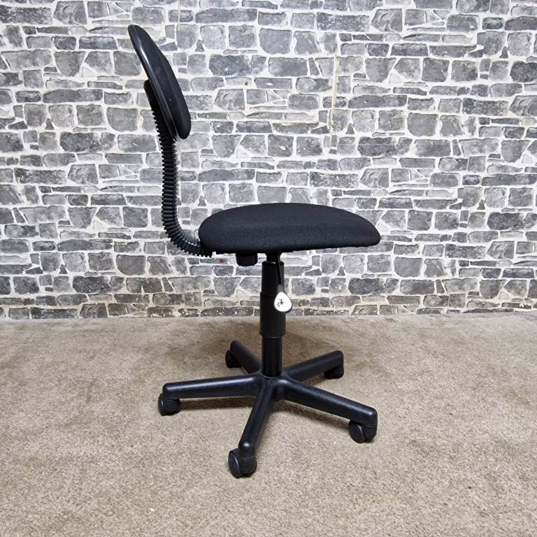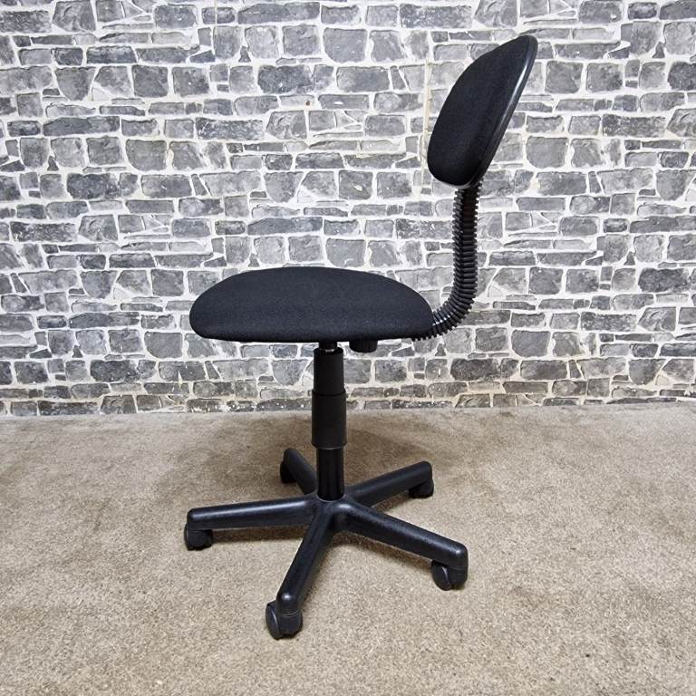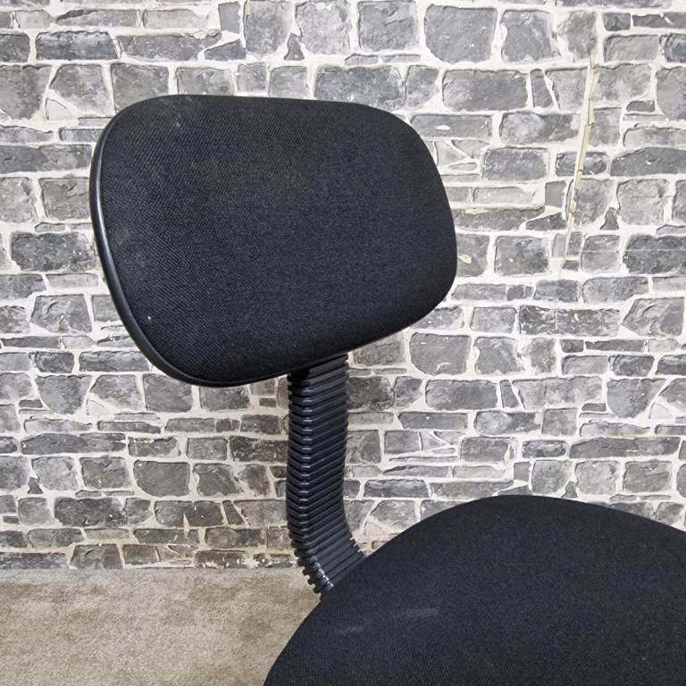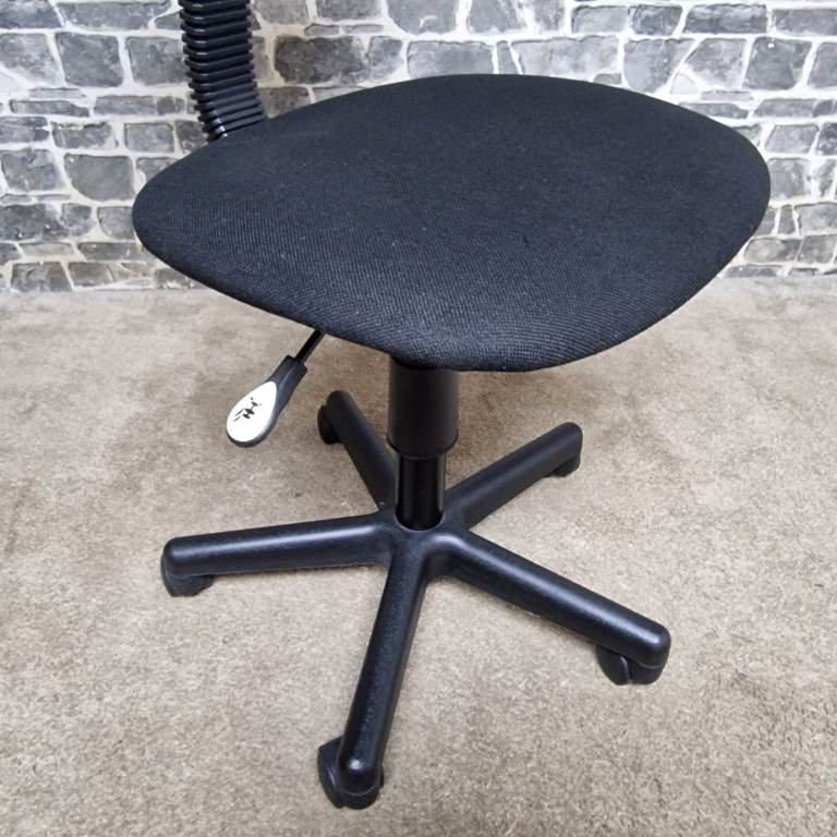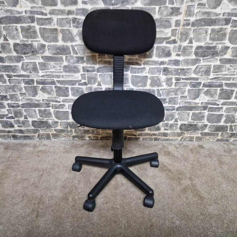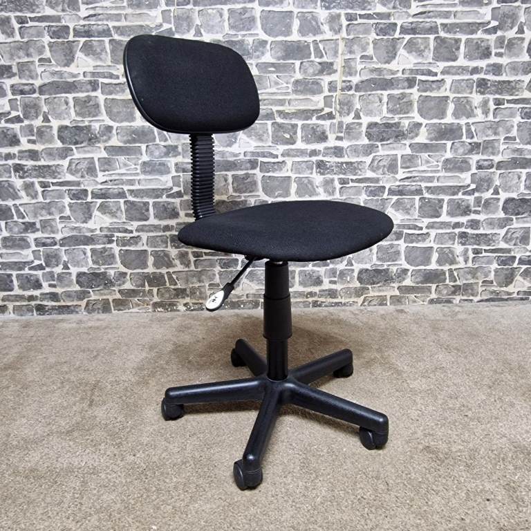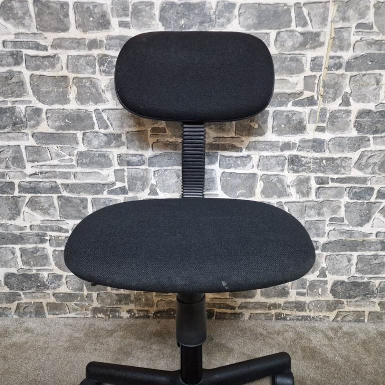 Compact height adjustable office chair featuring a comfortable padded seat and backrest with a simple, practical design. The chair swivels smoothly and includes an easy-to-use height adjustment lever, making it ideal for desks, home offices, study areas, or workshops. Mounted on a stable five-star base with castors for easy movement. The compact size makes it perfect for smaller spaces while still providing good support. In good condition with normal signs of use, fully functional and ready for use.