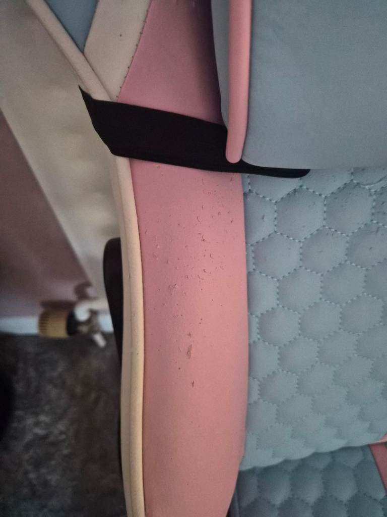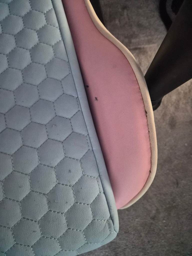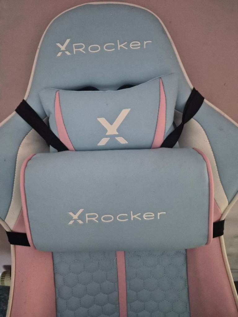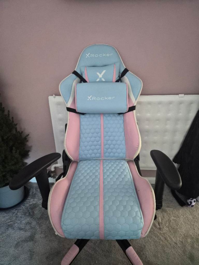 Pink and blue x-rocker gaming chair.