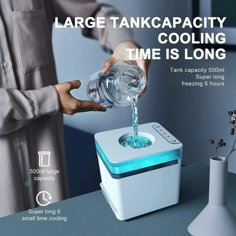 QUICK COOLING & EASY TO USE: Just fill the water tank and plug in the USB cable to power on, then start using, ice cube or essential oil into the water tank, and connect it to the USB, then press the button. A large leak-proof designed water tank lengthens its humidify time, water and ice will help quick cooling. It is better to freeze the filter in the refrigerator after soaking.