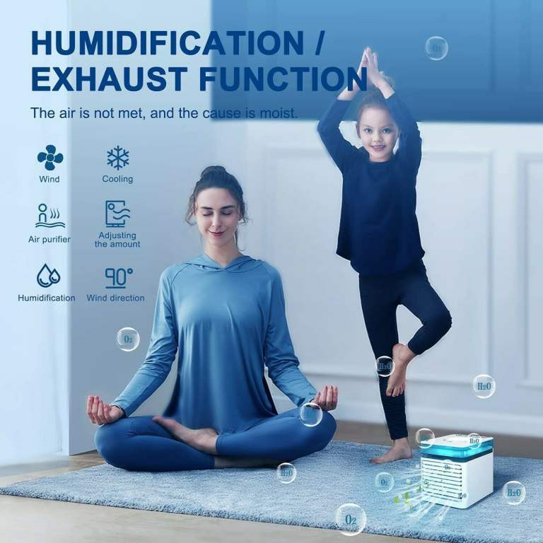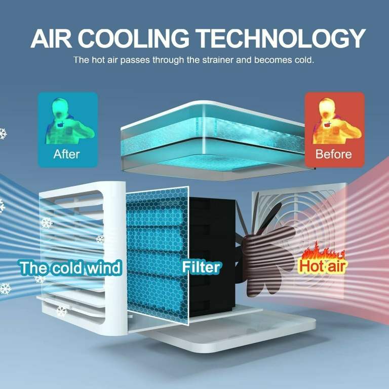 COMPACT & WIDELY APPLICATION: The Air Cooler is portable and compact. It can be placed on the table, desk, or kitchen. Perfect for home, office, bedroom, baby room, car, travel, camping, etc. It is a great space saver and easy to set up. This Portable Air Conditioner is ideal for improving the quality of life which is a good gift for your family and friends.