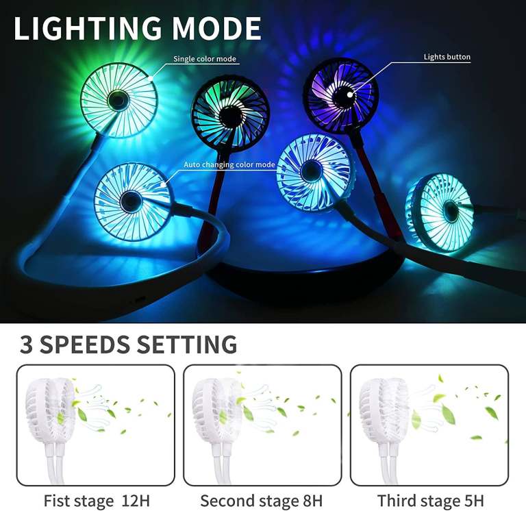 7 COLOURED LED LIGHT & SMALL SIZE: The rechargeable Portable Fan has 7 different colors of LED lights. You only need to press the LED button on the front of the wearable fan and the LED lights will automatically switch to different colors. It is very cool, especially at night or in dark places. Small,light and weighs 260grams which can be carried everywhere,so even if you wear this fan for a long time, you won’t feel uncomfortable