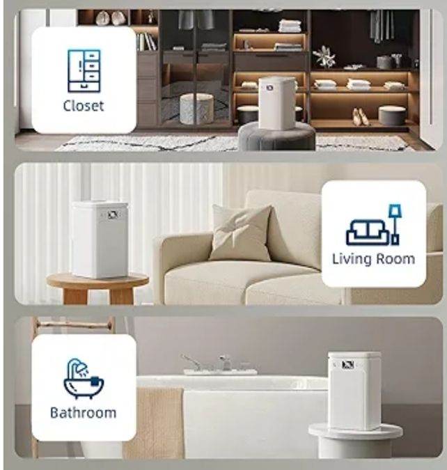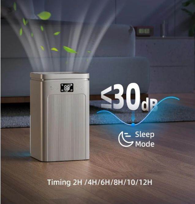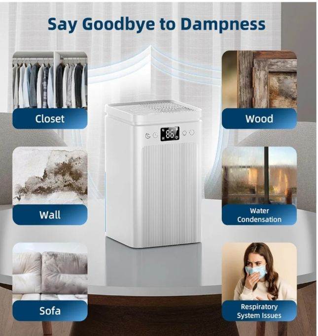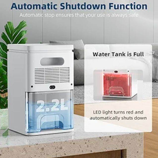 Keep your home fresh and comfortable with this 2200ML powerful dehumidifier. Designed for bedrooms, bathrooms, and laundry areas, it effectively removes excess moisture to prevent mold and dampness. Enjoy ultra-quiet operation, auto shut-off when the tank is full, and smart defrost technology for year-round efficiency. The soothing 7-color night light adds a relaxing touch, while its compact, portable design fits perfectly in any room. Ideal for improving air quality and speeding up clothes drying!