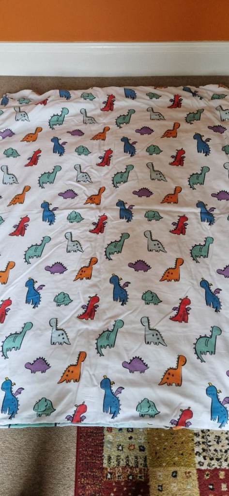 Measuring approximately 56 inch by 44 inch the quilt and cover are in excellent condition with a design of dinosaurs. Made from polyester cotton fabric.