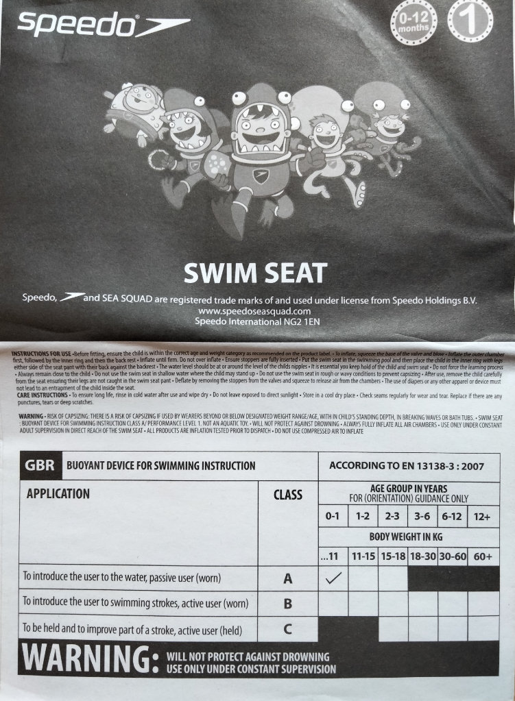 1x Speedo Sea Squad Swim Seat for 0-12 Months (11 kgs),